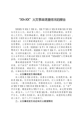 XX•XX火灾事故调查情况的报告XXXX年XX月XX日,XX市XX区XX街道路XX号XX住宅发生火灾,造成X人死亡。为及时查明事故原因,追究有关人员责任,吸取事故教训,根据《中华人民共和国消防法》、国务院《消防安全责任制实施办法》《XX省消防安全责任制实施办法》《火灾事故调查规定》(公安部令第XXX号)、应急管理部、公安部印发的《消防救援机构与公安机关火灾调查协作规定》(应急〔XXXX〕X号)和《XX省火灾事故调查处理规定》等法律法规,XXXX年XX月XX日,由区应急管理局、区消防救援大队、区公安分局、区住房和城乡建设局、区总工会等有关人员组成的XX区XX街道XX•XX火灾事故调查组,对该起事故开展调查。事故调查组按照科学严谨、依法依规、实事求是、注重实效、四不放过的原则和尽职免责,失职问责的要求,通过现场勘查、调查询问、综合分析,查明了事故的经过和原因,对事故性质和责任进行了认定,现将有关情况报告如下:一、火灾事故发生场所概况起火建筑为XX自建房,房屋坐北朝南,北侧是空地,南侧是XX路,东西侧同其他居民房相邻,过火房屋其中一栋为木结构,一栋为砖混结构,两栋建筑均为一层建筑,位于XX省XX市XX区XX街道XX路XX号。木结构房屋,呈田字形布置,建筑面积为XX平方米,东西长X米,南北宽X.XX米,高X米,入户门位于南面XX路。砖混结构房屋面积XX平方米,东西长X.XX米,南北宽XX.XX米。砖混结构从西侧进入客厅,客厅入户门为卷帘门。二、火灾事故发生经过和灭火救援情况(一)发生火灾的经过。通过调取监控和询问走访情况了解,XXXX年XX月XX日X时XX分许,XX同儿子XX离开家外出上班,X时XX分许火灾发生,由于火灾发生在凌晨,X时XX分许有过路人员在起火房屋前停留,X时许第二次有过路人员在起火房屋前停留,但都未第一时间报警。X时XX分许XX在出租屋内听到异响后打开窗户看到房屋起火,大火已经烧穿屋顶,后遂才报警,发现火灾时火势已经扩大。(二)灭火救援情况。XXXX年XX月XX日X时XX分,环城北路消防站接到XX市消防救援支队指挥中心调度称:位于XX市XX区XX街道XX路一民房起火。X时XX分,环城北路消防站出动X车XX人前往处置,X时XX分,消防站到达现场。现场火势处于猛烈阶段,起火房屋距离主干道路较远,消防指战员通过沿道路铺设水带方式展开灭火救援行动,X时XX分出水灭火,在灭火救援过程中围观群众反馈可能有人员被困。X时XX分,环城北路消防站出动X车X人增援,大队值班人员X车X人遂行出动。X时XX分许救援人员发现一具疑似烧焦尸体,X时X分现场火势被控制,X时XX分,现场明火扑灭,经现场多次清理后,此次火灾造成X人死亡。三、火灾事故造成的人员伤亡和直接经济损失(一)死亡人员基本情况。XX,性别:男,身份证号:XXXXXXXXXXXXXXXXXX,户籍所在地:XX省XX市XX区惠权路XX号,户主。(二)直接经济损失情况此次火灾共造成X户居民受灾,过火面积XXX平方米,直接经济损失贰拾伍万元整(¥:XXXXXX.XX)。四、火灾事故的起火原因、灾害成因和性质(一)起火原因。经调查走访、现场痕迹勘查、视频分析及物证送检,综合分析认定如下:认定起火时间为XXXX年XX月XX日X时XX分许。认定起火部位位于XX木结构建筑文可居文库——海量学习资料,手机电脑均可下载www.wenkeju.com卧室。认定起火点为卧室距东墙X.X米,距南面隔断X.X米处。认定起火原因为木结构房屋卧室电气线路故障引燃周围可燃物导致。(二)灾害成因。一是房屋内堆放大量可燃易燃物品火灾荷载大;二是房屋内电气线路私拉乱接,使用时间长未定期检查更换;三是自建房排查整治不到位;四是火灾发生后周围人员未能第一时间报警处置,造成火势蔓延扩大。(三)事故性质。调查认定,XX市XX区XX街道XX•XX火灾事故,是一起非生产安全火灾事故。五、火灾事故责任的认定以及对责任单位、责任人员的处理建议(一)延伸调查及责任认定情况X.经走访调查,查阅XX区XX街道办事处相关资料。XX区XX街道办事处在《关于调整领导班子成员分工通知》(XX党工委通〔XXXX〕XX号,XX党工委通〔XXXX〕XX号、XX号、XX号)中明确,街道办副主任XX分管消防安全工作。街道办党工委委员、人大常委会主任XX同志包靠双井社区工作,因XX同志借用到市妇联工作,自XXXX年X月以来该同志负责工作由党工委副书记、统战委员XX代管。查阅X月XX日会议记录,XX结合《XX市XX区消防安全六查行动方案》安排部署街道办六查工作,X月XX日有自建房排查部署的会议记录。街道办对消防工作有部署、有安排、有记录。查阅双井社区相关资料,社区支部书记XX负责全面工作,XX分管社区消防安全排查工作