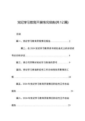 党纪学习教育开展情况报告(共12篇)目录篇一、党纪学习教育开展情况报告.2篇二、在2024党纪学习教育读书班结业式上的讲话读书班总结讲话..4篇三、某公司开展好党纪学习教育的思考.9篇四、党纪学习教育阶段性工作总结报告开展情况汇报………………………………………………………………18篇五、2024年党纪学习教育开展情况阶段性工作总结报告………………………………………………………………20篇六、2024年党纪学习教育开展情况阶段性工作总结报告23篇七、党纪学习教育读书班总结讲话.25篇八、2024年党纪学习教育读书班总结讲话28篇九、2024年党纪学习教育阶段性工作总结31篇十、党纪学习教育阶段性工作总结报告开展情况汇报………………………………………………………………34篇十一、2024年开展党纪学习教育情况的总结报告36篇十二、2024年在党纪学习教育读书班结业式上的主持词及总结讲话………………………………………………40文可居文库——海量学习资料,手机电脑均可下载www.wenkeju.com篇一、党纪学习教育开展情况报告为了加强党员干部的纪律教育和党性锻炼,我单位积极组织开展党纪学习教育活动。本报告旨在总结学习教育活动的开展情况,分析存在的问题,并提出改进措施,以便更好地推进党纪学习教育工作。一、学习教育活动开展情况(一)学习内容与安排本次学习教育活动主要围绕《中国共产党章程》、《中国共产党纪律处分条例》等党内法规进行,同时结合党的历史、优良传统和当前形势任务,制定了详细的学习计划。学习活动采取集中学习与个人自学相结合的方式,每周至少组织一次集中学习,并通过线上学习平台提供丰富的学习资源。(二)参与情况与反响党员干部普遍参与学习的积极性较高,出勤率较高。在集中学习过程中,大家认真听讲、积极发言,对学习内容进行了深入讨论和交流。个人自学方面,党员干部能够按照学习计划自觉完成学习任务,并通过学习平台提交学习心得和体会。通过学习教育活动,党员干部对党的纪律要求有了更加全面、深入的认识,纪律意识和规矩意识得到了明显增强。大家纷纷表示,要将学习成果转化为工作动力,以更加饱满文可居文库——海量学习资料,手机电脑均可下载www.wenkeju.com的热情和更加扎实的工作作风,推动各项工作再上新台阶。二、存在的问题与不足虽然学习教育活动取得了一定的成效,但也存在一些问题和不足。(一)部分党员干部学习态度不够端正,存在应付了事的现象,学习效果不够理想。(二)学习形式和内容较为单一,缺乏创新性和针对性,难以满足不同党员干部的学习需求。(三)学习效果评估和整改措施落实不到位,对部分党员干部的学习情况缺乏有效的监督和激励。三、改进措施与建议针对存在的问题和不足,提出以下改进措施和建议。(一)加强思想教育,提高党员干部对学习教育活动重要性的认识,引导其树立正确的学习态度。(二)创新学习形式和内容,采用多种形式的学习活动,如案例分析、模拟演练等,提高学习的趣味性和实效性。(三)加强学习效果评估和整改措施的落实,建立健全评估机制,对党员干部的学习情况进行定期检查和考核,确保学习成果得到有效转化和应用。党纪学习教育是加强党员干部纪律教育和党性锻炼的重要途径。我单位将继续深入开展学习教育活动,不断完善学习机制和内容,提高学习效果和质量,为推进党的建设和事业发展提供坚强纪律保障。同时,也希望上级党组织能够文可居文库——海量学习资料,手机电脑均可下载www.wenkeju.com给予更多的指导和支持,共同推动党纪学习教育工作取得更大的成效。篇二、在2024党纪学习教育读书班结业式上的讲话读书班总结讲话同志们:本次党纪学习教育读书班到今天就要告一个段落了,首先,我对全体学员圆满完成培训任务表示热烈祝贺!对为本次读书班成功举办做了大量工作的工作人员们表示最诚挚的谢意!刚刚我听了几位同志的发言,包括在外出考察学习和分组讨论期间与大家之间的交流,能体会到大家都有很多感触、感悟和感动,都感受到这次读书班效果很好,举办这次党纪学习教育读书班,具有特殊而深远的意义,充分体现了县委居安思危的忧患意识和刮骨疗毒的勇气决心,充分体现了县委坚定贯彻落实中央、省委和市委决策部署的决心和一心向党、一以贯之的政治定力,充分体现了县委在政治上对全县干部的关心、在思想上对全县干部的警醒、在纪律上对全县干部的严要求。下面,我提四点希望,与大家共勉。一、坚定信念,做靠得住的人理想信念是共产党人精神上的