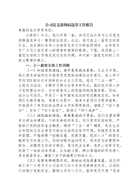 公司党支部换届选举工作报告尊敬的各位党员同志:大家好!今天,我们齐聚一堂,共同见证并参与公司党支部换届选举这一重要政治活动。在此,我代表上一届党支部委员会,向长期以来关心支持党支部工作的各级领导、全体党员及广大员工表示衷心的感谢和崇高的敬意。下面,我将就上一届党支部的工作情况进行总结回顾,并对新一届党支部的工作提出展望和建议。一、上一届党支部工作回顾(一)加强思想建设,提升党员政治素养。过去几年里,我们党支部始终把加强党员思想政治建设放在首位,深入学习贯彻XXX新时代中国特色社会主义思想,通过三会一课、主题党日活动、专题学习研讨会等多种形式,组织党员深入学习党的理论知识、方针政策及上级党组织的决策部署。同时,结合公司实际,开展了一系列富有成效的党性教育活动,如参观红色教育基地、观看红色影片、邀请专家进行专题讲座等,有效提升了党员的政治理论水平和思想觉悟,增强了四个意识,坚定了四个自信,做到了两个维护。(二)强化组织建设,夯实基层战斗堡垒。我们注重加强党支部自身建设,不断完善组织体系,优化党员队伍结构。严格执行党的组织生活制度,确保三会一课制度、民主生活会和组织生活会等党内政治生活规范有序开展。加强党员发展和管理,严格按照控制总量、提高质量、把好入口的要求,做好党员发展工作,同时加强对流动党员、退休党员的管理和服务。加强党支部班子建设,通过民主选举、竞争上岗等