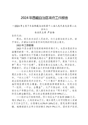 2024年西藏自治区政府工作报告—2024年1月7日在西藏自治区第十二届人民代表大会第二次会议上自治区主席 严金海各位代表:现在,我代表自治区人民政府,向大会报告政府工作,请予审议,并请各位政协委员和列席的同志提出意见。2023年工作回顾2023年是全面贯彻党的精神的开局之年,也是本届政府全面履职的第一年。我们坚持以新时代中国特色社会主义思想为指导,全面贯彻关于西藏工作的重要指示、新时代党的治藏方略和致2023·中国西藏发展论坛重要贺信精神,认真落实党中央、国务院决策部署,在区党委坚强领导下,聚焦四件大事聚力四个创建,紧紧依靠全区各族人民,踔厉奋发、勇毅前行,迈出了西藏长治久安和高质量发展的新步伐。——社会大局安定和谐。坚决维护国家政治安全,持续开展反分裂斗争,全区未发生重大政治性、群体性和暴力恐怖案件。四大工程六项行动成效明显,七地(市)全部建成全国民族团结进步示范市。三个意识教育深入人心。寺庙财税监管实现全覆盖。优化维稳指挥调度体系,实现全区一张网、一平台、全覆盖。从严开展治安、交通、消防、安全生产等整治行动,深入落实食品安全两个责任,有效防范化解金融风险,群众安全感满意度保持99%以上。——经济运行持续向好。预计地区生产总值超2300亿元、增长9%左右,人均突破6万元。城乡居民人均可支配收入突破5万元和2万元,分别增长6.5%和10%左右。居民消费价格涨幅、城镇调查失业率分别控制在3%和5%以内。固定资产投资、社会消费品零售总额、进出口总额分别增长30%、22%和130%以上,主要经济指标增速位居全国前列。——发展动能稳步增强。狠抓投资落实年成效明显,川藏铁路、G318提质改造等重点项目有序推进,普兰机场、贡嘎机场第二跑道和国际航站楼建成投运,湘河水利枢纽投产发电。金沙江上游、藏东南纳入国家水风光一体化示范基地。出台促消费政策24条,提振消费专项行动效应凸显,西藏味道美食街烟火渐旺。区域开放进一步扩大,15个传统边贸点获批恢复。吉隆、普兰、樟木、里孜口岸全面实现客货双通。——特色产业提质增效。建立重点产业链链长制。粮食、蔬菜、肉蛋奶产量分别达108万吨、95万吨、93万吨。飞地种粮喜获丰收,首批新米入藏上市。新增国家农民合作社示范社30家。高原炊具首年销售67万件,炊具革命闯出高原轻工新路径。电力装机突破700万千瓦,外送电量增长189%。旅游接待人次和收入历史性突破5500万和650亿元。通航产业高点起步,藏医药、边贸物流等产业持续发展。预计规上工业、数字经济增加值分别增长10%和15%以上。——城乡区域更加协调。高质量编制区市县三级国土空间规划。实施保障性安居工程2.19万套(户)、老旧小区改造65个。预计常住人口城镇化率达38%以上。完成人畜分离7.7万户、户厕改造4万户,建设宜居宜业和美乡村220个,1308个村(居)旧貌换新颜,树立农牧民新风貌行动得到国家乡村振兴局充分肯定。强化动态监测和后续帮扶,脱贫户人均纯收入增长15%以上。——营商环境持续优化。全力推进优化营商环境一号工程,打造援藏双招双引品牌,招商引资到位资金突破500亿元。开展四最对标行动,行政审批事项减少近半。改革优化国省道检查站查验模式,过往车辆实现读秒通行。新增减税降费、退税缓费46.2亿元。清欠中小企业账款46亿元。实施企业上市格桑花行动,直接融资135亿元。以前所未有的力度调油价、降电价,昌都、阿里成品油价格与拉萨价差明显缩小,全区居民和工商业综合用电成本分别调降13%和14%,边境乡镇电价减半收取,高原特色产业目录电价最高调降64%,预计每年降本减负5亿元。——民生福祉保障有力。出台居民增收16条。农牧民转移就业64.7万人、劳务收入65.6亿元。应届高校毕业生区外就业3605人,创历史新高。西藏班新增招生计划605名。推进医联体医共体建设,新增国家区域医疗中心2个。(下转第三版)(紧接第一版) 包虫病应治尽治,大骨节病愿治尽治。基本医保率先实现省级统筹。体育健儿获得重大赛事奖牌109枚。西藏美术馆、大剧院投入使用,文化惠民活动深入开展。——生态底色越发厚实。完成营造林120万亩,其中拉萨南北山绿化24万亩。修复治理退化草原614万亩。完成冰川(冰雪)、冰湖资源本底调查。全面开展矿业权清理整顿,依法无偿收回矿业权217个。加强中央生态环保督察整改。完成首笔国际绿证交易、林草碳汇交易。环境空气质量优良天数比例达99%以上,主要江河湖泊水质达到或优于Ⅲ类标准。新增国家生态文明建设示范区4个,七地(市)生态文明示范创建目标提前实现。——兴边富民卓有成效。米林、错那撤县设市。兴边富民行动中心城镇加快建设,智慧边防有力推进。边境乡村硬化路通达率分别达97%和87%,建制村用
