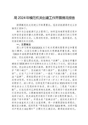 局2024年模范机关创建工作开展情况报告按照模范机关创建工作部署要求,现将省能源局有关工作情况汇报如下。局作为全省能源行业主管部门,始终坚决地贯彻落实党中央和省委省政府重大决策部署,始终坚持以省直部门的工作标准和作风要求自身,认真对标对表、持续发力、落细落实,扎实推进模范机关创建。一、主要做法深入学习贯彻XXXXXX关于机关党建的重要讲话和重要指示精神,以深化创建工作推动机关党建高质量发展。制定《2024年省能源局高质量党建工作方案》,结合实际细化创建目标、实化创建举措、深化创建工作。(一)强化理论武装,打造特色品牌。坚持在学懂弄通做实XXX新时代中国特色社会主义思想上下功夫,强化政治引领,突出政治机关意识教育,教育引导全局党员干部坚决拥护两个确立、坚决做到两个维护。重点围绕三个群体,打造三个学习品牌。一是抓关键少数,打造政治品牌。局党组理论学习中心组(扩大)切实发挥领学示范带动作用,年初以来累计召开7次(扩大)学习会议,组织专题学习、深入研讨,引导党员干部全面领会XXX新时代中国特色社会主义思想的科学体系、核心要义。二是抓关键少数,打造支部书记讲党课特色品牌。党员领导干部发挥表率示范带动作用,主题教育期间局党组书记带头为全局讲党课,局班子成员、机关其他党员领导干部累计讲专题党课20次。三是抓青年群体,开展各类品牌活动。组织机关青年干部参加省直机关工委工会篮球赛,进一步凝聚团结奋进理论,激发活力激情。组织开展贯彻落实党的XXX精神,庆祝中国共产党成立102周年主题文艺汇演活动,歌颂美好新时代,汇聚干事创业新激情。组织党员干部到中车长客开展现场教学,感受艰苦奋斗、自强不息的创业精神;在XXXXXX视察吉林三周年之际,组织全局党员干部重走XXXXXX视察四平路线并参观四平战役纪念馆。(二)实施三项提升工程,夯实建强基层党组织。深入推进质量提升工程。坚持在增强基层党组织政治功能和组织功能上下功夫,树立大抓基层鲜明导向,以四强党支部为目标,以支部标准化为抓手,把机关党组织建设成为宣传党的主张、贯彻党的决定的坚强战斗堡垒。新能源处党支部结合职责职能大力实施新能源乡村振兴。指导制定实施方案,下发申报新能源乡村振兴项目通知,下达新能源乡村振兴项目建设指标并抓好全程指导服务。截至目前,进展较快的延边州龙井市已完成场地平整等基础工作,预计今年12月底前并网发电,其他县正在进行项目选址和公开选优等,全部项目建成后,每年可为每个边境村集体带来收益约5万元,至少持续20年,总收益超过2亿元。深入实施提亮增色工程。眼解决党建业务两张皮问题,推动党建业务真融合,实现党建强、业务强双强目标。电力处党支部充分发挥战斗堡垒作用,聚焦制约电力消纳发展瓶颈问题,印发《省绿电园区建设方案(试行)》并研究细化形成了绿电园区建设实施及分工方案,不断补齐工作短板和修正工作偏差,大力发展新能源产业,取得明显成效。深入实施提能增技工程,着眼解决党务干部理论和技能,组织党务干部和支部书记赴杨靖宇干部学院开展开展专题培训。通过看、听、读、讲、演、答的多样学习方式中,接受深刻的政治教育和思想淬炼,提升了党的建设的理论和水平。(三)践行初心使命,服务乡村振兴和双百共建。持续强化包保帮扶柳河县柳河镇新发西村和包保边境村集安市麻线镇麻线村的帮扶工作,发挥党建引领,强化人员管理,依托新能源光伏项目带动村集体经济增收,2023年7月集安市麻线村新建成的集中式光伏项目将在未来25年内每年稳定为村集体增收20万元。充分发挥技能兴边培训中心作用,开展智志双扶技术技能培训,投设桌椅40套,一体机电脑21套,智能黑板(投影、电脑)1套等总价值10余万元的智能教学设备,开展办公自动化、电焊、光伏技术、草编、直播、汽车维修等技能培训,累计培训300余人次。持续推进双百共建活动,继续与东光社区开展共建,党员共认领微心愿20个,帮助社区解决急难愁盼问题。(四)从严正风肃纪,深入推进廉政机关建设。局机关聚焦建设风清气正政治机关,从严从实加强自身建设,着力强化日常监督管理。充分运用监督执纪第一种形态,年初组织开展对下级一把手廉政约谈活动;指导各基层党组织按照监督谈话任务要求,党组织一分析、一报告、领导干部一谈话、一档案准备工作,达到了监督提醒、自我检视、促进提高的作用;在驻委纪检组指导下对全局系统处级及以上领导干部开展监督提醒谈话;结合全面从严治党大检查工作,对各直属事业单位负责人和纪委书记开展提醒谈话;结合纪检干部教育整顿活动,对全局系统17名纪检干部开展了3次提醒谈话,有效提高了自觉接受监督主动监督意识。扎实开展各类警示教育,使规矩意识和纪律观念真正内化于心、外化于行,提高自觉监督主动接受监督的意识。二、取得成效一是践