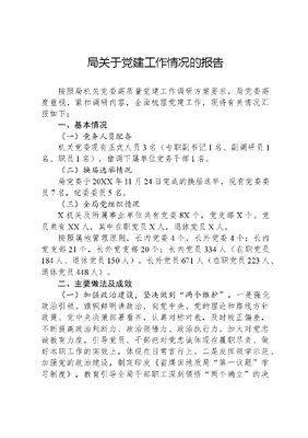 局关于党建工作情况的报告按照局机关党委高质量党建工作调研方案要求,局党委高度重视,紧扣调研内容,全面梳理党建工作,现将有关情况汇报如下:一、基本情况(一)党务人员配备机关党委现有正式人员3名(专职副书记1名、副调研员1名、职员1名),借调下属单位党务干部1名。(二)换届选举情况局党委于20XX年11月24日完成的换届选举,现有党委委员7名,纪委委员5名。(三)全局党组织情况X机关及所属事业单位共有党委8X个,党支部X个。党员共有XX人,其中在职党员X人,退休党员X人。按照属地管理原则,长内党委4个,长外党委4个;长内党支部21个,长外党支部20个;长内党员334人(在职党员184人、退休党员150人),长外党员671人(在职党员223人、退休党员448人)。二、主要做法及成效(一)加强政治建设,坚决做到两个维护。一是强化政治引领。旗帜鲜明讲政治,向党中央、党的理论和路线方针政策、党中央决策部署看齐,认真对标对表,及时校正偏差,不断提高政治判断力、政治领悟力、政治执行力。加大对党忠诚教育力度,引导党员、干部把对党忠诚体现在履职尽责、做好本职工作的实效上,体现在日常言行上。二是发挥领学示范。加强党的政治建设,制定印发《省煤田地质局第一议题学习制度》,教育引导全局干部职工深刻领悟两个确立的决定性意义,增强四个意识、坚定四个自信、做到两个维护。坚持第一议题制度,年初以来开展党委第一议题学习9次,及时跟进学习XXXXXX重要讲话重要指示精神以及中央、省委重大决策部署,坚持用XXX新时代中国特色社会主义思想武装头脑、指导实践、推动工作。三是抓实党建责任。召开定期议党会议1次,专题议党会议3次,做到党建工作与中心工作同部署同安排。将党建工作纳入重要议事日程,制定印发党的建设工作要点,列出责任清单,明确责任,形成工作机制。研究制定《省煤田地质局高质量党建工作方案》,全面落实基层高质量党建各项任务。组织召开基层党组织书记抓基层党建工作述职评议考核会议,指导基层党组织书记进行述职述责,并对基层党组织书记进行民主测评。四是开展党建工作调研。按照大兴调查研究的部署要求,从4月末开始,深入局属各单位和基层一线开展调研,查找基层党组织党建工作存在的突出问题和大家反映强烈的热点难点问题,并从党建引领高质量发展的角度,对提升新时代党建工作质量的具体路径进行了有益探索。(二)坚持学思践悟,深入开展主题教育。一是突出以上率下。把开展XXX新时代中国特色社会主义思想主题教育作为一项重大政治任务,第一时间成立领导小组、召开动员大会、印发实施方案、组织读书班、开展专题学习,局领导班子成员带头讲专题党课,以关键少数示范带动绝大多数,兴起主题教育热潮。各基层党组织以三会一课、主题党日活动等形式开展学习研讨,推动主题教育走深走实。二是抓好学习教育。按照主题教育读书班学习计划表安排,组织全局干部职工进行集中学习,结合《XXX著作选读(第一卷、第二卷)》《XXX新时代中国特色社会主义思想专题摘编》等8种学习材料,一字一句从原文学起,逐篇逐章认真研读领悟。邀请吉大教授和省委党校教授进行专题辅导,进一步系统掌握XXX新时代中国特色社会主义思想的世界观和方法论,深入理解蕴含其中的道理学理哲理,提升了理论素养和党性修养。三是创新方式方法。坚持集中学、个人自学与研讨交流,线下学习与线上教育相结合等多种形式,增强主题教育吸引力感染力。用好学习强国、新时代e支部等学习平台进行在线学习,做到学思用贯通,知信行统一。四是坚持学用结合。围绕地勘行业改革发展,深入基层一线开展调查研究。交流调研成果,形成指导实践、推动工作的思路办法和政策举措,并抓好组织实施,真正把调研成果转化为解决问题、促进发展的实际行动。(三)强化理论武装,用党的创新理论凝心铸魂。一是学习贯彻党的XXX精神。把学习贯彻党的XXX精神作为首要政治任务,通过集体学习与个人自学、专题学习与理论研讨相结合的方式,力求学深悟透、入脑入心。持续开展宣讲党的XXX精神活动,引导党员干部深刻认识两个结合的思想精髓,全面把握六个坚持的世界观和方法论,推动学习宣传贯彻走深走实、见行见效。二是深化理论武装。坚持把政治理论学习放在首位,研究制定党委理论学习中心组学习重点内容安排,明确学习重点,不断巩固党史学习教育学习成果,进一步提高党员领导干部政治理论水平,充分发挥领导干部带头领学促学作用,引导广大党员干部悟初心、践初心。上半年,开展党委理论学习中心组学习3次。三是落实意识形态工作责任制。局党委专题研究意识形态工作,研究制定了《中共省煤田地质局委员会贯彻落实意识形态工作责任制工作制度》。科学分析研判意识形态领域情况,旗帜鲜明反对和抵制各种错误观点。把握重大时间节点,有效防范处置意识形态风险隐患。
