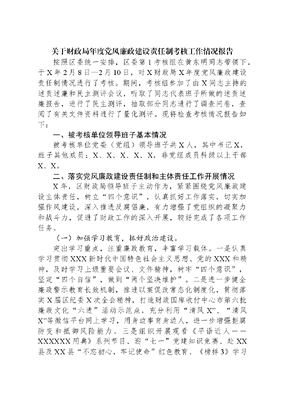 关于财政局年度党风廉政建设责任制考核工作情况报告按照区委统一安排,区委第1考核组在黄东明同志带领下,于X年2月8日—2月10日,对X财政局X年度党风廉政建设责任制情况进行了考核。期间,考核组参加了由X同志主持的述责述廉和民主测评会议,听取了同志代表班子所做的述责述廉报告,进行了民主测评,抽取部分同志进行了调查问卷,查阅了有关文件资料进行了量化测评。现将检查考核情况报告如下:一、被考核单位领导班子基本情况被考核单位党委(党组)领导班子共X人,其中书记X,班子其他成员:X、X、X、X、X,非党组成员科级以上干部X、X。二、落实党风廉政建设责任制和主体责任工作开展情况X年,区财政局领导班子主动作为,紧紧围绕党风廉政建设主体责任,树立四个意识,认真抓好工作落实,切实加强作风建设,深入推进反腐倡廉,有力增强了党组织的凝聚力和战斗力,促进了财政工作的深入开展,较好完成了各项工作任务。(一)加强学习教育,抓好政治建设。突出学习重点,注重廉政教育,丰富学习载体。一是认真学习贯彻XXX新时代中国特色社会主义思想、党的XXX和精神,及时学习上级重要会议、文件精神,树牢四个意识,坚定四个自信,做到两个坚决维护。二是进一步健全廉政警示教育长效机制,推进以案促改常态化制度化,贯彻落实X届区纪委X次全会精神,打造财政国库收付中心市第六批廉政文化六进活动示范点,充分利用清风X、清风X等微信平台网上学习,用身边事育身边人,进一步增强拒腐防变和抵御风险能力。三是组织开展观看《平语近人--XXXXXX用典》系列节目、迎七一党建知识竞赛、赴XX县及XX县不忘初心,牢记使命红色教育、《榜样3》学习交流、参观廉政教育基地、宪法宣传周学习宣传教育、直播改革开放40周年大会等载体丰富的学习教育活动。(二)全面从严治党,抓好队伍建设。加强组织领导,贯彻民主集中制,规范党建工作。一是健全《党组成员党建工作一岗双责制度》,财政局党组书记X同志落实党建工作第一责任人工作,贯彻《党组成员党建工作一岗双责制度》,专题研究年度党建工作,按季度听取党建工作汇报,合理安排组织构架,设立两个党小组对39名党员干部进行管理,确保领导有力。二是认真贯彻执行中央关于加强民主集中制的有关制度和规定,重大事项决策、重要干部任免、重要项目安排、大额资金使用,按照集体领导、民主集中、个别酝酿、会议决定原则,集体讨论,充分发挥班子成员集体领导作用。三是较好执行双重组织生活制度,以巡视整改、整治帮圈文化、以案促改专题生活会、两学一做学习教育活动、三会一课为规范党建工作抓手,开展关爱山区儿童、献爱心送温暖、城市大清洗、文明交通等志愿服务活动50余次,有力促进了党建工作的开展。(三)落实两个责任,严肃作风纪律。严格落实两个责任,严守党的六大纪律,深化干部作风大整顿活动。一是制定实施《党风廉政建设责任制工作实施方案》、《落实党风廉政建设责任制分解方案》,局党组书记X同志统领全局,班子成员自觉履行一岗双责,层层传导压力,层层压实责任,形成一级抓一级、层层抓落实的工作格局;纪检组严格监督执纪问责,完善信访举报反馈机制,与财政业务工作相结合,经常谈心谈话,对苗头性、倾向性问题及时批评教育到位,防患于未然。二是以高度的政治自觉、思想自觉和行动自觉,认真学习《廉洁自律准则》和《纪律处分条例》等党员准则,严格执行党的六大纪律,严格上报领导干部个人有关事项报告,严格执行办公用房、公务用车、公务接待等规定,严格管束亲属和身边工作人员,不断增文可居文库——海量学习资料,手机电脑均可下载www.wenkeju.com强自我净化、自我完善、自我革新、自我提高的能力。三是开展形式主义和官僚主义集中整治活动,严格工作纪律,建立绩效考勤机制,健全请销假管理、公务用车审批、因公外出登记、去向告知牌、纪律检查通报等制度,完善《关于加强作风建设的六项制度及实施细则》,杜绝门难进、脸难看、话难听、事难办现象,切实提高了办事单位和群众对财政工作的满意度。(四)发挥财政职能,抓好源头反腐。落实中央八项规定精神,严格财政监督检查,推进巡视巡察整改。一是严控各预算单位三公经费,大力压缩一般性支出,推进公务卡结算、预算绩效管理、预决算及三公经费公开工作,保障财政资金支出透明;严格执行差旅费、会议费、培训费、国资管理、政府采购、投资评审等制度体系,中央八项规定精神深入落实。二是加强资金拨付审核和财政监督检查,进行了非税收入暨行政事业单位房屋出租收入、会计信息质量检查等财政监督检查活动,构建了事前、事中、事后财政全覆盖的监督机制,切实维护了财政纪律的严肃性。三是根据中央巡视河南、省委巡视平顶山反馈意见,按照区委整改落实方案及台账要求,主动认领,对照整改,抓好落实,