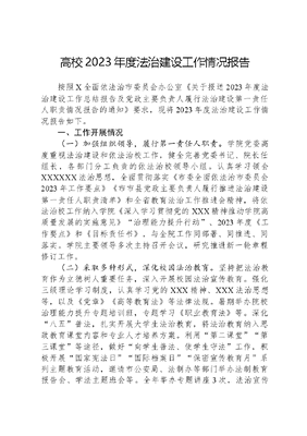 高校2023年度法治建设工作情况报告按照X全面依法治市委员会办公室《关于报送2023年度法治建设工作总结报告及党政主要负责人履行法治建设第一责任人职责情况报告的通知》要求,现将2023年度法治建设工作情况报告如下。一、工作开展情况(一)加强组织领导,履行第一责任人职责。学院党委高度重视法治建设和依法治校工作,健全完善党委书记、院长任组长,各部门分工负责的依法治校领导小组。认真学习领会XXXXXX法治思想,全面贯彻落实《市委全面依法治市委员会2023年工作要点》《市市县党政主要负责人履行推进法治建设第一责任人职责清单》和全省教育法治工作推进会精神,将依法治校工作纳入学院《深入学习贯彻党的XXX精神推动学院高质量发展的实施意见》治理能力提升行动、2023年度《工作要点》和《目标责任书》,与全院工作同部署、同推进、同落实。学院主要领导多次主持召开会议,研究推进新一轮章程修订工作。(二)采取多种形式,深化校园法治教育。坚持把法治教育作为立德树人重要任务,深入开展校园法治宣传教育。强化三级理论学习制度,认真学习党的XXX精神、XXX法治思想等,以及《党章》《高等教育法》等法律法规。暑期举办院校治理能力提升专题培训班,专题学习《职业教育法》等。深化八五普法,扎实开展大学生法治教育,将法治教育纳入思政教育课堂内容和专业人才培养方案。利用第二课堂第三课堂等途径,做好向学生普法、使学生守法工作,积极开展国家宪法日国际档案日保密宣传教育月系列主题教育活动,邀请市公安局、法制办等部门举办法制教育报告会、学法主题班会等。全年举办专题讲座3次,法治宣传覆盖10000多人次,实现了法治教育的全方位、开放式、立体化。(三)健全一章八制,筑牢法治建设基石。始终把制度建设作为依法治校基础,坚持以一章八制为核心,持续加强制度建设,建立并落实制度废改立机制。出版学院第四版内部控制制度汇编,修订、新增涉及思政工作、教育教学、科技研发、资产财务、人事管理等领域制度288项,构建形成现代职业学校制度体系。将章程作为学院内部治理的根本法,加快推进新一轮章程修订工作。认真对照《高等学校章程制定暂行办法》《教育部办公厅关于启动新一轮高等学校章程修订工作的通知》和省教育厅要求,成立章程修订工作领导小组,依据职教新政,结合学院实际,初步完成章程修订《草案》,计划年底前报教育厅审批后实施,切实筑牢依法治校基石。(四)深化五会共治,完善依法治校机制。深入实施党委会、院长办公会、理事会、学术委员会、教职工代表大会五会共治,完善依法治校体制机制,确保权力依法运行。坚持和完善党委领导下的院长负责制,建立健全党委统一领导、党政分工合作、协调运行的议事规则和工作机制。2023年召开党委常委会、院长办公会25次,研究党的建设、意识形态、双高建设等三重一大重大事项和重要制度200多项。深化民主监督权力,召开二届二次教职工代表暨工会会员代表大会,审议《学院教师职务评审办法(2023年修订)》等,组织学院领导接待学生9批次99人次,解决重点诉求130个。优化学院学术委员会、教学工作委员会组成,规范学术治理。(五)坚持多措并举,全面建设法治校园。充分发挥课堂教学主阵地作用,开足上好《思想道德与法治》必修课,纳入学生考核评价体系,提高学生法治意识。根据学生入学、在校、社会实践、就业等不同学习阶段,相应普及《未成年人保护法》《网络安全法》等法律法规,促使学生在平时的学习、生活和工作中自觉做到尊法学法守法用法。为辅导员、学生代表文可居文库——海量学习资料,手机电脑均可下载www.wenkeju.com颁发校园法制宣传员聘书,利用开学典礼、入团仪式等活动,进行有针对性的法治宣传教育。深化校院及周边治安问题综合整治,会同公安部门依法严厉打击校园贷、套路贷、校园欺凌等涉校涉生违法犯罪行为,全面建设法治校园。二、存在问题(一)个别领域法律法规有待进一步掌握。对与依法治校、依法治教、依法治学等有关的法律法规学习较为全面、系统,对与职业教育关系不够密切的法律法规关注不够。比如,对第三方公司、外聘人员管理相关的《民法典》合同法等内容学习掌握不够,在对应领域出现了一些制度空白,从而导致发生个别涉及学院的投诉和信访问题。为此,学院邀请市公安局、网信办、法制办、中级人民法院等部门来院举办法制教育报告会、学法主题教育班会等,加强对民法典等学院事业涉及领域法律法规的学习。建立健全法律顾问制度,与泰和泰(西安)律师事务所合作,依法审查学院有关文件合法性、处置诉讼及法律事务,全年法律顾问审核收集整理学院经济合同X份。今年以来,学院先后接到省信访信息系统信访件X件,X12345平台投诉案件X件,全部依法依规妥善处理。(二)内部治理体系有待进一步完善。学校职能部门和二级