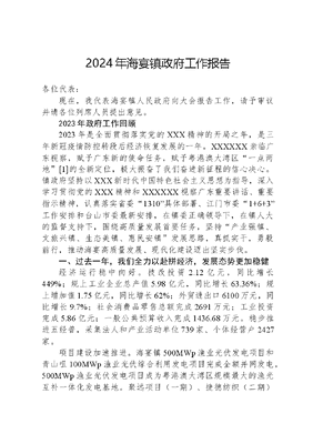2024年海宴镇政府工作报告各位代表:现在,我代表海宴镇人民政府向大会报告工作,请予审议并请各位列席人员提出意见。2023年政府工作回顾2023年是全面贯彻落实党的XXX精神的开局之年,是三年新冠疫情防控转段后经济恢复发展的一年。XXXXXX亲临广东视察,赋予广东新的使命任务,赋予粤港澳大湾区一点两地[1]的全新定位,极大振奋了我们奋进新征程的信心决心。镇政府坚持以XXX新时代中国特色社会主义思想为指导,深入学习贯彻党的XXX精神和XXXXXX视察广东重要讲话、重要指示精神,认真落实省委1310具体部署、江门市委1+6+3工作安排和台山市委最新安排,在镇委正确领导下,在镇人大的监督支持下,围绕高质量发展首要任务,坚持产业强镇、文旅兴镇、生态美镇、惠民安镇发展思路,真抓实干,勇毅前行,推动海宴高质量发展、现代化建设迈出坚实步伐。一、过去一年,我们全力以赴拼经济,发展态势更加稳健经济运行稳中向好。技改投资2.12亿元,同比增长449%;规上工业企业总产值5.98亿元,同比增长63.36%;规上增加值1.75亿元,同比增长62%;外贸进出口6100万元,同比增长9.7%;社会消费品零售总额完成2691万元;工业投资完成5.86亿元;一般公共预算收入完成1436.68万元。稳步推进五经普,采集法人和产业活动单位739家、个体经营户2427家。项目建设加速推进。海宴镇500MWp渔业光伏发电项目和青山咀100MWp渔业光伏综合利用发电项目完成全额并网发电,500MWp渔业光伏发电项目成为粤港澳大湾区规模最大的渔光互补一体化发电基地。聚远项目(一期)、捷德纺织(二期)项目完成建设并投产。4个市重点项目完成投资8.32亿元,超前完成年度计划101%,为产业高质量发展蓄势赋能。招商引资成效显著。深入推进招大引强一号工程,招商队伍奔赴广州、福建、深圳等重点城市开展敲门招商,精准引进一批有品牌、重创新、实力强的企业落户海宴。全年落实超亿元以上招商引资项目3个,投资总额3.4亿元,引进超3000万元项目1个,经济发展后劲充足。二、过去一年,我们奋战百千万工程,城乡建设更加靓丽加速美丽圩镇建设。聚焦美丽圩镇七个一建设,投入902.7万元,完善海宴圩镇内街小巷道路设施建设,更换老旧生活污水管网。投入141.9万元,完成沙栏圩主干道铺设沥青提档升级,打造宜居宜业美丽圩镇。在国道G228(肖美至升平段)、旧麻阳线、侨宴路等路段增设60多处太阳能交通警示灯。在镇供电所、华盛酒楼广场、花田驿站广场等点位新建11个公共新能源汽车充电桩。打造和美宜居乡村。五丰村成功入选百千万工程省级典型选树培育村,南丰村入选江门市级典型选树培育村。全力推进十四五农村公路县乡村道提质改造项目,投入426.08万元,完成11条共计11.522公里村道改建。投入264.3万元,完成丰石桥和肖美二桥升级改造。投入99.4万元创建Y339交通安全示范路。绿美海宴稳步推进。污染防治持续深化,投入1200多万元高标准实施海宴镇污水处理厂提质扩容改造项目,处理后水质达一级A标准。持续开展181条自然村农村人居环境整治,打造宜居乡村环境。全力推进辖区高位池养殖尾水治理工作,开展5个入海排污口尾水整治。投入7000多万元深入实施中小河道整治工程建设,完成海宴河、沙栏河、长庆河道整治。完成海侨红树林湿地公园候鸟保护区观鸟栈道挡土墙草坪工程建设,打造生态旅游亮点。严格落实河长制林长制工作,镇村两级河长开展巡河4955次,林长开展巡林140次,完成桂南文可居文库——海量学习资料,手机电脑均可下载www.wenkeju.com水库高质量水源林种植项目,人工造林1615亩,种植苗木14万株。三、过去一年,我们精准发力抓提升,发展基础更加扎实守牢粮食安全底线。完成海侨片区盐碱地复耕复种约12000亩。严格落实基本农田非粮化,完成水稻种植面积56573.9亩。新建高标准农田6800亩。完成洞安垦造水田项目建设,东联沙栏、那陵澳村垦造水田项目扎实推进,新增水田面积1270亩。实施北迳水库、鸡笼山水库和沙栏崩岗水库维修养护工程,夯实农业生产基础。着力推进强村富民。引进专业队伍,投入超3000万元,利用海侨片区盐碱地农田打造面积达227公顷的规模化、标准化甘薯苗种植基地,预计年产值将超亿元。加大对经济薄弱村帮扶力度,建成那陵村三藏三保粮食加工储存项目[2],实现村集体收益12万元。完成升平、那陵等5个经济薄弱村的老区项目建设,壮大新型农村集体经济,拓宽农民增收渠道。壮大集体经济,全镇25个村(社区)集体总收入超5900万元、经营性收入超5400万元。规范三资管理,全年通过三资一体化平台交易18宗。文旅深度融合发展。实施海侨景区沿线风貌提升和美化亮化