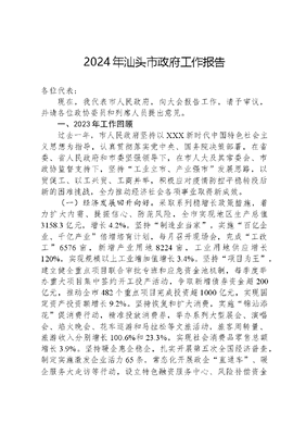 2024年汕头市政府工作报告各位代表:现在,我代表市人民政府,向大会报告工作,请予审议,并请各位政协委员和列席人员提出意见。一、2023年工作回顾过去一年,市人民政府坚持以XXX新时代中国特色社会主义思想为指导,认真贯彻落实党中央、国务院决策部署,在省委、省人民政府和市委坚强领导下,在市人大及其常委会、市政协监督支持下,坚持工业立市、产业强市发展思路,以贸促工、以工兴贸、工商并举,积极应对疫情防控平稳转段后新的困难挑战,全力推动经济社会各项事业取得新成效。(一)经济发展回升向好。采取系列稳增长政策措施,着力扩大内需、提振信心、防范风险,全市实现地区生产总值3158.3亿元,增长4.2%。坚持制造业当家,实施百亿企业、千亿产业倍增培育计划,每月召开现场会,完成工改工6576亩,新增产业用地8224亩,工业用地供应增长120%,实现规模以上工业增加值增长3.4%。坚持项目为王,建立健全重点项目联合审批专班和应急资金池机制,每季度举办重大项目集中签约开工投产活动,争取新增债券资金超200亿元,推动全市482个重点项目完成投资超1000亿元,实现固定资产投资额增长9.2%。坚持恢复和扩大消费,实施锦汕添花促消费行动,精准投放消费券,举办系列大型展会、演唱会、焰火晚会、花车巡游和马拉松等文旅活动,旅客周转量、旅游收入分别增长100.6%和23.3%,实现社会消费品零售总额增长3.9%。坚持暖企惠企稳企,扎实开展第五次全国经济普查,制定实施激发企业活力65条,常态化开展政企直通车、暖企服务大走访等行动,设立特色融资服务中心、风险补偿资金等,为企业减轻社保负担2.9亿元、利息成本3.9亿元,减税降费、退税缓费超29亿元,普惠小微企业贷款增长23.6%,金融机构贷款余额突破3000亿元。坚持防范重点领域风险,新建和改造提升高标准农田1.3万亩,完成粮食播种面积104万亩、总产量46万吨,夯实粮食安全基础;实施房地产业扶持政策12条、金融16条,切实保交楼、保民生、保稳定;实现一般公共预算收入133.4亿元,增长4.2%,争取上级转移支付资金237亿元,民生支出占一般公共预算支出比重达78.3%,持续兜牢三保底线。(二)重点产业聚链成势。实施五大提升行动,推动三新两特一大产业加快补链延链强链。新能源产业加快串珠成链,举办汕头国际风电创新港产业项目开工签约大会和风电技术创新大会、项目签约金额360亿元,投资84亿元的勒门(二)海上风电项目并网投产,省风电临海试验基地投入使用,四个一体化高端装备制造产业园和全球最大的40兆瓦级动力学六自由度风电机组加载实验平台开工建设。新材料产业加快项目落地,SK聚酯、薄膜高分子母料等项目建成投产,锂电池新材料产业园前期工作加快推进,光华科技获评省级动力电池综合利用链主企业。新一代电子信息产业加快数字赋能,获中央网信办同意开展全国首个新型国际网络接入试点,举办2023中国数字经济创新发展大会,引进数字经济企业326家,立汕智造、超声电子新型特种印制电路板一期项目建成投产,永裕光电、移动AI创新应用中心等重点项目加快建设,入选2023数字百强市、省级中小企业数字化转型城市试点。纺织服装产业加快扩能提质,出台纺织服装10条、纺织服装产业高质量发展实施意见,举办第二届中国·潮汕国际纺织服装博览会、现场签约金额156亿元,四大工程加快建设,产业总部大厦主体结构封顶,总投资305亿元的汕头国际纺织城全面开工,总投资350亿元的157个纺织服装产业项目开工或投产,锦纶面料年产能增长24倍。玩具创意产业加快集聚发展,文可居文库——海量学习资料,手机电脑均可下载www.wenkeju.com举办第22届中国汕头(澄海)国际玩具礼品博览会、现场成交金额30亿元,成立塑胶精密制造联盟,中科智谷玩具产业城、万洋众创城等项目加快建设,奥飞娱乐获评省级动漫产业链主企业。大健康产业加快特色培育,举办大健康产业高峰论坛,大参林产业基地二期、广药王老吉荔枝产业园一期项目建成投产,仙乐健康海洋生物食品、美宝制药现代中药、汇群中药标准化加工等项目加快建设,涵盖生物医药、现代中药、健康食品等的大健康全产业链逐步完善。创新驱动加快成果转化,全社会研发经费投入增长16.4%,规划建设汕头科学城,打造南澳科学会议高端学术品牌,成立潮医智库、潮师智库,举办5场产学研面对面对接活动,化学与精细化工省实验室首家孵化企业获千万级融资,新增国家级科技企业孵化器1家、高新技术企业57家,新增博士、博士后工作平台11家,新引进外籍高端人才和专业人才161名,市精细化工产业人才振兴计划获评省新一轮扬帆计划第一档次。(三)承接产业步伐加快。抢抓列入省重点支持主平台机遇,承接能源、纺织服