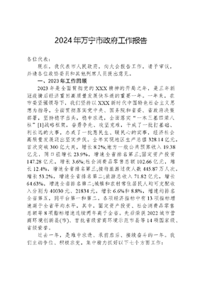 2024年万宁市政府工作报告各位代表:现在,我代表市人民政府,向大会报告工作,请予审议,并请各位政协委员和其他列席人员提出意见。一、2023年工作回顾2023年是全面贯彻党的XXX精神的开局之年,是三年新冠疫情后经济重回高质量发展快车道的重要一年。一年来,在市委坚强领导下,我们坚持以XXX新时代中国特色社会主义思想为指导,全面贯彻落实党中央、国务院和省委、省政府决策部署,坚持稳字当头,稳中求进,全面落实一本三基四梁八柱[1]战略框架,奋勇争先、攻坚克难,干成了一批打基础、利长远的大事,办成了一批惠民生、暖民心的实事,经济社会高质量发展迈出坚实步伐。全年实现地区生产总值328.14亿元,首次突破300亿大关,增长8.2%;地方一般公共预算收入19.38亿元,同口径增长23.9%,增速全省排名第三;固定资产投资147.28亿元,增长3.6%;社会消费品零售总额102.66亿元,增长12.4%,增速全省排名第三;接待旅游过夜人数445.87万人次,增长53.2%,增速全省排名第二;旅游总收入71.82亿元,增长64.63%,增速全省排名第二;城镇和农村常住居民人均可支配收入分别为40030元、21834元,增长6.6%和8.8%,增速均排名全省第五,同平台第一和第二。各项经济指标中有13项指标增速高于全省平均水平,其中,固定资产投资、社会消费品零售总额等8项指标增速连续两年高于全省。先后荣获2022城市营商环境创新县(市)、首批省级营商环境示范市县等14项国家级、省级荣誉。过去一年,是难中求进、承前启后、接续奋斗的一年。我们主动争位、积极求变,集中精力抓好以下七个方面工作:(一)坚持提质增效,经济运行整体回升向好。坚持政策+行动双轮驱动、扩需求+强主体双向发力,全力拼经济、抓项目、促发展。招商引资成果丰硕。成立市招商服务中心。实施招商引资一把手工程,引进全国500强企业2家,签约项目13个,投资金额106.95亿元,项目招引数量和质量实现新突破,顺利完成全年招商任务。项目建设量质齐升。创新市重大项目谋划、推进、保障机制,产业投资占比44.9%,增长12.5%;基础设施投资占比18.4%,增长21.2%。抢抓稳经济一揽子政策重大机遇,争取中央预算内、专项债、国债资金18.05亿元,支持36个项目建设。消费市场加快恢复。发放政府消费券1557万元,带动消费3.24亿元。累计纳统汽车销售企业7家,汽车销售额增长40%。免税销售额4.68亿元。开设公益性夜市,助力夜间经济复苏。园区建设初见成效。以东星斑、鰤鱼等为主导的国家现代农业产业园加速推进,进驻企业30家,园区产值超90亿元,实现税收超3亿元,并顺利通过中期评估,入选2023年国家级农业现代化示范区名单。万宁热带高新农业产业园累计签约企业21家,带动周边群众就业3000多人,园区产值超18亿元,实现税收5000万元。(二)坚持集群发展,产业转型升级加速推进。聚焦延链补链强链,推动产业集聚、要素集约。农业现代化步伐加快。世界咖啡竞拍交易中心落地;兴隆咖啡入选2023年国家地标品牌+示范案例,获批创建省级咖啡优势特色产业集群;兴隆咖啡产业小镇入选全省2023年度特色产业小镇创建名单。1+11+10+N[2]公用品牌产业格局初步形成。林下经济种植面积达8000亩,带动种植户人均增收约1万元,有效弥补槟榔黄化病给农民造成的损失。在三更罗、南桥试种雪茄烟叶。罗牛山10万头生态养殖基地投产。完成撂荒地和非粮化整治7614亩改造提升高标准农田1.1万亩。文体旅产业深度融合。冲浪万宁品牌影响力不断扩大,入选首批国家水上国民休闲运动中心,形成一中心三基地水上运动产业布局。成功创建海文可居文库——海量学习资料,手机电脑均可下载www.wenkeju.com南省级体育旅游示范区。与中钓协、中高协签署合作协议,共同打造中国垂钓示范园和中国高尔夫球协会(南方)国际交流中心。海南环岛旅游公路万宁段全线通车。兴隆南药园入选海南省第一批中医药健康旅游基地。酷游万宁滨海自驾游线路入选2023年十大精品汽车自驾游线路。推进航空科技体育基地落地,海陆空文体旅发展格局逐步完善。工业产业实现新突破。引进江南电缆等工业项目6个,加快推进天使医检汽车等20个项目。新增规上工业企业8家,规上工业总产值达124.6亿元,位居全省第五。新增省级创新型中小企业7家、专精特新中小企业3家。海洋经济持续壮大。工厂化养殖面积达到3500亩,渔业产值达33亿元,增长10%。乌场一级渔港主体工程提前半年完工。启动乌场港冷链物流园区。全省首艘休闲渔船顺利下水。(三)坚持深化改革,发展动力活力不断增强。聚焦培育新动能、增创新优势,提升驱动创新能力。利好政策持续释放。新增减税降费及退税缓费2.28亿
