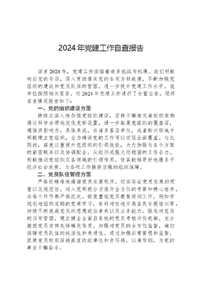2024年党建工作自查报告回首2024年,党建工作面临着诸多挑战与机遇。我们积极响应党的号召,深入贯彻落实党的各项方针政策,不断加强党组织的建设和党员队伍的管理,进一步提升党建工作水平。我单位按照相关要求,对2024年党建工作进行了全面自查。现将自查情况报告如下:一、党的组织建设方面持续且深入地加强党组织建设,坚持不懈地完善组织架构通过科学合理地优化支部设置,进一步拓展党组织的覆盖面,增强其影响力。具体来说,在诸多基层单位,或者新兴领域中积极建立党组织,全力确保党的工作可以实现全面覆盖。与此同时,高度注重提升党组织的引领效能,大力加强与各个方面的紧密联系以及协调配合,从而形成强大而稳固的工作合力。积极推动党组织在各领域的引领作用,使其能够更好地服务于经济社会发展,为各项工作提供坚强的组织保障。二、党员队伍管理方面严格而精准地遵循党员发展程序,切实保证党员发展的质量以及规范性。对入党积极分子展开全方位的考察和精心培养,在每个环节都严格把关。极度重视党员教育培训工作,例如有规划地组织定期的党课学习,有针对性地开展各类专题培训等,持续不断提高党员的思想政治素养以及业务能力。强化对党员的日常管理,建立健全全面且系统的党员考核评价机制,充分激励党员发挥先锋模范作用。加强对党员的全方位监督,确切保障党员队伍的纯洁性和先进性。通过加强日常管理和监督,促使党员时刻保持高度的纪律性和责任感,以身作则,为党的事业不懈奋斗。三、党内民主建设健全和完善党内民主制度,构建系统完备的制度体系,以保障党员的民主权利,充分激发党员的主体作用。通过推行党务公开制度,让党员更加全面地了解党内事务,增强参与决策的积极性;建立党员意见反馈机制,确保党员的声音能够及时传达和得到回应;又或是开展党内民主评议,鼓励党员对党组织和党员干部的工作进行评价和监督。四、党风廉政建设方面全面落实党风廉政建设责任制,加强廉政教育,强化监督执纪,积极营造风清气正的政治生态。组织开展廉政教育专题讲座,提高党员干部的廉洁意识和法律意识;利用典型案例进行警示教育,让党员干部深刻认识到腐败的危害;加强对重点领域和关键环节的监督,防范腐败问题的发生;建立健全举报渠道,鼓励广大党员和群众积极参与监督,对违纪违法行为进行严肃查处。通过这些举措,推动党风廉政建设不断取得新成效,为党的事业发展提供坚强保障。五、思想政治建设方面深入且全面地学习贯彻【思想】,大力加强理想信念教育切实提高党员干部的政治觉悟与思想水平。组织开展专题学习研讨会,深入解读【思想】的内涵和要求;举办理论培训班,邀请专家学者进行系统讲解,帮助党员干部准确把握其精神实质;开展主题党日活动,通过实地考察、座谈交流等形式,增强党员干部对理想信念的坚定性。六、制度建设方面持续完善党建工作的制度体系,着重加强制度执行的监督力度,以确保党建工作能够规范有序地开展。对现有制度进行全面梳理和评估,及时修订和完善不适应工作需要的制度;制定详细的制度执行流程和标准,明确各环节的责任和要求;建立制度执行情况的监督检查机制,定期对制度执行情况进行检查和评估;加强对违反制度行为的责任追究,确保制度的严肃文可居文库——海量学习资料,手机电脑均可下载www.wenkeju.com性和权威性。通过这些措施,不断提升党建工作的制度化、规范化水平。七、党建活动开展方面创新党建活动形式,通过不断探索与实践,采用多样化的方式来开展党建活动。引入互动式学习,组织知识竞赛、专题讲座等活动,以增加党员参与的积极性和主动性。同时,丰富活动内容,涵盖政策解读、理论学习、实践探索等多个层面,以满足党员的不同需求。进一步提高活动质量和效果,确保每一次活动都具有针对性和实效性,能够切实提升党员的思想觉悟和业务能力。八、党建工作保障方面加大党建工作投入,为党建工作的顺利开展提供坚实的物质基础。增加经费支持,用于购置学习资料、举办培训活动等。加强阵地建设,打造具有特色的党建活动场所,为党员提供良好的学习和交流环境。优化党建工作的设施设备,提升工作效率和质量。通过完善各项保障措施,确保党建工作能够顺利、高效地进行,为党组织的发展和党员的成长提供有力支持。通过自查,我们的确发现了一些亟待解决的问题:1.部分党员干部思想认识不够深刻,对党建工作的重要性认识存在不足。在实际工作中,一些党员干部可能仅将党建工作视为形式上的任务,缺乏对其深层次意义的理解。这导致他们在参与党建活动时积极性不高,对党组织的决策执行不够坚决,甚至可能对党建工作的推进产生阻碍。2.党建工作的创新力度较为欠缺,活动形式呈现出单一的状况。具体表现为,常常局限于传统的会议、讲座等形式,缺乏新颖性和吸引力。未能充分利用现代信息技术和多样化的活动方式,使得党建活动在形式上相对单调,难以满足党员的多样化需求,影响了党建工作的效果