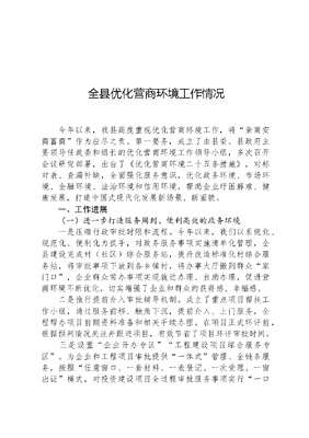 全县优化营商环境工作情况今年以来,我县高度重视优化营商环境工作,将亲商安商富商作为应尽之责、第一要务,成立了由县委、县政府主要领导任政委和组长的优化营商环境工作领导小组,多次召开会议研究部署,出台了《优化营商环境二十五条措施》,对标对表、查漏补缺,全面强化服务意识,优化政务环境、市场环境、金融环境、法治环境和信用环境,帮助企业纾困解难、健康发展,打造中国式现代化发展新场景、新面貌。一、工作进展(一)进一步打造服务周到、便利高效的政务环境一是压缩行政审批时限和流程。今年以来,我们以系统化、规范化、便利化为抓手,对政务服务事项实施清单化管理,全县建设完成村(社区)综合服务站,提升改造标准化村综合服务站,将审批事项下放到各乡镇村,将办事大厅搬到群众家门口,企业群众常办事项实现就近办理、自助办理,促进营商环境不断优化,切实增强了企业和群众的获得感、幸福感。二是推行提前介入审批辅导机制。成立了重点项目帮扶工作小组,通过服务前移、触角下沉,提前介入、上门服务,全程帮办项目前期资料准备和相关手续办理。在项目正式环评前,根据预判情况关注并跟进项目,有效节省了项目环评审批时间。三是设置企业开办专区工程建设项目综合服务专区。为企业和工程项目审批提供一体式管理、全链条服务,按照任意窗口、一套材料、一表登记、一次受理、一窗出证模式,对投资建设项目全过程审批服务事项实行一口受理、并联审批,对简易低风险项目施工图审查探索实行容缺后补机制,全力提升审批效率。同时,对在我县申请开设的企业,免费刻制首套印章。四是开设客商专用窗口。发放客商投资优待函,凭函优先办理相关手续和审批事项,今年以来我们已将13个招商引资项目函告县审批部门,为客商优先办理,提供全程帮办代办服务,并及时反馈办理结果。五是精简办税流程和手续。进一步优化增值税留抵退税办理流程,设立减税一日办专窗,精准分类分行业智能推送税收优惠政策信息,严格落实小规模纳税人免征增值税政策;持续推行非接触式办税,大力推进税费事项网上办、掌上办,通过云端窗口线上处理纳税业务,让纳税人足不出户,远程办理。(二)进一步打造公平竞争、稳定有序的市场环境一是完善生态环境监管白名单和监督执法正面清单制度。今年以来,我县持续加大白名单创建和帮扶力度,对已纳入生态环境监管白名单的9家企业,持续强化帮扶指导,减少各类现场执法检查和调研指导。加强宣传指导、安排专题培训,提升企业污染治理及无组织排放管理水平。二是推行工业项目拿地即开工。加大对工业企业支持力度,持续精简项目办理流程,对项目备案、用地规划许可证、工程预证、施工预证同步发放,做到拿地即开工。当前我县四个工业地块实行标准地出让,目前已在网上公告。三是搭建就业服务云平台。平台每天汇总县内外企业、事业单位岗位信息和就业创业政策,并以金字塔形式层层推送到各乡镇、社区、村,直至覆盖到全县劳动力群体。截至目前,在全县发布并推送了各类企业招工信息1万余条,县内外事业单位和公务员招录信息400余条,提供就业岗位数万个。四是免费为企业员工提供义诊服务和体检服务。对在我县新投资建厂的企业职工随时提供一次免费职业病义诊服务和体文可居文库——海量学习资料,手机电脑均可下载www.wenkeju.com检服务,助力企业自觉遵守《职业病防治法》,依法维护劳动者健康权益,使企业职业病防治工作正常、高效、有序健康运行;组织县医院医疗小分队入企开展义诊服务进企业职业健康暖人心主题活动,为10家入驻园区企业268名职工提供了义诊体检服务,发放职业病防治知识读本500余本。(三)进一步打造遵法守纪、公平正义的法治环境一是深入开展法律进企业活动。组织律师、公证员、法律援助工作者等,到企业宣传法律知识,累计发放民法典合同篇法律读本1400余本、法治化营商环境五项举措明白卡3000余张,引导企业自觉尊法学法守法用法。二是严格落实双随机、一公开监管。制定了《双随机、一公开监管工作实施方案》《内部联合随机抽查工作计划》和《部门联合随机抽查工作计划》,联合抽查成为日常监管主要方式,联合随机抽查覆盖面、占比率不断扩大。三是落实轻微不罚、首违免罚。对于存在轻微违法行为的经营主体,在符合规定条件的情况下,开展包容审慎柔性执法,落实轻微不罚、首违免罚。对同时满足适用条件的违法行为轻微并及时改正且没有危害后果的,不予行政处罚;对初次违法且危害后果轻微并及时改正的,不予行政处罚。(四)进一步打造多元保障、融资顺畅的金融环境一是强化企业上市激励。制定了激励企业上市措施,并对政策内容进行了广泛宣传。实施上市后备企业重点联系行制度。组织银行业金融机构为上市后备