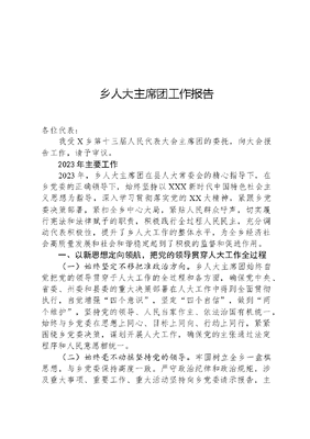 乡人大主席团工作报告各位代表:我受X乡第十三届人民代表大会主席团的委托,向大会报告工作,请予审议。2023年主要工作2023年,乡人大主席团在县人大常委会的精心指导下,在乡党委的正确领导下,始终坚持以XXX新时代中国特色社会主义思想为指导,深入学习贯彻落实党的XX大精神,紧跟乡党委决策部署,紧扣全乡中心大局,紧贴人民群众呼声,切实履行宪法和法律赋予的职责,积极践行全过程人民民主,充分调动代表积极性,提升了乡人大工作的整体水平,为全乡经济社会高质量发展和社会和谐稳定起到了积极的监督和促进作用。一、以新思想定向领航,把党的领导贯穿人大工作全过程(一)始终坚定不移把准政治方向。乡人大主席团始终自觉把党的领导贯穿于人大工作的全过程和各方面,确保党中央、省委、州委和县委的重大决策部署在人大工作中得到全面贯彻执行,自觉增强四个意识,坚定四个自信,做到两个维护,坚持党的领导、人民当家作主、依法治国有机统一,始终与乡党委在思想上同心、目标上同向、行动上同行,紧紧围绕乡党委决策,谋划开展人大工作,确保党的主张通过法定程序和人民意愿相统一。(二)始终毫不动摇坚持党的领导。牢固树立全乡一盘棋思想,与乡党委保持高度一致。严守政治纪律和政治规矩,涉及重大事项、重要工作、重大活动坚持向乡党委请示报告,主动落实乡党委的决策部署,积极推进党委有部署、法律有赋权、改革有要求、人民有期盼的事项落实,力求做到人大工作与乡党委、政府目标方向一致,使命责任相同,合心合力合拍。近年来,乡人大主席团就代表选举、人代会召开、乡村人大代表工作站联络室规范化建设、乡人大年度工作计划、重点民生项目督办、巩固拓展脱贫攻坚成果与推进乡村振兴有效衔接、农村人居环境整治提升等重点工作坚持向乡党委请示报告,切实做到在乡党委的领导下开展人大工作,在人大工作中体现乡党委的领导。(三)始终坚持不懈抓好贯彻落实。乡人大主席团始终从全乡发展大局谋划和推进自身工作,把思想和行动统一到乡党委决策部署上来,并充分发挥人大自身职能作用,聚焦县委三个大抓的安排部署,以乡村振兴为切入点,组织代表围绕事关全乡改革发展稳定的重点工作,特别是在农村人居环境整治提升、产业项目发展、招商引资等工作中,找准站位、扮好角色,依法开展监督,做到主动策应、积极跟进、全力支持,推动各项决策部署在X落地生根,为乡党委进一步完善工作思路和科学决策提供依据。二、以新标准提升质量,推动新时代人大工作高水平发展(一)两个会议高标准召开。按照法定职权和规定程序规范乡人民代表大会和乡人大主席团会议,做到程序合法、内容规范、依法履职、保障民生。去年8月,依法组织召开了X乡第十三届人民代表大会第四次会议,会前,广泛征集群众意见建议,为开好会议做足功课;会中,听取和审议了乡人民政府1至8月经济社会发展情况报告,严格会议程序,做到议程合法、程序到位;会后,扎实做好政府工作报告事项的监督,确保顺利实施。乡人大主席团按照一月一联系、一季一会议、半年一总结、一年一报告开展工作,严格按照规范化主席团建设要求,全年召开乡人大主席团会议5次。(二)议案建议高质量办理。乡人大高度重视代表议案建文可居文库——海量学习资料,手机电脑均可下载www.wenkeju.com议办理工作,在代表议案建议的提出、交办、督办等环节上下功夫,确保代表建议办理落到实处。督促交办回复乡第十三届人民代表大会第三次会议议案2件,建议和批评意见17件,配合县级部门办理县人代会意见建议8件,特别是代表提出的关于建设x光伏提水站项目的议案,经过乡党委政府多方努力,已促使项目启动实施,项目建成后将大大缓解x小组群众饮水及生产用水困难。同时,乡人大主席团高度重视在闭会期间收集代表所提建议、意见,在视察、检查、调研、代表活动期间,注重听取群众和代表的呼声、愿望,并对受理的社情民意及时与政府沟通、作出回应,做到事事有回音、件件有答复。(三)代表补选高效率完成。严格按照《云南省乡镇人民代表大会主席团工作条例》的规定开展工作,依法召开主席团会议进行人事任免。坚持党管干部和人大依法选举任免相统一,按照法定程序做好国家机关工作人员选举任免工作,实现了县委人事安排与人大代表选择的高度统一。2023年,在树密鲊选区依法补选县人大代表1名;在x选区、x选区、机关选区依法补选乡人大代表3名;按照上级党委人事安排意见,人大主席团依法召开会议任命副乡长2名。三、以新理念强化监督,着力推动重点目标任务落地落实坚持发展一盘棋的大局观念,乡人大主席团围绕全乡中心工作,认真履行宪法和法律赋予的职责,始终把监督工作放在重要位置,检查督促乡第十三届人民代表大会第三次会议政府工作报告和各项决议、决定的执行情况,听取和审查预决算等报告3项,专题调研4次,