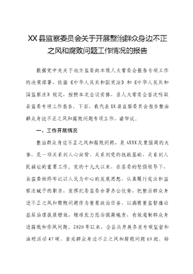 XX县监察委员会关于开展整治群众身边不正之风和腐败问题工作情况的报告根据党中央关于地方监委向本级人大常委会报告专项工作的决策部署,依据《中华人民共和国宪法》和《中华人民共和国监察法》规定,按照本次会议安排,县人大常委会首次听取县监委专项工作报告。下面,我代表XX县监察委员会报告整治群众身边不正之风和腐败问题专项工作,请审议。一、工作开展情况整治群众身边不正之风和腐败问题,是AXXX反复强调的大事,是一项关系到人心向背、关系到党的执政基础、关系到人民福祉的重要工作。党的十九大以来,在县委的坚强领导下,县监委始终牢记以人民为中心的发展思想,认真履行宪法和监察法赋予的职责,发挥纪委监委合署办公优势,把整治群众身边不正之风和腐败问题作为重要政治任务,以高质量监督推动基层治理提质增效,精准发力惩治微腐蝇贪,有效遏制群众身边腐败和作风问题。2020年以来,全县共开展各类专项监督和治理活动47项,查处群众身边不正之风和腐败问题69起,给予党纪政务处分96人,移送检察机关审查起诉34人。(一)强化政治担当,坚决履行两个责任一是县委扛牢主体责任,组织领导坚定有力。近年来,县委深入学习贯彻AXXX关于全面从严治党重要论述以及中央纪委省纪委、市纪委全会精神,严格落实五张责任清单,坚决履行全面从严治党主体责任,把整治群众身边不正之风和腐败问题摆在突出位置,健全完善反腐败协调、作风建设蜗牛奖、督导考核等工作机制,层层传达责任压力,构建履职尽责工作闭环,形成县委牵头抓总、监委监督推动、乡镇部门抓好落实的工作格局,全力整治群众身边不正之风和腐败问题,促进社会公平正义、保障群众合法权益。二是监委履行监督责任,担当作为执法亮剑。监委坚持将整治群众身边不正之风和腐败问题作为监察监督的重要内容,深入开展扶贫、交通、教育、医疗等领域腐败和作风问题专项治理、扫黑除恶打伞破网专项行动、漠视侵害群众利益问题专项治理等,在日常监督、政治巡察、专项行动中不断加强对惠民富民、脱贫攻坚等与群众切身利益相关的政策措施落实文可居文库——海量学习资料,手机电脑均可下载www.wenkeju.com情况监督检查。强化监督问责力度,拓宽信访举报渠道,从严处置问题线索,深入整治了一批优亲厚友、吃拿卡要、作风不实、失职失责等群众身边不正之风和腐败问题,切实维护群众合法利益,不断提升群众在全面从严治党中的获得感、幸福感、安全感。三是健全完善工作机制,推动治理常态长效。深入贯彻落实监察体制改革要求,抓实工作举措,全面推进乡镇监察办规范化建设,创新推出村级监察工作联络站动态循环双重监督机制,常态化开展交叉监督,全面提升基层精准发现、处置问题能力。制定《关于深化精准监督推进基层监督制度化规范化常态化的实施方案》,明确41项具体工作措施,进一步夯实监督基础。聚焦三资管理、扶贫攻坚、工程项目等重点领域,出台《XX县村级小微权力三级监督责任清单》《XX县村级小微权力负面清单》等制度,细化权力运行流程,完善监督长效机制,有效遏制侵害群众利益的微腐败发生。(二)强化基层监督,持续提升基层治理效能一是持续深化巡察监督,解决群众急难愁盼问题。聚焦政文可居文库——海量学习资料,手机电脑均可下载www.wenkeju.com治巡察定位,进一步发挥巡察联系群众的桥梁纽带作用,坚持上下一体谋划、联动协同,实现XX届县委任期内巡察全覆盖目标。2017年以来,共完成14轮次对88家单位和261个村(社)党组织的巡察任务,发现问题4965个,整改完成率99.83%,推动解决雁过拔毛、优亲厚友、违规领取津补贴等群众身边不正之风和腐败问题427个;发现并处置问题线索123件,给予诫勉谈话22人、党纪政务处分32人;追回各类违规资金771万元,挽回经济损失3872万元。聚焦打赢三大攻坚战,发现并解决突出问题267个,有效保障了上级重大决策部署在基层落地见效。做深做实巡察整改后半篇文章,探索推行巡察整改五步法量化评估办法等新模式,着力打造巡察整改闭环,相关做法得到省纪委领导批示肯定,并在全市推广。二是持续深化清廉村居建设,提升群众满意指数。实施清廉村居建设三年行动计划,有效净化农村基层政治生态,服务保障脱贫攻坚与乡村振兴战略有效衔接。积极推动村(社)治理体系现代化,探索推广纪律学堂、村干部廉洁文可居文库——海量学习资料,手机电脑均可下载www.wenkeju.com履职量化管理、村级小微权力三级监督等特色做法,织密基层监督一张网,有效提升监督质效。在全县261个村(社)设立监察工作联络站,充实村社廉情信息员796人,常态化开展交叉监督,发挥前哨和探头作用,切实管牢村级小微权力。全面打造廉洁文化矩阵,全方位挖掘提炼具有XX特色的