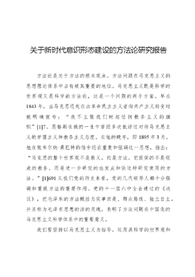 关于新时代意识形态建设的方法论研究报告方法论是关于方法的根本观点。方法问题在马克思主义的思想理论体系中占有极其重要的地位。马克思主义既是科学的世界观又是科学的方法论,这是一个问题的两个方面。早在1843年,当马克思还处在由革命民主主义者向共产主义转变时就明确宣布:我不主张我们树起任何教条主义的旗帜[1]7。恩格斯在他的一生中曾经多次批评过对待马克思主义的学理主义和教条主义态度。在他的晚年,即1895年3月,他在致韦尔纳·桑巴特的信中还在重复和强调这一思想,指出:马克思的整个世界观不是教义,而是方法。它提供的不是现成的教条,而是进一步研究的出发点和供这种研究使用的方法。[1]691从我们党的历史来看,党的几代领导人都十分强调和重视方法的重要作用。党的十一届六中全会通过的《决议》,把毛泽东的方法概括为实事求是、群众路线、独立自主,并且称为毛泽东思想的活的灵魂,表明了方法问题在中国化的马克思主义科学体系中的重要意义。我们要坚持以马克思主义为指导,运用其科学的世界观和方法论解决中国的问题,而不是要背诵和重复其具体结论和词句,更不能把马克思主义当成一成不变的教条。谱写马克思主义中国化时代化新篇章,推进实践基础上的理论创新,必须要把握好新时代中国特色社会主义思想的世界观和方法论。推进文化自信自强,铸就社会主义文化新辉煌,要坚持马克思主义在意识形态领域指导地位的根本制度,建设具有强大凝聚力和引领力的社会主义意识形态,这是我们党的重大战略任务。在新时代新形势下,做好这项工作,必须坚持以XXX新时代中国特色社会主义思想为指导,运用好新时代意识形态建设的科学方法论。新时代意识形态建设的科学方法论,概括起来,主要包括必须坚持人民至上,深刻把握意识形态建设的本质;必须坚持自信自立,确立意识形态建设的科学目标定位;必须坚持守正创新,做到意识形态建设内容为王;必须坚持问题导向,科学研判意识形态斗争形势;必须坚持系统观念,创新意识形态建设的科学方法;必须坚持党的领导,意识形态建设最根本的是坚持和维护两个确立。这些重要方面,相辅相成,相得益彰,构成一个系统的意识形态建设的方法论体系,从根本上体现了XXX新时代中国特色社会主义思想的世界观和方法论。一、必须坚持人民至上,深刻把握意识形态建设的本质文可居文库——海量学习资料,手机电脑均可下载www.wenkeju.com本质是客观事物的内部联系。马克思主义在意识形态本质问题上的基本观点是,意识形态既具有鲜明的党性,又具有鲜明的人民性,是党性和人民性的统一,这是社会主义意识形态鲜明的本质特征。只有坚持人民至上,才能深刻把握意识形态建设的本质。首先,意识形态具有鲜明的党性。意识形态具有鲜明的党性是唯物史观的基本观点。马克思主义是科学真理,同时又具有鲜明的意识形态的属性。因为它不但从根本上揭示了人类社会的基本规律和发展方向,同时又充分体现了工人阶级和广大人民群众的根本利益和愿望,并不是像有的人所污蔑的那样是什么意识形态的说教。《共产党宣言》就是向全世界公开说明自己的观点、自己的目的、自己的意图并且拿党自己的宣言来反驳关于共产主义幽灵的神话[2],是公开宣示自己的鲜明党性的伟大著作。做好意识形态工作,最根本的是坚持党对意识形态领域各项工作的领导,在举什么旗、走什么路的问题上,一定要坚决遵循党的政治路线,保持清醒的头脑,坚持把党的旗帜、意志、使命作为自己的旗帜、意志和使命,坚持在党爱党、言党、忧党、为党。高扬党的理想信念的旗帜,确保各种意识形态阵地都必须姓党、姓马、姓社,做到旗帜鲜明、一丝不苟。要牢记世界社会主义曲折历程中有些马克思文可居文库——海量学习资料,手机电脑均可下载www.wenkeju.com主义政党放弃马克思主义和共产主义理想信念而导致土崩瓦解的惨痛教训,自觉同党中央保持思想上、政治上、组织上、行动上的高度一致。要始终铭记党的事业不断发展壮大的根本保证就是靠思想上的统一、政治上的团结、组织上的严密、行动上的一致。意识形态工作者特别是领导干部,要增强四个意识,增强政治定力,站稳政治立场,要学好党性教育这门共产党人修身养性的必修课和心学,牢记党性就是最大的德,严守党的政治纪律和政治规矩,一切工作紧紧围绕党中央决策部署进行,决不能犯方向性的错误。其次,意识形态具有鲜明的人民性。人民是历史的创造者人民性是马克思主义最鲜明的品格,马克思主义是人民的理论,做好意识形态工作,必须讲人民性,这是最大的政治。坚持意识形态的人民性,就是意识形态工作要树立以人民为中心的工作导向,把实现好、维护好、发展好最广大人民根本利益作为出发点和落脚点,坚持人民至上,以民为本、以人为本。意识形态工作一定要解决好为了谁、依靠谁、我是谁这个根本问题,把服务群众、满足群众需求同教