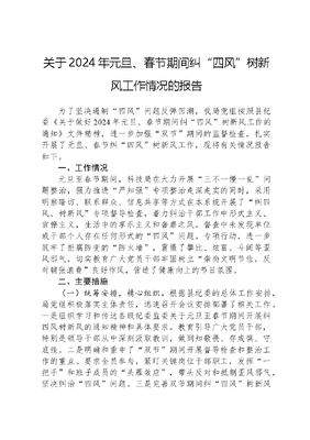 关于2024年元旦、春节期间纠四风树新风工作情况的报告为了坚决遏制四风问题反弹回潮,我局党组按照县纪委《关于做好2024年元旦、春节期间纠四风树新风工作的通知》文件精神,进一步加强双节期间的监督检查,扎实开展了元旦、春节纠四风树新风工作,现将有关情况报告如下。一、工作情况元旦至春节期间,科技局在大力开展三不一慢一乱问题整治,强力推进严知强专项整治走深走实的同时,采用明察暗访、联系群众、信息共享等方式在本系统开展了纠四风、树新风专项督导检查,着力纠治干部工作中形式主义、官僚主义,生活中的享乐主义和奢靡之风。督查中未发现单位或干部个人存在任何形式的四风问题。专项行动,进一步筑牢了拒腐防变的防火墙,震慑了攀比、炫富、斗阔等歪风邪气,切实教育广大党员干部牢固树立崇尚文明节俭,反对铺张浪费良好作风,营造了健康向上的节日氛围。二、主要措施(一)统筹安排,精心组织。根据县纪委的总体工作安排,局党组积极落实主体责任,迅速召开会议安排部署了相关工作。一是组织学习和传达各级纪委监委关于元旦至春节期间开展纠四风树新风的通知精神和具体要求。教育引导广大党员干部,特别是领导干部从中深刻汲取教训,做到知敬畏、存戒惧、守底线。二是明确和重申了双节期间开展督导检查和整治工作的重点。要求全员参与,紧盯关键岗位干部职工,发挥一把手和班子成员的头雁效应,带头反对和抵制歪风邪气,坚决纠治四风问题。三是完善双节期间纠四风树新风工作监督监管机制。按照主要领导牵头,班子成员分抓,干部全员参与的要求,在节日期间明察暗访,督促广大党员干部时刻紧绷纪律规矩之弦,确保务实节俭、文明廉洁过节。(二)把握重点,监督纠治。单位检查督导组在元旦至春节期间,坚持开展检查督导,聚焦节日期间易发多发的四风、违反中央八项规定精神和干部作风问题开展专项治理。聚焦工作落实,检查工作中是否有吃拿卡要、冷硬横推、过度留痕、指尖上的形式主义、任性决策、一刀切、层层加码等形式主义、官僚主义问题,坚决纠治总结弄虚作假,数字虚报瞒报,验收评估走过场问题。聚焦单位工作管理,检查是否有超标准、超规格、超范围公务接待问题、弄虚作假虚列接待费问题、变相公款吃喝和变相报销吃喝费用问题;接受或指示服务对象违规宴请吃喝问题等;检查是否有通过快递、电子手段等方式违规收送礼品礼金。是否有违规发放节日津贴补贴或福利,公车私用,公款旅游,酒驾醉驾等问题;是否有违规公款购买贵重物品和消费券问题,坚决纠治单位和干部的违纪违规行为。聚焦干部八小时之外,检查干部是否有违规操办或参加违规操办婚丧喜庆事宜和出入私人会所或私人会所性质的场所违规吃喝问题;检查单位干部是否存在攀比、炫富、渲染奢侈氛围等不良行为。坚决纠治各类披着年俗外衣、打着亲情幌子的作风问题,督促干部做干净事,度淳朴节,过廉洁年。(三)真抓实督,力求实效。一是狠抓督查纪律,夯实督查责任。严肃处理督察组在工作中有不担当、不作为的领导和干部,坚决防止督查工作中,讲人情、打马虎眼,有案情不报,有线索不查,有苗头不打的现象。二是配合相关部门,履行查处职能。积极配合相关部门和单位调查处理双节期间违规违纪的干部和事项,做到不包庇,不姑息,不脱责。三、后续计划节后,我局将持续发力,防止回弹,进一步对双节期间的纠四风树新风工作进行梳理,总结经验,查找不足,制定措施,强化落实,坚决将问题苗头性消灭在萌芽状态。