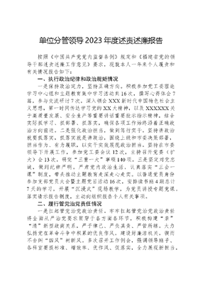 单位分管领导2023年度述责述廉报告按照《中国共产党党内监督条例》规定和《福建省党的领导干部述责述廉工作意见》要求,现就本人一年来个人履责和有关情况报告如下:一、执行政治纪律和政治规矩情况一是保持政治定力,坚持正确方向。积极参加党工委理论学习中心组和主题教育集中学习活动共16次,撰写心得体会7篇,参与交流研讨7次,深入领会XXX新时代中国特色社会主义思想,第一时间传达学习党的XX大精神,以及XXXXXX关于高质量发展、安全生产等重要讲话重要批示指示精神,结合实际抓学习、抓部署、抓落实,确保各项工作始终沿着正确政治方向前进。二是强化政治担当,做到笃行实干。坚持讲政治就要抓落实,抓落实就是讲政治,围绕上级和市委决策部署,担当作为、有为履职,以实干实效展现政治担当。坚持在市委领导下开展工作,参加党工委会议12次,主持召开党委(扩大)会13次,研究三重一大事项140项。三是坚定对党忠诚,做到纪律严明。严肃党内政治生活,认真落实三会一课制度,带头推动主题教育走深走心走实。以普通党员身份参加支部党员大会暨主题党日活动16次,安排读书班4期总计7天的学习,开展沉浸式现场教学,为党员讲授专题党课。落实请示报告制度,主动向组织报告个人有关事项。二、履行管党治党责任情况一是扛起管党治党政治责任。牢牢扛起管党治党政治责任将全面从严治党要求贯穿于各方面各环节,积极构建亲清新型政商关系,严于律己、严负其责、严管所辖。大力弘扬党在革命斗争中积累的优良作风,建设好廉洁机关,锲而不舍纠四风树新风。多次召开工作例会,强调领导班子、各科室要提标准、增效率、优作风、促落实,全力展现新担当,彰显新作为。二是紧扣任务尽职尽责。始终把落实管党治党责任作为推动工作的先导,同推共进。用好招商三张图2023年新增签约落地项目20个。三是践行四下基层凝聚合力。践行四下基层优良作风,深化单一窗口服务机制。落实党员领导干部直接联系企业制度,组织干部37名、挂钩帮扶企业45家、重点项目7个,深入到企业中去解决建设、经营中碰到的难点堵点。四是抓牢意识形态阵地建设。深入学习贯彻XXXXXX关于党的宣传思想工作的重要论述,强化底线思维、风险意识。三、推进党风廉政建设和反腐败工作方面一是勤于廉政提醒。坚持逢会必讲党风建设,必提廉洁要求。落实廉政谈话制度,与党员领导干部开展个别廉政谈话13次,及时咬耳扯袖、教育提醒。利用党委会等场合,要求全体干部职工在招商引资、项目建设等工作中,注意处理好与服务对象的关系,做到亲而有度,清而有为。在干部调整、重大节假日等关键节点,开展集体廉政谈话3场,引导干部职工知敬畏、守底线。二是深化作风建设。以身作则,带头到项目一线实地调研、督促指导、检查整治,带头攻坚重难点项目,在干部队伍中树立靠前服务、善抓落实的鲜明导向。全力支持配合派驻纪检监察组依法依规履行监督责任,修订完善财务管理制度、小额工程招投标、集中采购相关制度流程,加强对人、财、物等重点领域管理监督,及时纠正偏差,全面筑牢不敢腐、不能腐的防线。三是加强警示教育。丰富廉洁教育活动形式,组织党员开展主题党日活动,结合真实案例改编的微电影,剖析犯罪代价,引导党员干部算好人生七笔账。以案说纪,组织观看《永远吹冲锋号》《正风反腐就在身边》等警示教育片4场次,典型问题通报3次。精心完善廉洁文化教育走廊,让廉洁教育有形更有效。四、执行廉洁纪律情况方面一是树牢纪律意识。恪守党员领导干部廉洁自律各项规定自觉遵守《廉洁自律准则》《纪律处分条例》,以党纪为边、以党规为界,不断增强廉洁从政意识和遵纪守法意识。二是严格自我要求。以身作则、当好表率,要求别人做的自己带头做到,要求别人不做的自己带头不做,坚决反对特权思想,自觉净化朋友圈、社交圈、生活圈。不干预和插手政府采购、工程招投标等,从未利用职务之便为亲属和身边工作人员谋私利。三是注重家风建设。培养健康向上的家庭观念,对家人和身边工作人员下属从严要求,坚决防止利用本人职权或者职务上的影响谋取私利,做到廉洁齐家。配偶和子女没有经商办企业。五、个人存在的主要问题及今后努力的方向一年来,我认真履职尽责,恪守廉洁纪律,取得一定成效但仍存在一些差距和不足,主要表现在:一是学用结合深度不够。能及时跟进学习XXX新时代中国特色社会主义思想,但在运用创新理论推动工作方面存在一定差距,密切联系实际不够。二是管党治党压力传导不到位。虽能认真履行全面从严治党责任,但对个别关键岗位压力传导仍然不足,督促班子成员落实一岗双责、抓好党风廉政建设力度不够大。下一步,我将以XXX新时代中国特色社会主义思想为指导认真学习贯彻党的XX大精神和各级党代会、经济工作会精神,忠诚拥护两个确立,坚决做到两个维护,以党的政治建设为统领抓好各项工作。切实履行一岗