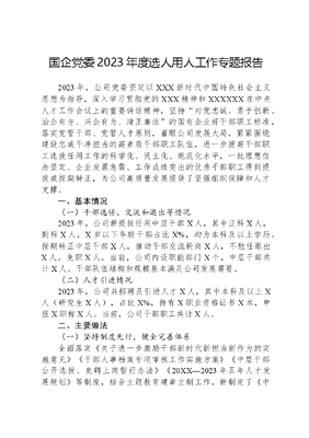国企党委2023年度选人用人工作专题报告2023年,公司党委坚定以XXX新时代中国特色社会主义思想为指导,深入学习贯彻党的XXX精神和XXXXXX在中央人才工作会议上的重要讲话精神,坚持对党忠诚、勇于创新、治企有方、兴企有为、清正廉洁的国有企业好干部职工标准,落实党管干部、党管人才原则,着眼公司发展大局,紧紧围绕建设忠诚干净担当的高素质干部职工队伍,进一步提高干部职工选拔任用工作的科学化、民主化、规范化水平,一批理想信念坚定、企业发展急需、工作成绩突出的优秀干部职工得到提拔或按期转正,为公司高质量发展提供了坚强组织保障和人才支撑。 一、基本情况(一)干部选任、交流和退出等情况2023年,公司新提拔任用中层干部X人,其中正科X人,副科X人,X岁以下年轻干部占比X%,均为本科及以上学历。按期转正中层干部X人,推动干部交流轮岗X人,不胜任退出X人,免职X人。当前,公司内设职能部门X个,中层干部共计X人,干部队伍结构和规模基本满足公司发展需要。(二)人才引进情况2023年,公司共招聘及引进人才X人,其中本科及以上X人(研究生X人),占比X%,持有X职业资格证书X本,申报X职称X人。当前,公司干部职工共计X人。二、主要做法(一)坚持制度先行,健全完善体系全面落实《关于进一步激励干部新时代新担当新作为的实施意见》《干部人事档案专项审核工作实施方案》《中层干部公开选拔、竞聘上岗暂行办法》《20XX—2023年五年人才发展规划》等制度,结合主题教育建章立制工作,新制定了《中层干部日常监督评价联席会议制度》,修订完善了《中层干部管理规定(修订版)》《中层干部公开选拔、竞聘上岗暂行办法》《机关员工考核办法(修订)》XX,公司选人用人和干部管理制度进一步完善。(二)坚持知事识人,确保人事相宜一是坚持全方位、全过程、多渠道、多层次了解干部,全面掌握干部的政治素质、性格特点、经历经验、专业特长、工作作风、群众口碑和缺点不足,做到信息采集全面,信息认定准确,为干部精准科学画像,人尽其才、才尽其用、用当其时,让干部在合适的位置上最大限度的发挥自己的才能。二是科学评价干部,既要看能力,更要看品行;既要重视结果,也要重视过程。突出实干导向,坚持有为才能有位,业绩决定升迁讲文凭更讲水平,看职称更看称职,比阅历更比业绩。三是牢固树立和践行正确政绩观,把握好潜绩和显绩的关系,将生产经营、党务、财务、法务、技术质量安全等各方面的人才充实到干部队伍之中,推动公司各项工作齐头并进、踏步发展。(三)坚持从严把关,规范选任程序一是严格执行党的政治纪律和组织纪律,严格执行干部选任有关文件,严格把关分析研判和动议、民主推荐、组织考察、讨论决议、任职等全过程,以规范化的程序提高选人用人的公信度。二是严格执行任前公示、任前谈话、任职试用期等制度,以对企业负责、对干部负责、对职工负责的态度,坚决做到履行程序一步不错、执行过程一步不少、落实要求一步不让。全面落实凡提四必,坚决防止带病提拔,为素质过硬、实干担当的干部职工能够脱颖而出创造良好条件。三是通过内部推选、竞聘上岗、人才引进、公开选拔等方式拓宽干部选拔渠道和人才晋升通道,激发干部职工干事创业的积极性。(四)坚持严管厚爱,做实管理监督坚持从严教育、从严管理、从严监督,严抓干部作风,把管思想、管工作、管作风、管纪律统一起来,做到真管真严、敢管敢严、长管长严。一是落实政治谈话制度,党委书记、纪委书记对新提拔干部开展任前谈话和廉洁谈话7人次,公司党委开展集体政治谈话X次,公司纪委开展日常谈心谈话X人次。二是抓实干部日常监督,开展了中层干部日常监督评价联席会议,凝聚起人人都是监督员、观察员、联络员的监督共识。三是落实请示报告制度,严格履行离赣报备、因公出国等审批程序,集中管理因私普通护照、港澳台通行证等证件,并做好台账。四是落实任职回避和公务回避制度,制定了《X突出问题专项治理整改工作方案》及专项治理整改清单,对中层干部和重点岗位开展了违规经商办企业和违规放贷工作自查自纠。(五)坚持树好导向,激励担当作为公司党委坚决落实党管干部、党管人才原则,在选人用人上发挥好组织领导和把关作用,强化用人导向,营造风清气正的选人用人环境。一是推动形成能上能下、能进能出的良好局面。坚持能者上、优者奖、庸者下、劣者汰,结合考核结果和现实表现,2023年度提拔任用中层干部X人,退出X人,干部队伍结构得到进一步优化。二是推动形成重视基层、崇尚实干的用人导向,新提拔干部X人任职X等关键业务部门,均具有多年项目管理或技术设计等方面的经验。三是推动形成敢于担当、勇于负责的容错机制。关心保护好有想法、有创新、有闯劲的干部,给予他们适宜的权利和资源,让他们能潜心谋事、扎实干事、善于成事,没有后顾之忧。三、存在的问题1.结构还有待优化。一是三高人才