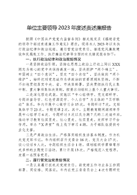 单位主要领导2023年度述责述廉报告按照《中国共产党党内监督条例》相关规定及《福建省党的领导干部述责述廉工作意见》要求,现将本人2023年以来执行政治纪律和政治规矩、履行管党治党责任、推进党风廉政建设和反腐败工作、执行廉洁纪律等方面的有关情况报告如下:一、执行政治纪律和政治规矩情况一是坚持政治引领。坚持在思想上政治上行动上同以XXX同志为核心的党中央保持高度一致,坚决拥护两个确立,牢固树立四个意识,坚定四个自信,坚决做到两个维护,始终把对党忠诚作为讲政治的首要原则来坚持,不折不扣地贯彻落实中央、省、市决策部署。坚决贯彻执行民主集中制、重大事项集体决策制,按要求向组织上报个人重大事项。二是深化理论武装。实施以中心组领学、党支部研学、专题讲座导学、红色资源促学、个人自学为主体的五学联动体系,年内开展中心组学习会15次,专题研讨7次,支部集体学习23次,专题党课2次,其中,主题教育期间高频率开展中心组学习6次、专题研讨5次以及为期7天的三次读书班,推动学习教育往深里走、往心里走、往实里走。发挥学习平台作用,举办X讲堂线上线下学习4期,为干部队伍提供专业化支撑。三是严肃政治生活。严格落实组织生活基本制度,作为机关党支部书记,年内组织召开支委会16次、党员大会17次、谈心谈话9人次,专题组织生活会1场。谋划组织学雷锋等形式多样的主题党日活动,累计开展13次。严格规范入党程序,发展一名预备党员。二、履行管党治党责任情况一是认真履行抓机关党建责任。将党建工作与业务工作同部署、同安排、同落实,年内在党工委委员会上4次专题研究党建相关工作,牵头制定年度党建工作要点、支部年度工作计划,实行党建清单制度,将党建工作任务项目化、清单式管理。以模范机关创建为导向,组织制定党工委《X2023计划》,在抓党建、带队伍、促业务中不断激发党建创新活力。二是严格落实意识形态工作责任制。认真落实意识形态工作责任制,坚持七个纳入,认真制定年度意识形态工作计划,及时开展意识形态领域分析研判,按照每年两次专题研究、两次专题汇报要求开展意识形态工作。严格把好宣传关口,做强正面宣传,年内在省级以上媒体平台获得专题报道近20篇。三是打造实干担当干部队伍。建立日常发展、墩苗锻炼、跟踪培养、严格管育、大胆使用的干部管理培养机制,年内提拔X名、晋升X名科级干部,激发队伍活力。抓好基层党组织和在职党员双报到工作,做实与X社区的共建服务,年内围绕台风灾后重建、端午节、重阳节等主题多次开展活动,充分发挥党员干部先锋模范作用。三、推进党风廉政建设和反腐败工作情况一是夯实廉洁文化建设。落实党风廉政建设责任制,年内以中心组专题学习、参观廉政教育基地、上专题廉政党课及廉政谈话等多种形式,实现反腐倡廉宣传教育常态化。二是做优作风提质服务。提升企业服务效率,牵头落实工作派单机制,年内累计协调解决问题超X个。夯实引才留才质效,推动制定出台《X人才引进若干措施》,有效补齐市级产业人才政策缺位短板。持续深化与国开行、农行、中信等金融机构的战略合作,累计协助企业获批融资超X亿元。三是提升风险防范意识。严格遵守廉政准则和各项党内监督制度,主动接受党员干部、企业和人民群众监督,坚决支持纪检监察组对党工委三重一大决策制度执行情况进行监督提醒。进一步规范人、财、物管理,严格按照上级规定开展招商工作、安排公务接待。四、执行廉洁纪律情况严格按照《中国共产党廉洁自律准则》规定的四个必须八条规范和《中国共产党纪律处分条例》廉洁纪律有关规定,时刻警醒自己守好底线,不碰红线。注重发扬民主,倾听班子意见,始终按照工作权限和工作程序履行职责,重大事项均提交集体会议审议通过。没有滥用职权、谋取私利,没有违规收受礼品礼金、经商办企业,没有存在利用名贵特产、特殊资源谋取私利情况。会议活动、办公用房、用车、住房等都严格执行有关规定,不搞特殊。坚持严以律己,勤俭节约,生活朴素,切实管好亲属、子女和身边工作人员。五、存在问题一是落实党建主体责任抓得不够紧。对于党建工作进一步提升思考得不够,传达责任和压力不够,对科室和干部的党建要求时紧时松,导致从上到下的重视程度有待提升,没能进一步推动党建与业务工作有机统一、深度融合。二是学用结合不够紧密。在学习XXX新时代中国特色社会主义思想过程中,满足于掌握基本观点、基本内容,对于如何将新思想转化为推动高质量发展、培育新质生产力方面的生动实践还不够多。六、下一步改进措施针对上述存在的不足以及今天评议的意见建议,下一步,我将重点从以下方面抓好整改落实。一是坚持政治引领,带头锤炼党性。坚定站稳政治立场,严格遵守政治纪律,树立正确的权力观、得失观、服务观,把党性锤炼作为保持先进性的必修课。坚决落实党中央和省、市各项决策部署,坚决做到听令而行、闻令而动,不打