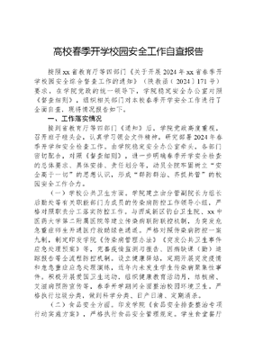 高校春季开学校园安全工作自查报告按照xx省教育厅等四部门《关于开展2024年xx省春季开学校园安全综合督查工作的通知》(陕教函﹝2024171﹞号)要求,在学院党政的统一领导下,学院稳定安全办公室对照《督查细则》,组织相关部门对本校春季开学安全工作进行了全面自查,现将情况报告如下。一、工作落实情况接到省教育厅等四部门《通知》后,学院党政高度重视,召开班子碰头会,认真学习领会文件精神,研究部署2024年春季开学和安全检查工作。由学院稳定安全办公室牵头,各部门密切配合,对照《督查细则》,进一步明确春季开学安全检查的总体要求、具体安排、责任划分等,动员全院牢固树立安全高于一切的思想认识,形成群防群治、齐抓共管的校园安全工作合力。(一)学校公共卫生方面。学院建立由分管副院长为组长后勤处等有关职能部门为成员的传染病防控工作领导小组,严格对照职责分工落实防控工作。与西咸新区钓台卫生院、xx中医药大学第二附属医院等建立传染病联防联控机制,为突发危急重症师生开通医疗救助绿色通道。严格对照传染病防控一案九制,制定印发学院《传染病管理办法》《突发公共卫生事件应急处理预案》等,完善疫情监测与报告、因病缺课(勤)追踪报告等全流程防控机制。设立健康驿站,定期开展突发疫情和危急重症应急处理演练,近年内未发生学生传染病聚集性事件。积极开展爱国卫生运动,组织健康教育活动月,结核病、艾滋病预防宣传等,春季开学期间全面整治校园环境卫生。严格执行垃圾分类,做到科学分类、日产日清、定期消杀。(二)食品安全方面。印发学院《食品安全排查整治专项行动实施方案》,严格执行食品安全管理规定。学生食堂餐厅均持有有效《食品经营许可证》,严格按许可范围经营。坚决扛起食品安全主体责任,将食品安全纳入学院年度工作要点,严格执行以院长为第一责任人的食品安全责任制,健全食品安全责任体系。餐厅依法配备食品安全总监、食品安全员,制定风险管控清单,严格落实日管控、周排查、月调度制度。严把进校餐饮公司招投标程序,规范签订、落实承包经营合同。实施明厨亮灶,学校食堂智慧监管接入省校园安全视频监控系统,定期维修保养设备。扎实开展有害生物防治,各类防护设施配备到位。严格落实学生营养改善计划等,建立集中用餐信息公开制度。畅通食品安全投诉渠道,每月发放问卷调查,主动接受师生监督。大力提倡光盘行动,树立节约风尚。严格执行《招标采购管理办法》等,公开招标、定点采购大宗食品。规范管理餐饮从业人员,从严落实安全培训、持证上岗、晨检等制度。严格按标准、按程序落实食品原料存储、加工制作、供餐配送、留样记录、餐具消毒等制度,定期督导检查,确保食品安全零事故。(三)生活、饮用水管理方面。学院健全完善安全饮用水管理制度,实行学院法定代表人为饮水安全第一责任人的责任机制,配备饮水卫生管理员。集中供水、二次供水卫生许可证,供、管水人员健康合格证明和卫生培训合格证明健全完备。严格按招标流程确定桶装水供应企业,在合同中明确规定桶装水的生产、运送、质检等安全环节,从严监督监管。春季开学前对学校生活饮用水集中式供水设备进行全面清洗消毒及水质检测,由专业第三方机构对二次供水进行详细检测,出具水质化验报告、水池清洗消毒报告31项,确保校园用水安全。(四)校园安全管理方面。1.安全责任落实。学院党政坚持将安全稳定工作作为重要政治任务,上年度召开党委常委会2次、院长办公会1次,研究部署安全稳定工作。认真贯彻党政同责、一岗双责、齐抓共管、失职追责要求,严格落实安全稳定一票否决制,纳入部门和个人年终目标责任考核指标。2.三防建设。学院与派出所共建警务室,安保队伍配备齐全,学生公寓、围墙等关键位置,高清监控探头、人脸识别门禁系统等运转良好,巡逻车、对讲机等安保器械齐备,全天候立体防控网络健全完善。3.消防安全。严格按照《xx省学校消防安全标准化管理规则(试行)》要求,建立健全各项消防安全规章制度,聘请专职消防工程师1人。按时检查、检测消防设备、台账,组织消防演练。4.国家安全。将国家安全教育纳入专业人才培养方案和公共必修课,利用国家安全日等时机,加强世情、国情和省情教育、总体国家安全观教育,引导学生正确认识国际国内热点问题。5.安全宣传教育。充分发挥两课作用,引导大学生树牢安全意识,安全教育类课程每学年24课时。扎实开展八五普法教育、心里宣传季等,师生安全法制意识不断增强。6.预警预防。严格落实安全信息第一时间报送,完善心理危机预防、筛查、干预和治疗工作制度,密切关注学生思想动态,及时发现并解决学生遇到的困难和心理健康等问题。认真落实《xx省学生校内死亡案事件应急处置工作机制》等,上年度稳妥处置学院2起事件。7.应急管理。严格落实三级值班制度,重点要害部位实行24小时值班。制定学院《突发公共事件应急预案》,涵盖各