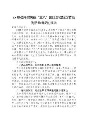 xx单位开展庆祝三八国际劳动妇女节系列活动情况的报告省直机关工会:2024年是新中国成立75周年,是实现十四五规划目标任务的关键一年,是推动吉林全面振兴率先实现新突破的开篇之年,也是全面落实中国工会十八大精神和吉林省工会十五大部署的开局之年。在第114个三八国际劳动妇女节到来之际,按照省直机关工会《通知》要求,结合我院实际情况,围绕多彩吉林奋斗有我主题活动目标,我院组织开展了内容丰富、形式多样的三八国际劳动妇女节庆祝活动。旨在进一步丰富女性干部职工文化生活,弘扬争先创优、建功新时代的巾帼担当精神,此次活动共有20余名女性干部职工参加,活动现场气氛热烈。具体活动情况如下:一、送品质生活,组织女职工学习烘焙技术充分利用我院拥有独立的职工食堂这一优势,3月6日,在二级巡视员关欣同志带领下,我院30多名女职工参加了烘焙技术的学习,食堂面点师傅为大家展示了揉、搓、擀等制作面点技巧,并请少量女职工进行了实操演示。活动结束后,大家纷纷表示,这次活动开展得非常有意义,通过这次培训学习,掌握了一些做面点的生活技能,同时也希望工会以后要多多开展此类的活动,进而提升家庭生活品质。二、送健康生活,组织女职工环伊通河健步行活动充分利用我院距离伊通河人行步道近的优势,组织三八国际劳动妇女节·伊通河健步行主题活动。3月7日11时,在院门前举行了健步行启动仪式,党组书记、院长xx同志为全院女职工送上节日的祝福,对女职工们为我省哲学社会科学事业作出的贡献给予了肯定,领导班子全体女领导与全院女职工进行了合影留念。午餐后,在院领导的带领下,部分女职工参加了伊通河自由大路至南湖大路段环伊通河健步行活动。自12:30开始,全程近2个小时,大家一致表示身心感觉非常愉悦,这次健步行活动促进了我院不同部门、不同处室之间女职工们的交流和友谊。三、送榜样力量,组织女职工收听观看巾帼劳模宣讲直播响应号召,认真贯彻落实上级相关指示精神,机关工会向各工会小组转发了《巾帼匠心逐梦强国复兴有我全省示范性劳模宣讲活动》文件通知,组织全院干部职工及时进入直播间,收听观看巾帼劳模李虹彦、李雪飞、卢德平同志报告,学习感悟新时代劳模精神、劳动精神、工匠精神,增强干事创业、攻坚克难的信心和责任感、使命感。四、送温暖献爱心,精心为女职工准备节日纪念品为使三八节活动纪念品更符合女职工的实际需求,机关工会精心谋划,与净月区麦德龙精品超市合作,为女职工贴心准备了洗护生活用品、洁面护肤用品、女性卫生用品等十种套餐纪念品,让大家按需选择,虽然纪念品花费不多(人均不足100元),但起到了花小钱办大事的作用,女职工们选到了自己可心的纪念品,增加了节日喜庆的热烈氛围,增强了女职工委员会的凝聚力、影响力和号召力。本次活动的成功举办,不仅丰富了职工的文化生活,也展现了我x职工积极向上的精神风貌。通过这样的集体活动,职工们的身心得到放松,工作效率和团队凝聚力也得到了提升。未来,xx将继续举办更多形式多样的文体活动,为职工们创造更加丰富多彩的文化生活,促进xx文化的繁荣发展。激励职工以更加饱满的热情和更加团结的状态,为xx的高质量发展贡献自己的力量。文可居文库——海量学习资料,手机电脑均可下载www.wenkeju.com