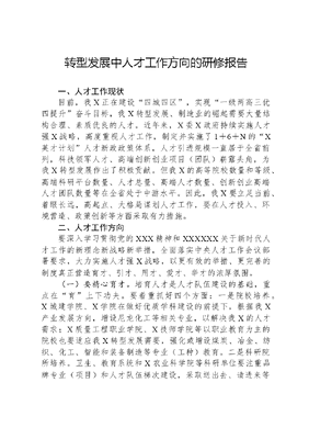 转型发展中人才工作方向的研修报告一、人才工作现状目前,我X正在建设四城四区,实现一级两高三优四提升奋斗目标,我X转型发展、制造业的崛起需要大量结构合理、素质优良的人才。近年来,X委X政府持续实施人才强X战略,高度重视人才工作,制定并实施了1+6+N的X英才计划人才新政政策体系,人才引进规模一直居于全省前列,科技领军人才、高端创新创业项目(团队)崭露头角,为我X转型发展作出了积极贡献。但我X的高等院校数量和等级、高端科研平台数量、人才总量、高端人才数量、创新创业高端人才团队数量等在全省处于中游水平。因此,我X要立足当前、着眼长远,高起点、大格局谋划人才工作,要在人才投入、环境营造、政策创新等方面采取有力措施。二、人才工作方向要深入学习贯彻党的XXX精神和XXXXXX关于新时代人才工作的新理念新战略新举措,全面落实中央人才工作会议部署要求,大力实施人才强X战略,以更有效的举措、更完善的制度真正营造育才、引才、用才、爱才、举才的浓厚氛围。(一)要精心育才。培育人才是人才队伍建设的基础,重点在育上下功夫。要着重抓好四个方面:一是院校培养。X城建学院、X学院在做好优质学科建设的前提下,根据我X产业发展方向,增设尼龙化工等相关专业,以解决我X的人才需求;X质量工程职业学院、X技师学院等以职业教育为主的院校也要适应我X转型发展需要,强化或增设煤炭、冶金、纺织、化工、智能和装备制造等专业(工种)教育。二是科研院所培养。卫生、教育系统和X农业科学院等科研单位要注重品牌专业(项目)和人才队伍梯次建设,采取送出去、请进来等多种方式,在科研生产工作实践中,不断提升现有专业技术人员的能力水平。三是企业培养。大力开展人人持证、技能X工作,在X公司等大中型企业突出技能大师工作室和首席技师等高端引领作用,广泛实行企业新型学徒制、开展岗位练兵比武活动,对小微企业和个体工商户,依托职业院校、社会培训机构、行业协会等广泛开展培训,提升现有从业人员的职业技能水平。四是平台培养。依托我X现有的技术转移中心、国家省重点实验室、创新创业园区、院士工作站、中原学者工作站、博士后科研工作站、博士后创新实践基地等高端科研平台,在实现科研成果转化的同时,培养一批本土人才。(二)要真心引才。引进是壮大人才队伍、改善人才结构的重要途径,重点在引上做文章。着重抓好三个方面:一是重点抓好高端项目(人才)引进。近年来,我X引进的铜提纯、制药等项目,催生了X有限公司、X有限公司等一批高科技企业,随着企业的发展壮大,会形成一批新兴产业链。在政府层面,要主动作为,积极争取引进一批拥有关键核心技术,有望提升我X产业水平,引领带动产业发展,产生显著经济和社会效益的高端创业团队项目和有较好X场前景,自带资金、项目、资金来我X发展的资本引才创业团队项目。在企事业单位层面,要解放思想,真正认识到科技是第一生产力人才资源是第一资源,炼化为自我革新的内在动力;要抢抓机遇,依据本单位的优势和潜能,紧靠国家产业政策,紧盯最新科研成果,紧切X场需求,谋划引进一批产品更新换代的项目。二是持续抓好返乡创业、归根工程。狠抓返乡创业是实现乡村振兴的需要、是推动我X产业发展的需要、是解决三农问题的需要、是加快社会治理现代化的需要。通过促进返乡创业,实现人才回归、技术回归、资金回归、项目回归。三是持续抓好招才引智工作。连续四年的招才引智,我X成果显著,共参加连续四年的招才引智,我X成果显著,累计组织参加线上线下各类活动共计X场次,共征集X家次企事业用人单位,提供文可居文库——海量学习资料,手机电脑均可下载www.wenkeju.comX个人才需求岗位,线上线下累计接收求职简历X份,达成就业意向X人,已累计签约入职X人。要用好舞台,真唱戏、唱好戏。(三)要着心用才。使用是发挥人才作用、推动事业发展的根本所在,重点在用上见实效。一是重在积极营造。创造机会,让想干事的人有机会;搭建平台,让能干事的人有平台;提高地位,让干成事的人有地位的良好环境,让事业激励人才,让人才成就事业。二是必须做到用当尽才。人才最大的愿望就是有所成就,最大的顾虑是英雄无用武之地。要让人才真切感受到有用武之地、有发展前途。不仅要帮助人才解决实际困难,解除后顾之忧,让人才安心干事,还要使人才的创造性劳动得到应有的回报,受到社会的尊重。(四)要倾心爱才。爱惜人才是扩大人才规模的充要条件,重点在爱上现真章。要善待人才。不仅是要在能力上给予其肯定,还要在物质生活上给予其保障。待遇与能力相当,物质与精神共同鼓励,让人才感受到自己的付出所带来的回报。要着重抓好两个方面:一是抓好政策落实。为了解决人才后顾之忧,我X已经出台了一系列政策,主要包括户口迁入、社会保障、子女入学、配偶就业、老人康养、薪酬补贴、