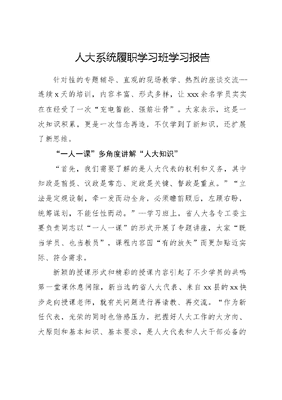 人大系统履职学习班学习报告针对性的专题辅导、直观的现场教学、热烈的座谈交流⋯⋯连续x天的培训,内容丰富、形式多样,让xxx余名学员实实在在经受了一次充电蓄能、强筋壮骨。大家表示,这是一次知识积累,更是一次信念再造,不仅学到了新知识,还扩展了新思维。一人一课多角度讲解人大知识首先,我们需要了解的是人大代表的权利和义务,其中知政是前提、议政是常态、定政是关键、督政是重点。立法是定规设制,牵一发而动全身,必须瞻前顾后,左顾右盼,统筹谋划,不能任性而动。⋯⋯学习班上,省人大各专工委主要负责同志以一人一课的形式开展了专题讲座,大家既当学员、也当教员,课程内容因有的放矢而更加贴近实际、符合需求。新颖的授课形式和精彩的授课内容引起了不少学员的共鸣第一堂课休息间隙,新当选的省人大代表、来自xx县的xx快步走向授课老师,就有关问题进行再请教、再交流。作为新任代表,光荣的同时也倍感压力,把握好人大工作的大方向、大原则和基本知识、基本要求,是人大代表和人大干部必备的基本功,也是履行好宪法和法律赋予各项职责的前提条件。我认为,这样的培训学习真的太有必要了!一番交流后,xx感慨不已。本届省人大代表和各市(州)县(区)人大常委会负责同志中许多是新任的,大家对人民代表大会制度和人大工作需要有一个学习和熟悉的过程。即便是连任代表、人大老兵,随着社会主义民主政治建设的深入推进、人民代表大会制度的完善发展,也需要有一个再学习、再认识、再提高的过程。因此,必须通过学习培训进一步加深对XXXXXX关于坚持和完善人民代表大会制度的重要思想的认识,进一步坚定走中国特色社会主义政治发展道路的信心,进一步增强依法履职的责任感和使命感。省人大常委会人代工委主任xx增告诉记者。现场教学全方位汲取他力量来到xx教育基地,在重温党史中感悟红船精神,传承红色基因;身处五四宪法历史资料陈列馆,在追溯历史中增强宪法意识,维护宪法权威;在xx区xx街道,通过实地观摩人大代表联络中心站的建管用情况,学比赶超的动力更加充沛;走进xx县x村,现场学习生态文明建设的浙江经验,身临其境感受生态之变、生态之美⋯⋯四场现场教学各具特色,让学员在学习xx经验的同时,也真切获得了前行的力量。文可居文库——海量学习资料,手机电脑均可下载www.wenkeju.comxx是中国共产党建党的起点,这次学习班专门安排了南湖现场教学,就是要让我们深切体会开天辟地、敢为人先的首创精神,坚定理想、百折不挠的奋斗精神,立党为公、忠诚为民的奉献精神,进而恪守忠诚之心、答好信仰之问,恪守为民之心、答好情怀!这样的学习经历,不仅对各级人大代表来说意义重大、对我们人大人也同样充满教育意义。省人大教科文卫委主任委员xxx说。学习班将杭州市人大代表联络站作为现场教学点之一,这让所有代表们都充满期待,在现场仔细看、虚心学、详细问,有的代表在听讲解时还打开了录音,大家在虚心学习的同时、都希望把先进经验、优秀做法、好的思路带回去、转化好。这个现场教学,我觉得可以称之为精准滴灌!在提交的学习总结中,来自xx族自治州的省人大代表xx写道。这次学习班时间虽短,但规格高、形式新、内容实、安排活,同时,学习氛围浓、组织纪律严。尤其值得一提的是,参加人员层级多,常委会副主任带头作专题辅导报告凸显了省人大常委会的高度重视。整个课程设置涵盖生态文明、乡村振兴、党性教育、人大工作、代表履职等方面,贴近实际、符合需求。从学员的反馈来看,可以说得到了大家的一致认可。xx增补充说。文可居文库——海量学习资料,手机电脑均可下载www.wenkeju.com集思广益在交流讨论中升华学习成果时间飞快,学习班很快迎来结业仪式,拿到各自的结业证书后,学员们展开了一场精彩的交流讨论。作为一名连任代表,我认为自己也有必要进一步提高综合素养,增强联系群众能力、视察调研能力、思考表达能力等等,不断拓宽知识面,丰富和完善知识结构,适应新时代人大工作创新发展的新需要。连任两届全国人大代表的xx,通过学习培训,对自身履职有了新的认识。通过学习,我们提高了讲政治、善履职的能力,在日常工作中,要把学习贯彻XXXXXX关于坚持和完善人民代表大会制度的重要思想作为必修课,在全面学习、全面把握、全面落实上下功夫,结合实际、结合职责深学笃行,不断提高做好新时代人大工作的政治站位和理论水平。作为地方人大常委会负责人,xx自治州人大常委会主任xx有着自己的思考。有着十余年人大代表身份的xx届省人大代表xx章则感慨:有幸和来自全省不同地区、不同战线的代表们相聚在一起成为同学,真让人高兴。这些年来,通过认真履职,我的很多建议都落实下来了,履职信心不断在增强,作为代表,我们的职责就