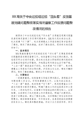 XX局关于中央巡视组巡视回头看反馈基层党建问题整改落实情况督察工作反馈问题整改情况的报告按照关于中央巡视组巡视回头看反馈基层党建问题整改落实情况督察工作反馈问题清单,XX局从党内政治生活、机关党建灯下黑、机关党建重点工作落实情况等方面进行了整改,制定了整改措施,抓好了整改落实,现将有关情况报告如下:一、基本情况XX局高度重视中央巡视组巡视回头看反馈基层党建问题整改落实情况督察工作。收到督察工作组反馈问题后,局党组召开会议进行部署,要求机关党委立即按照反馈问题组织全局基层党组织立即整改,共梳理出党内政治生活不够严格、三会一课制度落实不到位、机关党建灯下黑、机关党建重点工作落实不到位等问题,并坚持立行立改、常抓不懈的原则,制定了整改措施,整改工作全部完成。二、主要做法一是高度重视。收到督察工作组反馈问题后,局党组召开专题党建工作会议,研究部署整改工作,从党内政治生活、三会一课制度、机关党建灯下黑、机关党建重点工作落实问题等方面进行整改,明确了整改工作的总体要求和主要任务。二是细化责任。以督察工作组指出的问题为核心,全面梳理、分类研究了机关党建工作开展情况,明确了问题原因,找准了问题症结,建立了整改台账,逐条明确了责任目标和时限要求,确保事事有着落、件件有回音。各基层党组织按照整改任务分工,制定具体整改措施,形成了压力层层传导、责任层层落实的整改工作局面。三是狠抓落实。局党组切实承担起整改的主体责任,专题研究推进整改工作。责成机关党委随时调度整改情况,对每项任务落实情况进行跟踪,确保整改工作有序推进。三、整改情况(一)党内政治生活不够严格问题整改情况一是规范党内组织生活制度。把开展党内政治生活、党员在严格的党内生活中接受教育、增强党性作为重要的政治纪律,严格落实组织生活会、谈心谈话、民主评议党员和党员领导干部民主生活会等具体制度,进一步强化党内组织生活制度的执行力,杜绝党内组织生活随意化、平淡化,对不按时或不认真参加组织生活的党员,及时批评教育。二是严肃召开组织生活会。按照推进学习教育常态化制度化的具体要求,各基层党组织严格执行组织生活制度。党员领导干部要以普通党员身份参加所在党支部的组织生活会,联系思想工作实际查摆个人存在的问题、会上深入开展批评和自我批评,既有自我批评又要有党员相互批评,对查摆的问题有具体整改措施和整改结果报告。党支部建立党员领导干部参加双重组织生活情况档案;建立定期报告制度,党支部每半年将所在支部党员领导干部参加双重组织生活情况报机关党委,机关党委每半年向省直机关工委书面报告。(二)三会一课制度落实不到位问题整改情况一是认真执行三会一课制度。按照规定召开支部党员大会、支部委员会、党小组会,组织党员上党课。结合三会一课制度,建立了每周学习日制度,认真开展学习。同时,明确规定每月开展一次主题党日活动,强化主题党课、党性教育、党员联系服务群众等工作,调动基层党组织和广大党员做好党建工作的积极性。二是规范党支部会议记录。梳理汇总各党支部在会议记录方面存在的突出问题,制定了党支部记录标准化范本,为各党支部规范会议记录提供了依据。组织文可居文库——海量学习资料,手机电脑均可下载www.wenkeju.com各基层党组织书记召开会议,向各党支部反馈问题清单,督促其切实履行好第一责任人职责,教育监督党务干部做好党支部会议记录规范工作。(三)机关党建灯下黑问题整改情况一是落实党建工作主体责任。建立局党组工作规则,进一步明确局党组工作职责、议事决策程序和责任追究事项,压实党组书记第一责任人责任和党组成员一岗双责,全面落实党建工作主体责任。严格执行定期议党、专题议党制度,明确每年至少定期召开2次以上综合性议党会议,凡是涉及党建方面的重要部署、重大决策、重点文件传达落实等,必须经党组会统一研究部署,并在党组会议记录上注明定期议党和专题议党。二是建立健全换届提醒制度。根据党章和《中国共产党基层组织选举工作暂行条例》等党内有关规定,全面规范基层党组织换届程序,严格基层党组织换届纪律,确保应换尽换,提高基层组织建设整体水平。建立《基层党组织按期换届台账》,列明支部基本情况、换届时间。对任期将满的基层党组织下发换届提醒通知书,按规定完成换届选举工作。(四)机关党建重点工作落实不到位问题整改情况一是完善党建工作经费制度保障。建立稳定的党建经费保障制度,规范党建工作经费的使用标准,严谨党建工作经费管理审批,及时进行党建工作经费的监督检查,有效开展机关党建工作。二是严格落实发展党员工作。认真落实发展党员计划,坚持发展党员标准情况,履行发展党员程序等工作。认真抓好党务工作者的业务培训,压实党组织的审查把关责任,切实加强督促检查,不断提高党员发展工作规范化水平。通过自查,解决了发展