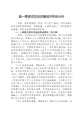 县一季度项目投资暨经济形势分析一季度,县紧紧围绕一季度开门红指标,切实加强对经济形势的预研预判、预测预警,并果断采取了一系列积极有效措施,推动全县经济高质量发展。一、一季度主要经济指标完成情况(预计数)一季度,全县地区生产总值增速实现8.6%,高于去年同期0.3个百分点;规模以上工业增加值同比增长11.6%,高于去年同期0.1个百分点;固定资产投资完成35亿元(1-2月已完成16.49亿元;3月在库项目可报投资8.2亿元,新入库项目投资总额174亿元,可报投资11.8亿元),同比增长29.2 %;社会消费品零售总额增长11.9%(1-2月已完成31.36亿元,增长10.5%),城镇居民可支配收入增速8.3%,农村居民可支配收入增速9.1%。综合研判结果,我县能够圆满完成经济开门红目标任务,经济运行总体上好于去年同期,好于预期。呈现以下特点:(一)从基本面看,增长给力。一是工业提质增效。一季度,预计107户规模工业企业完成总产值30亿元,同比增长23%。完成技改投资5亿元,同比增长30%以上,完成工业投资7.0亿,同比增长23.4%;二是项目投资后劲十足。按照四个一批的要求,我县2023年已储备项目126个,总投资X亿元,一季度项目集中开工仪式筹备工作已准备就绪,计划集中开工项目 16个,总投资21.2亿元,投资驱动成效显著;三是消费平稳增长。抓住春节前后市场消费旺季和电商进农村综合示范项目建设机遇,活跃城乡消费。四是就业较为充分。发挥劳务输入县优势,成功举办春风送岗位活动,达成就业意向4436人,实现劳动力就地转移,推动城镇就业稳步增长,城镇登记失业率低于去年同期。(二)从发展态势看,持续发力。相较于去年四季度,我县一季度经济运行态势总体上无大起大落。一是新增长点显现。固态共享电池、古城、高端智能手机及医疗器械生产线等重点项目建设等项目进展顺利。二是招商成果显著。签定正式投资协议5个,总投资15.7亿元。(三)从活跃度看,充满活力。一季度,全县私营企业、个体工商户新增个数明显高于去年同期。全县1-2月存款余额446.99亿元,同比增长8.45%;贷款余额X亿元,同比增长X%。二、存在的主要问题一季度,我县经济运行总体平稳,但依然面临持续存在的下行压力,全县经济既稳中有进,又稳中有忧。(一)经济下行压力仍然较大。1-3月,预计全县GDP增速实现8.6%,虽高于去年同期0.3个百分点,但仍与全市平均水平差距较大,发展后劲不足、较为乏力。(二)工业方面。受地形地貌和其他因素影响,一直存在招商引资签约选址后才拆迁、申报用地指标等后续手续,造成签约工业招商引资项目落地难、落地慢、成功入驻的项目少,影响工业技改投资和工业增量。(三)投资方面。企业和项目融资困难,企业资金、项目资金缺口较大,造成项目开工不足、进度滞后。政府性投资项目新的融资渠道尚未明显突破,政府性债务压力仍然较大,带来民间投资增长疲软等一些连锁影响。(四)项目方面。重大项目支撑不足,投资缺少支撑拉动。从目前在建项目看,新开工的大项目较少,支撑引领作用不明显;部分项目形象进度滞后,形成实物量不佳,投资完成情况与项目实际推进情况不协调。特别是重大产业项目较少,发展后劲不足。2023年我县全社会固定资产投资同口径增长15%,但从一季度项目集中开工仪式筹备上看,目前收集到项目16个,增量项目较少,完成全年目标任务困难较大。三、二季度工作举措文可居文库——海量学习资料,手机电脑均可下载www.wenkeju.com针对存在的问题,下一步,我们将坚持领先发展不掉队,迎难而上、攻坚克难,力争圆满完成二季度工作目标,确保实现双过半,重点抓好以下几个方面:(一)统一思想、锁定目标不动摇。2024年我县经过科学分析研判经济发展新形势和赶超进位的现实需要,确定GDP增速年度工作目标8.6%,我们将集全县之力聚焦发展,坚定不移锁定8.6%目标不动摇,定期组织好各部门提前会商,分析研判经济形势,及时、准确把握经济运行情况,主动发现经济运行中出现的苗头性、倾向性问题,其次将进一步分解细化目标任务,对照目标任务,进一步分解细化任务并限时相关主体完成,加力加压坚决完成开门红各项目标任务,为二季度目标实现双过半蓄势奠基;(二)抓工业生产。一是抓产销。抓住销售旺季,全力支持有市场、有订单的企业满负荷生产;全力支持新开工项目加快建设进度,早日投产达效;二是抓技改。走绿色发展之路,加强企业环保整治和升级改造,倒逼企业从消极被动转向积极主动,适应新常态、新门槛,实现再创业、再提升、再突破。三是抓创新。按照工业强县总体部署,重点发展鞋服纺织、大健康食品医药、高端装备及新型材料制造2+1优势产业,确保尽快形成新的增长点;加大科技创新支持力度,争创更多专利产品、专利技术。(