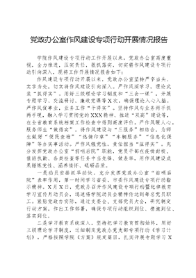 党政办公室作风建设专项行动开展情况报告学院作风建设专项行动工作开展以来,党政办公室高度重视,全力推进,压实责任,狠抓落实,切实将作风建设专项行动引向深入,现将工作开展情况报告如下:作风建设专项行动开展以来,党政办公室坚持严字当头、实字为先,切实将作风建设引向深入。严作风深学习,理论武装抓得实。用好三级理论学习制度和三会一课,开展专题学习、交流研讨、廉政党课等X次,确保理论入心入脑。严作风促事业,业务工作干得实。坚持作风与业务两手抓两手硬,融入学习贯彻党的XXX精神、推进双高建设等,在全省教育系统档案工作检查中得到高度评价。严作风暖人心,服务师生做得实。将作风建设与三服务相结合,为师生做好便民查档热情印章车辆服务信息化保障等办实事活动。严作风强党性,责任担当压得实。充分发挥党政办公室前哨后院职能,党员干部在疫情封校、值班执勤、各类检查等任务中当先锋、做表率,用作风建设成果锤炼党性、涵养情怀、砥砺品质。一是动员安排抓早动快。充分发挥党政办公室前哨后院表率作用,第一时间学习省委、市委作风建设专项行动指示精神。X月X日,党政办召开作风建设专项行动暨纪律教育学习宣传月动员会,迅速将学院动员会精神传达到每名党员职工。紧贴党政办实际,通过支委会、支部党员大会,研究制定行动方案,作出工作部署,确保专项行动组织到位、措施到位、落实到位。二是学习教育系统深入。坚持把学习教育贯彻始终,用好三级理论学习制度,过细制定党政办党支部专项行动《学习计划》,严格按照学院《方案》规定篇目,扎实开展专题学习X次、交流研讨X次,以《永葆办公室人清正廉洁的政治本色》为题组织廉政党课X次、观看警示教育片X次。建立支部督查、科室检查、个人自查三级学习监督常态机制,确保学习全覆盖。三是组织生活较真碰硬。按照会前准备充分、会上揭短亮丑、会后总结改进的步骤,认真召开严守纪律规矩、加强作风建设专题组织生活会,切实将作风建设专项行动引向深入。通过谈心谈话、征求意见、一线调研,形成作风建设问题台账X条,逐项明确整改目标、措施、时限和责任人。X月X日上午,党政办党支部组织全体党员召开专题组织生活会,围绕学习贯彻落实重大决策部署、加强作风建设、树立服务意识等X个方面,深入对照检查,扎实批评和自我批评,达到统一思想、改进作风、增进团结的效果。四是专项治理抓手有力。聚焦思想作风、工作作风、教风学风、领导作风、师德师风、廉洁自律六个专项治理,从抓迟到早退、抓佩戴口罩、抓院情院史等做起严起,确保办公室作风建设专项行动有抓手、有督查、有实效。将作风建设与推进双高建设、提升三服务质量、筑牢安全防线等相结合,推进制度废改立、院校治理课题研究、网络安全宣传教育周、乡村振兴等工作,档案工作在省教育厅检查中得到高度评价。五是服务师生成效显著。将作风建设与全面提升服务相结合,立足办公室本职业务,全心全意为师生办实事解难题。精心策划便民查档热情印章便利文印车辆服务等办实事活动,专项行动开展以来,党政办先后为师生提供档案查(借)阅X人次X件;行政盖章服务X次、学生学籍证明、雨露计划等验印服务X次;各类打(复)印X多次;车辆服务X余次,以服务质量提升检验了作风建设的显著成效。六是主体责任全面落实。支委班子认真落实作风建设主体责任,系统谋划、统筹推进,推动专项行动与学院中心工文可居文库——海量学习资料,手机电脑均可下载www.wenkeju.com作、与党政办综合协调、调研参谋、以文辅政、督查督办职能发挥、与提升党支部组织力战斗力凝聚力同频共振、相互促进。支部书记赵维认真落实第一责任人职责,带头组织学习、带头检查督导、带头推进工作,定期组织笔记批阅、心得展评、学习强国积分通报等,确保专项行动落地生根、务期见效。下一步,党政办将以专项行动为契机,进一步提高认识、夯实抓手、明确责任,锤炼优良作风、锻造过硬能力、服务学院大局,确保作风建设专项行动往深里走,往心里走,往实处走,切实做到入脑入心,见行见效。文可居文库——海量学习资料,手机电脑均可下载www.wenkeju.com