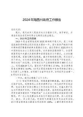 2024年海西州政府工作报告各位代表:现在,我代表州人民政府向大会报告工作,请予审议,并请各位政协委员和列席会议的同志提出意见。一、2023年工作回顾2023年是全面贯彻党的XXX精神的开局之年,是三年新冠疫情防控转段后经济恢复发展的一年。面对复杂严峻的外部环境和艰巨繁重的改革发展稳定任务,我们坚持以XXX新时代中国特色社会主义思想为指导,在州委的坚强领导下,全面贯彻落实党中央重大决策部署和省委省政府工作要求,主动把握发展机遇,妥善化解风险隐患,着力补短板扬优势,承压前行、实干担当,全力推动高质量发展,经济运行呈现形有波动、势仍向好的态势。全年地区生产总值继续保持在800亿元以上,实现828.19亿元;固定资产投资增长17.4%;社会消费品零售总额增长16.9%。12项主要经济指标中有8项保持正增长、5项高于上年增速、6项高于全省平均水平、3项位列全省第一、6项位列全省前三。一年来,我们主要做了以下工作:(一)坚定不移优生态,环境质量不断改善。我们坚持生态保护优先,统筹推进山水林田湖草沙冰一体化保护和系统治理。完成木里矿区综合整治三年行动各项任务,实施木里矿区生态环境保护条例,不断巩固整治成果。坚决抓好盐湖资源无序开发典型案例和两酸两碱企业废水晾晒蒸发排放场问题整改,举一反三起底整治各类生态环境突出问题。深入打好蓝天、碧水、净土保卫战,环境空气质量优良率完成省定目标,13个国省控地表水断面水质达标率100%,土壤环境保持清洁稳定。完成营造林6.41万亩,草原生态修复26万亩,沙化土地治理33.09万亩。都兰县获评全国防沙治沙先进集体,乌兰县入选全国生态文明建设示范区。今天的海西,天更蓝、水更清,处处呈现人与自然和谐共生的美好画卷。(二)因地制宜提质量,产业四地加快建设。我们坚决扛起产业四地建设主阵地、主战场责任,倾力构建现代化产业体系。盐湖产业提质增效,全省首个盐化工质量基础设施一站式服务平台建成运行,钾肥提质稳产技术改造等39个项目有序推进,2万吨电池级碳酸锂等14个项目建成。生产钾肥706万吨、占全国总产量的77%以上,碳酸锂11万吨、增长49.4%。清洁能源不断壮大,装机规模达1880.6万千瓦、增长40%,柴达木沙漠基地纳入国家大型基地方案,世界最大液态空气储能示范项目落地海西,全省首个绿电制氢项目投产,南山口抽水蓄能等30个项目开工建设,乌图美仁100万千瓦光伏等15个项目基本建成。生态旅游回暖升温,实施全省首部生态旅游高质量发展促进条例,建设文旅项目57个,完成投资8.27亿元,新增A级景区6家。累计接待游客1700万人次,实现旅游收入84.72亿元,分别增长136%、113%。绿色有机农畜产品扩面提标,落实各类惠农资金5.7亿元,农牧业发展基础进一步稳固。206种产品入选神奇柴达木优品库,获评国家级示范合作社4家,都兰县成功创建国家农业现代化示范区。累计认证绿色有机农畜产品471个,居全省首位。新增有机认证草场环境监测面积1.2亿亩,有机畜牧业认证实现全覆盖。今天的海西,高原资源能源优势更加凸显,现代化产业体系建设取得明显成效。(三)精准施策抓发展,经济运行总体平稳。我们坚定不移走高质量发展之路,千方百计增强经济发展的活力和韧性。严格落实粮食安全党政同责,坚决遏制耕地非农化、严格管控耕地非粮化,粮食生产再获丰收;牛羊出栏超额完成年度任务,第一产业增加值增长5%,居全省首位。助企暖企解文可居文库——海量学习资料,手机电脑均可下载www.wenkeju.com决问题535个,办结率98%。扎实推进工业经济高质量发展六大工程,完成一般性工业投资124.4亿元,增长25.8%,占全省的38%。培育入规企业8家,规上工业增加值占全省的37.7%。大力开展消费恢复提振行动,零售业、住宿业、餐饮业分别增长9.8%、24.7%、26.5%;限额以上服务业营业收入增长29.5%,第三产业增加值增长10.6%,居全省首位。今天的海西,发展动能更加强劲,在全省大局中的支撑作用愈加明显。(四)改革开放激活力,发展后劲持续增强。我们坚持以改革创新为动力,着力破解影响高质量发展的瓶颈制约。深化行政管理服务改革,公共服务网办率提升至96.6%,营商便利度进位全省第二,市场主体增长3.94%。100项重点改革稳步推进,祁连山国家公园体制试点承接任务全面完成,州县两级疾病预防控制局挂牌成立。对外开放不断深化,开行国际货运班列118列,占全省的76.6%,完成进出口总值4.94亿元。开通德令哈直飞杭州航线,复兴号动车首次驶入柴达木。落实援青资金2.57亿元实施产业发展、民生改善等项目98个,开展浙江—海西亚运交流年系列活动,对口支援进一步深化。科技创新成果不断涌现,申报高新技术企业9家,认定科技型