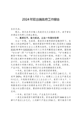 2024年双古镇政府工作报告各位代表:现在,我代表双古镇人民政府向大会报告工作,请予审议并请各位列席人员提出意见。一、真抓实干,奋力前进,过去一年屡创佳绩过去一年里,在县委、县政府及镇党委的坚强领导下,在镇人大的法律监督下,镇政府团结和带领全镇人民坚持以XXX新时代中国特色社会主义思想为指导,认真学习宣传贯彻党的XXX精神和XXXXXX对四川工作系列重要指示精神,围绕镇1+1+4(即1为副中心镇发展定位和规划;1为建设川南茶叶特色小镇;4为打造优质茶叶基地、砂溪十二景、赵熙文脉走廊和幸福塘水景区发展布局规划),战略布局按照产业兴旺、生态宜居、乡风文明、治理有效、生活富裕的要求,扎实推进乡村振兴建设,努力实现农业强、农民富、农村美、产业兴旺,切实推动全镇经济社会持续健康稳定发展。一年来,我们稳中求进,经济建设提质增效。完成固定投资4.6亿元;引进省外产业项目2.43亿元,完成率202%;新签约重大项目1个;规模以上工业总产值完成5.5亿元。升规培育规模以上工业企业1户、商贸个体1户、个转企1户,双古镇荣获国家农业产业强镇(茶叶)。投入财政衔接推进乡村振兴补助资金共计275万元,长林村获四川省第三批乡村治理示范村、晏家桥村荣获2023年度荣县乡村振兴示范村。一年来,我们实干为先,产业生态齐头并进。一是扎实推进茶叶高质量发展,新造油茶面积3000亩全年鲜叶产值达1.3亿元,人均鲜叶产值达3700元,健叶春茶叶种植家庭农场荣获四川省第一批10+1家庭农场典型案例农场,春兰茶业有限公司被县委、县政府表扬为2022年度荣县优秀新型农业经营主体。二是壮大提升集体经济,全镇12个村集体经济收入合计400万元,其中:双古村、晏家桥村集体经济收入分别达到100万元。双古镇被认定为首批国家农业产业强镇,被表彰为荣县三区建设先进集体。三是生态农业稳步发展,加强耕地保护,整治撂荒地82.67亩,完成农作物播种8.56万亩。耕地地力保护补贴2.29万亩、310.2万元。抓好农技推广服务,推广稻药400亩,稻菌100亩,稻虾1800亩。强化林业生态建设,推动森林防灭火工作,退耕还生林抚育政策0.45万亩、9.16万元;兑现公益林面积0.9万亩、14.43万元。四是乡村振兴承上启下,持续推进项目建设,投入财政衔接推进乡村振兴补助资金共计275万元,其中:75万元(财政投入50万元,农户自筹25万元)用于脱贫户、监测户发展种养殖业;155万元用于双古村2023年衔接资金产业配套设施建设项目;70万元用于四合厂村2023年衔接资金基础设施建设项目。晏家桥村被县委、县政府命名为2023年度荣县乡村振兴示范村。一年来,我们务实笃行,民生福祉持续巩固。一是基础设施不断完善,完成2019年村道公路建设项目、双古村村道公路建设项目;实施2023年农村路网工程第一批10.948公里,完成申报第二批17.271公里。整治道路交通安全隐患,实施高跳登、大车堰、黄家坝村便民桥及范家村安全护栏工作。二是社会事业全面发展,积极开展就业援助,建立了两个农民工综合服务站,申请贫困户跨省就业一次性交通补贴98人,下拨资金1.96万元;发放18.37万元用于解决城乡困难居民突发性、临时性基本生活困难;开展全镇1021名退役军人及其他优抚对象、现役军人家属走访活动,为现役军人家属悬挂光荣牌10块。三是生态环境明显改善,开展沙河涉河建筑物全部河湖遥感图斑核查、妨碍河道行洪突出问题排查,及渔业文可居文库——海量学习资料,手机电脑均可下载www.wenkeju.com养殖尾水排放排查等行动,检修提灌站7个。设立14个村(社区)河长工作室,建立村民河湖管护三不四要村规民约,开展七进宣传活动10次,17个河湖疑似问题图斑复核举证销号完成。严厉打击毁林开荒、乱砍滥伐,森林资源得到有效管护。一年来,我们慎终如始,社会大局和谐稳定。一是积极开展国家安全宣传与禁毒、反诈等相关工作,发放宣传资料1000份,悬挂横幅14幅,安装国家反诈APP1625人次。二是强化重大风险化解,共排查调处民事矛盾纠纷205起,成功率97.5%;受理21件信访案件,满意率100%;处理人民网、问政四川、政府网等网上咨询事项21件,均得到及时回复。共发放18.37万元用于解决城乡困难居民突发性、临时性基本生活困难。双古镇荣获自贡市五星级爱心血库单位。三是深入抓好防灾减灾救灾,扎实开展应急演练活动,修订完善双古镇突发公共卫生事件、山洪地质灾害、防汛抗旱、动物疫情等应急预案;强化森林防灭火安全,共书写墙标、岩标2000多幅,发放资料30000多份,出动宣传车122次。成功确保2023年成都大运会期间社会大局稳定。双古镇长林村获评四川省第三批乡村治理示范村。一年来,我们履职尽责,自身