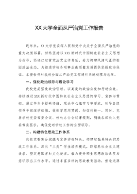 XX大学全面从严治党工作报告近年来,XX大学党委深入贯彻党中央关于全面从严治党的重大决策部署,始终坚持以XXX新时代中国特色社会主义思想为指导,坚决扛起管党治党主体责任,着力构建风清气正的校园政治生态,为推进学校各项事业高质量发展提供坚强政治保证。本报告将对我校全面从严治党工作进行系统梳理与总结。一、强化政治领导与理论学习我校党委强化政治引领,以高度的政治自觉和行动自觉,持续推动XXX新时代中国特色社会主义思想的学习、宣传与贯彻。通过举办专题研修班、理论中心组学习等形式,引导各级领导干部深学细悟,做到学思用贯通、知信行统一。同时,完善学校党委常委会议、校长办公会议事规则,明确各部长入党委常委要求,确保党对学校工作的全面领导。二、构建特色思政工作体系我校党委充分挖掘与发挥侨校特色,构建起独具特色的思政工作体系。深化三类学生培养模式,即培养社会主义建设者、坚定爱国者和文化使者,着力提升师生思想政治素质与意识形态工作水平。通过丰富多样的思政教育活动,营造浓厚的爱国主义氛围,厚植师生家国情怀,确保立德树人根本任务的有效落实。三、聚焦党建主业,夯实根基我校党委坚持把抓好党建作为最大政绩,着力夯实党建根基。严格规范党支部会议制度,实现教师党支部书记双带头人全覆盖,提供充足的组织员、经费和党员活动场所等保障条件。创新开展一党委一品牌,一支部一特色党建品牌活动,激活基层党组织活力,增强党组织的凝聚力和战斗力。四、全面从严治党,净化育人环境我校党委坚持全面从严治党,构建起完善的全面从严治党制度体系和具有侨校特色的监督体系。修订干部选拔任用工作办法,严抓干部选拔考核监督管理,确保选人用人风清气正。积极开展巡察工作,对二级党组织进行全面、深入、细致的监督,及时发现并整改问题,持续推动学校政治生态向好发展。五、破解党建责任传导难题针对党建责任传导存在的上热、中温、下凉现象,我校党委制定实施《党委常委联系基层党组织党建责任制》,强化党的路线方针政策的贯彻执行,压实院系党组织主体作用。修订相关制度,规范院系党组织会议和党政联席会议制度,明确党的建设重大事项的决策程序,确保党建工作责任逐级压文可居文库——海量学习资料,手机电脑均可下载www.wenkeju.com实、层层到位。六、推进纪检监察体制改革我校党委积极响应高校纪检监察体制改革要求,支持并推进双重领导体制的落地生根,确保党对纪检监察工作的领导和监督。制定相关指导性文件,推动双重领导体制具体化、程序化、制度化,增强纪委独立性和权威性,强化上级纪委对下级纪委的领导,有力推动党风廉政建设和反腐败斗争向纵深发展。面向未来,XX大学党委将持续深化纪检监察体制改革,进一步落实双重领导体制,强化党内监督,巩固和发展全面从严治党成果。同时,以更严的标准、更实的举措、更大的力度,推动学校全面从严治党工作再上新台阶,为实现学校发展战略目标、培养时代新人提供坚实政治保障。XX大学党委始终牢记立德树人初心,坚守为党育人、为国育才使命,以全面从严治党为引领,不断提升党建工作科学化、规范化水平,为学校各项事业的高质量发展筑牢坚实根基。文可居文库——海量学习资料,手机电脑均可下载www.wenkeju.com