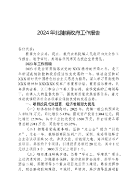 2024年北陡镇政府工作报告各位代表:根据大会安排,现在,我代表北陡镇人民政府向大会作工作报告,请予审议,并请各位列席同志提出宝贵意见。2023年工作回顾2023年是全面贯彻落实党的XXX精神的开局之年,是三年新冠疫情防控转段后经济恢复发展的一年。镇政府坚持以XXX新时代中国特色社会主义思想为指导,深入学习贯彻党的XXX精神和XXXXXX视察广东重要讲话、重要指示精神,认真落实省委、江门和台山市委工作安排,在镇党委的正确领导下,在镇人大的监督支持下,围绕高质量发展首要任务,着力推动我镇经济社会各项事业保持良好的发展态势。一、项目投资成效显著,经济发展潜力更足(一)经济指标平稳向好。2023年,我镇一般公共预算收入871.71万元,同比增长6.43%;固定资产投资2.304亿元,同比增长12.94%,其中工业技改投资1680万元;社会消费品零售总额2941万元,同比增长15.05%。(二)招商引资成果丰硕。坚持走出去助力引进来,过去一年,我镇招商队伍到广州、深圳、珠海等地拜访企业洽谈项目共36次,涉及文旅、新能源光电、海洋经济等产业项目,共签约7个项目,引进投资总额近20亿元,其中1亿元以上项目3个,3000万元以上项目1个。(三)项目建设蹄疾步稳。坚持早开工、早建成理念,主动沟通对接、加强服务保障,推动泉林黄金海岸、那琴半岛酒店二期、那腰湾等3个重点项目先后开工建设。靠前发挥作用,助企解决前期难题,中城村、草塘湾、黑沙滩等旅游项目落地进度加快。二、纵深推进乡村振兴,展现强镇兴村新貌(一)着力完善基础设施。一是推进交通基础设施建设。总投入近1500万元实施高速路口至派出所道路排水工程、那崖桥危桥改建工程、那琴河渔船渔民生产作业道路硬底化工程、两批农村公路提档升级改造工程以及修建7公里双车道绕那琴圩道路。二是推进环保基础设施建设。总投入约635万元完成沙咀尾角村污水处理设施二期项目、升级改建北陡镇垃圾中转站。三是推进供水基础设施建设。投入5990万元建设南部水厂投入380万元升级改造北部自来水管网。(二)做大做强特色农业。鼓励支持保障农业生产,发放26.56万元补贴农机21台。完善我镇农田水利设施建设,完成大步头村河堤砌挡土墙工程、沙头冲村围仔尾机耕路和灌溉水陂建设工程、石蕉村灌溉泵站建设工程和小型水库工程设施维修养护等。海水稻育种科研持续推进,德天农业试验基地象竹香丝苗优质水稻品种通过测产。坚持农旅融合发展,先后举办北陡镇荔枝文化嘉年华活动、元旦春节消费打折大酬宾活动,推动荔枝、牛大力、蜂蜜等农特产品展销。(三)持续改善人居环境。落实河长制工作,全年巡河3241人次,发现并整改问题347个,开展3次集中清漂专项行动,累计投入约26.56万元,清理河道13.34公里,打捞垃圾(含水浮莲)191吨。推进厕所革命,筹资10万元,新(改)建农村卫生公厕4座。深化美丽宜居乡村建设工作,投入10.8万元打造北陡镇百年荔枝园。组织各村(居)定期开展卫生环境整治大行动,共清理生活垃圾195吨,清理水塘52口,清理沟渠27公里,清理畜禽养殖粪污等农业生产废弃物19吨,消除卫生黑点58个。三、平安北陡巩固提升,社会局面安全稳定(一)加强优化社会治理。推进网格数字化建设,依托粤平安平台,上报网格事件1378件。多元化解矛盾纠纷文可居文库——海量学习资料,手机电脑均可下载www.wenkeju.com及时受理群众线上线下的信访事件,2023年,在期限内办理群众来信来访13件,网上信访事项112件,推进三调联动共排查化解矛盾纠纷82起。持续保持反走私反偷渡高压态势,全年出动巡防人员2900余人次。推动陡门圩社区、寨门村、石蕉村创建无毒村居示范点工作。常态化开展精神障碍患者摸排及走访工作,做到在册患者走访率100%,严防肇事肇祸案事件发生。(二)筑牢安全生产防线。2023年,我镇没有发生较大或以上安全事故,安全生产形势持续稳定。持续开展安全生产检查,全年共出动人员426人次、车辆141辆次,检查生产经营单位197家次,发现安全隐患128处,现场完成整改94处,责令限期完成整改34处,整改率100%。组织开展防灾减灾救灾、森林防灭火、微型消防站观摩应急演练3次。常备不懈抓好三防工作,加强汛期安全检查,落实值班值守制度,及时发布预报预警信息,积极防御台风4次,有效维护人民群众生命财产安全。(三)行政执法更加有力。我镇执法队伍坚持强势出击、主动作为,针对城管、农业、自然资源等领域开展违法查处行动。2023年,针对违法现象共发出责令整改通知书18份,处理投诉案件26宗,开展行政检查110宗,依法查处并拆除违章建筑2处总面积1652.56平方米,处理擅自改变林地用途案件1宗,罚款并责令限期复绿复种。未出现因执法过错