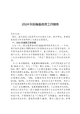 2024年双峰县政府工作报告各位代表:现在,我代表县人民政府向大会报告工作,请予审议,并请县政协委员和其他列席人员提出宝贵意见。一、2023年政府工作回顾过去一年,是全面贯彻党的XXX精神的开局之年。一年来,我们始终坚持以XXX新时代中国特色社会主义思想为指导,在市委市政府和县委的坚强领导下,着力提振信心、优化结构、稳中求进,经济社会平稳健康发展,较好地完成了十八届人大三次会议确定的目标任务,四区建设迈出了更加坚实的步伐。(一)全力稳增长,发展势头持续向好。全年实现地区生产总值296.6亿元,同比(下同)增长4.1%;三次产业结构比为20.6 : 29.7 : 49.7;规模以上工业增加值增长5.5%;社会消费品零售总额增长8.3%;固定资产投资增长2.7%;地方一般公共预算收入-9.6%;城乡居民人均可支配收入29088元、18646元,分别增长4.2%、7.3%;金融机构各项存贷款余额分别增长11.3%、18.5%。水利项目建设、落实安全生产责任制、信访工作示范县创建等3项工作获省政府重点工作真抓实干表扬激励。(二)大力调结构,发展质量稳步提升。工业转型步伐加快,持续壮大农机产业,获评2023年度国家中小企业特色产业集群成为全省15个县域外贸特色产业集群试点之一;推动现有企业转型升级,开展铸造行业小散乱污问题整治,44家存量企业淘汰退出9家,就地技改提升18家,整合入园17家;新增省制造业品牌培育示范企业1家、省制造业单项冠军产品3个现代农业增产增效,建立粮食生产示范片822个,完成粮食播种面积117.4万亩,粮食总产量51.5万吨,获评全国产粮大县;油菜夏收面积19.82万亩,获评全国油菜单产提升整建制推进县,连续四年获评湖南省油料(菜籽油)生产大县,入选湖南省优质粮油工程升级版示范县;出栏生猪93.2万头,连续17年获评全国生猪调出大县。第三产业稳步提质,改造提质国际商贸城、新合作地下商业街、双峰汽车城、特色农机小镇等市场和商圈建设,成功获批湖南省全网营销数字商务集聚区;金融服务能力不断增强,存贷比首次突破50%,直接融资实现破零;文旅产业快速发展,新引进紫峰云端、滑世界亲子营地、灯塔稻作艺术农场、龙腾水府二期等重点文旅产业项目,水府庙生态旅游度假区获评全省首批文旅消费集聚区。(三)强力扩投资,发展后劲明显增强。建立健全重点项目包干负责制、述职讲评制等相关制度,全力推进重点项目建设,163个县级重点项目完成投资137.31亿元,占年度计划的110%。新能源汽车零部件制造基地、海螺建材、双峰汽贸城、洪凯箱包制造基地等20个产业项目实现竣工投产;星明机械、威嘉生物、农机特色小镇、湘友电机、岚骏竹业等18个重大产业项目快速推进。成功争取S222新屋里经沙塘至双爱塘公路、洪山独立工矿区改造提升工程等项目,双峰二中、双峰三中纳入全省县域普通高中徐特立项目支持范围,全年争取各类上级补助和政策性资金16.9亿元。双峰高新区作为全省唯一一个非化工园区获批扩区,园区三类土地处置率达92.68%。(四)奋力促振兴,发展基础不断巩固。脱贫成果持续巩固,扎实做好防止返贫监测和帮扶,巩固提升三保障成果,危房改造287户,实现农村危房存量动态清零;教育资助应助尽助、应享尽享;困难人员与稳定脱贫人口100%参加医保,困难人员县内实际医疗费用报销比例达81.9%。农业基础不断夯实,开展乡村建设行动,完成农村三路建设115公里,文可居文库——海量学习资料,手机电脑均可下载www.wenkeju.com安防工程建设159公里;4.03万亩高标准农田建设项目有序推进,燕霄水库除险加固、涓水河治理加快推进,完成35座小型水库除险加固、山塘清淤1526口;加快农村配电网建设,改造10条10KV线路,完成118个村网台区改造。人居环境持续改善,25个村完成联村建绿;农村改厕3625户;低值可回收物分类回收覆盖率100%,打造市级和美乡村8个、县级和美乡村16个、和美屋场87个、和美庭院2000个。荷叶镇入选十四五期间湖南省乡村振兴示范乡镇创建名单,梓门桥镇获评全省抓党建促乡村振兴示范乡镇,荷叶镇天坪村获评全国乡村治理示范村。(五)尽力促统筹,发展载体不断完善。城镇建设全面提速,南、北环线全线通车,迎宾南路、绍塘公园、沙塘集中供水工程、涓水三期治理工程等投入使用,应急抢险消防救援培训基地一期主体工程竣工。实施保障性租赁住房项目8个436套,城市棚户区改造项目3个573户,改造老旧小区14个2028户。完成6个乡镇污水处理厂及配套主管网建设、荷叶镇污水处理厂扩容改造;犁头嘴水厂及城区给水管网改扩建工程、城区排水防涝工程有序推进。醴娄扩容工程双峰段进度全省最快。宁电入湘(双峰段)境内线路项目塔基和施工便道全部交地施工。深
