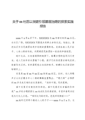 关于xx社区以党建引领基层治理的探索实践报告xxxx年x月x日下午,XXXXXX在xx考察时来到xx社区。在社区广场,XXXXXX同围拢来的群众亲切交流。他指出,要把社区作为民族团结进步创建的重要阵地,发扬各族人民手拉手、心连心的好传统,共同建设民族团结一家亲的和谐家园。晌午过后,在初春暖阳的映照下,轻覆白雪的屋顶闪闪发光。老人们结伴坐在屋檐下小憩,孩子们在房前屋后嬉戏打闹。趁着阳光正好,有的居民抱出自家的被子,晾晒在社区新设的晾晒杆上。这里是xx省xx市xx区xx街道xx社区。此时,动人的歌声正从社区服务中心二楼的舞蹈室里飘出,歌之缘合唱团的xx多名成员相约在这里排练。画的中国,花的夏都,画中花里还有微笑的你和我,画中花里还有幸福的你和我xx岁的合唱团团长xx站在队伍的最前面,手里举着两朵红花为大伙儿示范,唱到这句的时候,把花举到胸前……xx始终记得那个激动人心的日子——xxxx年x月x日。这一天下午,XXXXXX在xx考察时来到xx社区。在社区广场,XXXXXX同围拢来的群众亲切交流。他指出,要把社区作为民族团结进步创建的重要阵地,发扬各族人民手拉手、心连心的好传统,共同建设民族团结一家亲的和谐家园。两年多来,xx社区以石榴籽家园创建为目标,以群众需求为导向,不断夯实党建基础,发挥最大合力推动社区治理高质量发展,逐步构建起社区党委引领、楼院(栋)长协作、党员表率带动、各族群众积极参与的共建共治共享新局面。近日,本报调研组走进xx社区,听社区工作人员和社区居民讲述他们眼中的幸福社区。整合资源:构建大党建工作格局上午xx点,xx又仔细检查了一遍自己负责打扫的区域,确定没问题后擦干手上的水,麻利地收拾好东西赶往一家食堂做帮工。丈夫骤然离世,两个孩子还在上学,生活的重担压在xx一个人身上。以前只有中午在食堂帮工这一份工作,日子过得紧巴巴的。回忆起曾经生活的窘迫,xx眼圈微微泛红,当时想着能不能在小区摆个摊,卖点小吃赚钱。社区工作人员了解情况后,先是在小区设置便民服务点,文可居文库——海量学习资料,手机电脑均可下载www.wenkeju.com又帮xx联系工商部门办理经营许可,小摊顺利支起来了,生活渐渐有了起色。但是入冬以来,小摊生意和这天气一样,冷冷清清。还是得帮薛大姐找一份收入稳定的工作!社区党委书记xx对照着驻区企事业单位名单,逐一联系后,驻区一家单位为xx提供了一个保洁岗位,工作时间不但与食堂帮工不冲突,还增加了收入。xx生活发生改变的背后,是xx社区党组织在协同发挥效能。成立于xxxx年的xx社区,有xx个小区、xxx栋楼、两万多名居民。如果仅靠社区的十几名工作人员,服务群众很难做到面面俱到。xx说,为提升精细化服务水平,我们把辖区内省、区、市、街道、社区五级党组织联系在一起,形成了活动联办、阵地共享的大党建工作格局。非法集资犯罪有哪些?我们来给大家讲一讲驻区单位兴业银行xx分行的工作人员来到社区服务中心,为居民带来一堂专业生动的反诈课。针对老旧小区楼道昏暗、部分照明设施损坏等问题,驻区单位国网xx电力培训中心选派x名技术骨干志愿者,他们扛着梯子、带着维修工具,上门为居民电力义诊。文可居文库——海量学习资料,手机电脑均可下载www.wenkeju.com春节前夕,驻区单位xx市人民检察院将精心准备的慰问品送到社区困难群众的手中。…………在整合资源构建大党建工作格局的思路下,xx社区主动与辖区内不同隶属关系的党组织开展结对共建,打破辖区内企事业单位、社区、学校的党建壁垒,不但解决了群众急难愁盼,还丰富了社区居民的精神文化生活。xxxx年,xx市委结合社区建设实际和市域社会治理现代化试点工作推进情况,推行党员入格一网兜底服务机制。在此背景下,xx社区xxx名在职党员入格报到,发挥各自特长为社区服务增添动能,和睦xx的外延逐渐扩大。在职党员本身就在社区居住,对社区发展有着天然的使命感和责任感,每位党员做一点小事,凝聚起来就是强大力量。xx介绍,入格党员的工作岗位涵盖各行各业,医疗、教育、法律服务他们能发挥专业特长,参与政策咨询、矛盾调处等专长式服务。同时,还能利用闲暇时间深入楼院,集体认领群众微心愿,广泛收集社情民意,协调解决网格内重要事项和问题。大党建工作格局促进社区治理,党员发挥模范带头作文可居文库——海量学习资料,手机电脑均可下载www.wenkeju.com用为民服务的生动实践在xx社区随处可见:由在职党员和社区网格员组成的河道卫士志愿服务队,对辖区内河道及沿线全域进行集中清理整治,以实际行动向居民宣传环境保护的重要性;燃气安全小分队对使用燃气及瓶装液化气的商户进行安全排查和消防宣讲,将安全