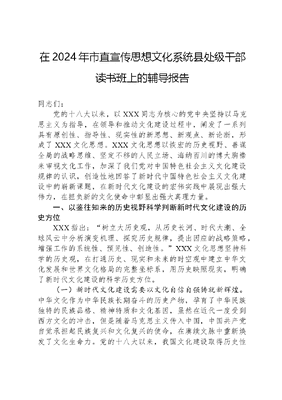 在2024年市直宣传思想文化系统县处级干部读书班上的辅导报告同志们:党的十八大以来,以XXX同志为核心的党中央坚持以马克思主义为指导,在领导和推动文化建设过程中,阐发了一系列具有原创性、指导性、现实性的新思想、新观点、新论断,形成了XXX文化思想。XXX文化思想以恢宏的历史视野、善谋全局的战略思维、坚定不移的人民立场、海纳百川的博大胸襟来审视文化工作,加深了我们党对中国特色社会主义文化建设规律的认识,创造性地回答了新时代中国特色社会主义文化建设中的崭新课题,在新时代文化建设的宏伟实践中展现出强大伟力,在担负新的文化使命中彰显出强大真理力量。一、以鉴往知来的历史视野科学判断新时代文化建设的历史方位XXX指出:树立大历史观,从历史长河、时代大潮、全球风云中分析演变机理、探究历史规律,提出因应的战略策略,增强工作的系统性、预见性、创造性。XXX文化思想坚持科学的历史观,在打通历史、现实和未来的时空观中建立中华文化发展和世界文化格局的完整坐标系,用历史映照现实,明确了新时代文化建设的科学历史方位。(一)新时代文化建设需要以文化自信自强铸就新辉煌。中华文化作为中华民族长期奋斗的历史产物,孕育了中华民族独特的民族品格、精神特质和文化基因,虽然在近代一度受到西方文化的冲击,但是随着马克思主义传入中国,中国共产党自觉承担起民族复兴和文化复兴的使命,在赓续文脉中重新焕发了文化生命力。党的十八大以来,我国文化建设取得历史性成就、发生历史性变革,党和人民的文化自信明显增强、精神面貌得到极大改善。一是实现伟大民族复兴的精神支撑。中华民族历经百年艰辛探索,终于来到了有史以来最为接近复兴的伟大时刻。XXX强调:没有高度的文化自信,没有文化的繁荣兴盛,就没有中华民族伟大复兴。我们只有不断推进文化自信自强,传承发展中华优秀传统文化、革命文化和社会主义先进文化,建设好中华民族共有精神家园,才能为全面推进中华民族伟大复兴提供更为主动、更为强大的精神力量。二是全面建设社会主义现代化国家的应有之义。文化与国脉紧密相连,文化建设在全面建设社会主义现代化国家中具有不可替代的作用。XXX明确指出:中国特色社会主义是全面发展、全面进步的伟大事业,没有社会主义文化繁荣发展,就没有社会主义现代化。文化建设是强国建设的应有之义,尤其是在党领导人民开创中国式现代化的今天,既需要文化建设提供强大的精神力量,又需要文化建设提供深厚的文化根基,融入到经济、政治、社会发展领域,发挥助推器导航灯粘合剂的作用。三是满足人民日益增长的精神文化需求的重要基础。党的十八大以来,我国社会主要矛盾变化带来人民精神文化生活需求的日益增长,扎实推进共同富裕阶段更加需要人民群众实现精神上的富裕,只有大力发展文化事业和文化产业,不断提供更高水平、更高层次的公共文化服务体系,充分落实文化惠民工程,才能丰富人民精神世界、增强人民精神力量,促进人的全面发展。(二)新时代文化建设需要坚持和巩固文化主体性。中华民族几千年来之所以能够历经磨难而始终屹立于世界民族之林,关键就在于坚守中华文化的主体性。党的十八大以来,XXX立足中华文化的主体性推进文化建设,形成了XXX新时代中国特色社会主义思想这一彰显文化主体性的标志性成果,明确提出任何文化要立得住、行得远,要有引领力、凝聚力、塑造力、辐射力,就必须有自己的主体性,这标志着对新时代文化建设的认识达到了新的高度。一是明确提出文化主体性的重大论断。XXX从我国百万年人类史、一万年文化史、五千多年文明史的历史纵深出发,清醒地认识我们独特的民族品格和文明体系,科学地审视我们独特的文化传统、历史命运和基本国情,明确提出了这一重大论断,体现了我们对本民族文化的清醒认知和高度自信。只有坚定文化主体性,我们整个民族才可以实现精神上的独立自主,中国特色社会主义才可以有实现发展的坚实基础,新时代文化建设才能产生引领时代的强大文化力量。二是系统阐述坚持和巩固文化主体性与担负起新的文化使命的关系。巩固中华民族的文化主体性与更好担负起新的文化使命有着紧密的联系。文化自信正是建立在坚定的文化主体性之上才能实现精神上的独立自主,开放包容也正是源于文化主体性才得以避免盲从和照搬其他文明成果,守正创新正因为坚定了文化主体性才能不迷失自我、不迷失方向,这都要求我们坚持和巩固文化主体性以更好地担负起新的文化使命。三是明确提出两个结合以进一步巩固文化主体性。两个结合的提出不仅深刻揭示了马克思主义中国化时代化的内在规律,更彰显了我们党对中华文明发展规律的深刻把握,使得马克思主义与中华优秀传统文化在结合中互相成就。(三)新时代文化建设需要讲好中国故事增强中华文明传播力影响力。党的十八大以来,XXX将加强国际传播能力建设、增强中华文明传播力影响力作为社会主义文化建设的一项重要内