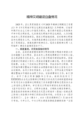 精神文明建设自查情况2023年,县认真贯彻落实《市2023年精神文明建设工作要点》和《市文明城市常态化建设实施意见》文件精神,以培育和践行社会主义核心价值观为根本,着力提升我县公民道德水平和市民文明素质,扎实推进文明城市常态化建设,大力加强未成年人思想道德建设,狠抓文明细胞创建、农村精神文明建设和志愿服务工作,为推进我县建设丘区经济文化生态强县提供了思想保证、道德支撑和精神动力。现将全县精神文明(文明城市)建设自查情况报告于下。一、高度重视,切实加强组织领导县委、县政府高度重视精神文明建设暨文明城市建设工作及时调整了县文明委、县未成年人思想道德建设工作领导小组、县志愿者服务支队成员,成立了县文明城市建设指挥部。坚持把精神文明建设工作列入党委政府重要议事日程,进行专题研究部署,全县上下及时传达贯彻市委、市政府和市文明委、市文明城市建设暨城乡环境综合治理指挥部及其办公室有关文件会议精神,各项工作有序推进。1月12日,召开全县文明城市建设暨城乡环境综合治理工作会,安排部署相关工作。8月25日,召开了县文明委2023年工作会,组织传达学习了XXXXXX在会见全国精神文明建设工作先进代表时的重要讲话和X同志在全国精神文明建设工作表彰暨学雷锋志愿服务大会上讲话的主要精神,审议通过文明城市建设长效机制意见、《县市民守则》修订、文明单位复查、文明机关建设等事项。县委县政府将精神文明建设及巩固文明城市(县城)创建成果工作纳入对各镇乡和部门的综合目标考核,分别按1分(经济发展部门)、2分(镇乡)、4分(服务保障部门)及10分进行考核。今年2月,中央文明办通报表扬我县继续保持全国文明县城荣誉称号,顺利实现三连冠,吸引乐至、盐亭、江油等兄弟县市纷纷前来交流学习。县获全市精神文明建设信息宣传、道德典型学习宣传、文明县城(城区)创建、未成年人思想道德建设、志愿服务活动、农村精神文明建设6项工作先进。县委宣传部、县文明办、县文广新局获全市第四届广播电视公益广告创作大赛优秀组织奖,县未成年人思想道德建设工作办公室获全省未成年人思想道德建设工作先进单位荣誉。获2023年全市优秀志愿者5名,优秀志愿服务组织2个,优秀志愿服务社区2个,优秀志愿服务工作站2个,优秀志愿服务项目1个,县文明办获志愿服务组织工作先进集体。二、巩固文明城市(县城)创建成果扎实推进(一)健全机构机制。县委、县政府成立了文明城市建设指挥部,由县委书记亲任指挥长。出台了《县推进文明城市常态化建设实施意见》,推进领导体制、运行机制、重点工作、创建活动、考核奖惩五个常态化建设。加强考核力度,在年度综合目标绩效考核中单设10分,在元旦、国庆等时间段组织督查,在平时工作调研、检查中随时查找问题,全面评估各部门工作成效。(二)营造浓厚氛围。通过部门、镇乡及社区发放宣传年画、知识宣传卡等宣传资料10余万份,不断提高群众知晓率和支持率。在县电视台、政务网、梓州资讯等主流媒体及城区显著位置设立专题专栏,及时报道文明城市建设工作,设置城区公益广告516处,公益广告面积达到2800余平方米,全方位展示我县创建成果。(三)丰富创建活动。全县各部门、镇乡结合工作职责,积极开展文明旅游、文明餐桌、城区交通环境治理、三关爱志愿服务、抗战胜利纪念、建国66周年、党员义务日、爱国卫生日、文艺汇演、无烟生活教育等形式多样的主题系列活动。(四)加强城市软硬件建设。夯实城市配套建设,抓好城文可居文库——海量学习资料,手机电脑均可下载www.wenkeju.com市新区城中村改造、五里梁南北干道建设等重点工程建设,完善城区道路、输电设备和线路等基础设施,推进改造城南片区棚户区1285亩,实施13条小流域水环境综合治理工程等,进一步优化城市硬件环境。进一步规范城市管理,启用数字化城管,将市容环境、突发事件、摊位乱摆、交通违章等纳入综合监管,并与公安天网、公安道路交通违章处理信息系统逐步实现无缝对接。食药工质、城管、交通等部门联动,专项整治与日常管理相结合,规范流动摊贩和市场秩序;大力开展城区交通环境治理,实施为期3年的城市交通治堵缓堵保畅工程,切实解决城市交通拥堵问题。三、农村精神文明建设卓有成效县委县政府高度重视农村精神文明建设,将其列入年度考核重要内容。相关职责部门、各镇乡结合幸福美丽新村建设、城乡环境综合治理和农村生活垃圾分类处理等工作,广泛发放各类宣传资料,积极开展四下乡和全国科普日暨走进综改区等活动,并每月开展督查工作。广泛开展各类群众性精神文明建设活动,三元镇第二届油菜花节、三元镇首届果桑采摘节、建平镇首届农耕文化艺术节、忠孝乡孝文化艺术节、玉林乡最美媳妇、最美婆婆、最美妻子评选等活动精彩纷呈,支持县作协会员撰写报告文学集《忠孝人家》、话剧《幽兰生辉》、挖掘传承优良家风家训等