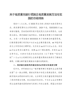 关于高质量党建引领国企高质量发展方法与实践的总结报告党的十八大以来,以XXX同志为核心的党中央情系国有企业,高度重视国有企业党的建设。2023年底,XXXXXX在xx考察时强调,坚持党的领导是中国式现代化的本质要求,也是根本保证,要把握超大城市特点,创新基层党建工作思路和模式。为进一步贯彻落实XXXXXX关于党的建设的重要思想,以高质量党建引领系统中央在x企业高质量发展,xx市经济信息化工作党委成立调研组,先后走访xx家中央在x企业,访谈xx位企业党委正副书记,收集xx余个最佳案例,并通过xx访谈等形式,对新时代经济信息化系统(以下简称经信系统)在x央企党建引领企业高质量发展的实践进行了解剖式调研,以期为高质量党建提供丰富的实践案例。一、高质量党建是高质量发展的必然要求和重要引擎近年来,学界高度关注高质量党建引领国有企业高质量发展这一热点课题,最新成果集中体现为党建总要求、党建新实践和治理高标准等方面,这些研究为高质量党建实践提供了很好的理论支撑。结合经信系统实际,中央在x企业党建引领企业高质量发展是新时代党建工作的必答题、是国企发展的特色卷、是央地融合的加分项,对于进一步推进企业高质量发展意义重大。(一)不断提升国企党建质量体现了坚持和加强党的全面领导的总体要求。党的十八大以来,以XXX同志为核心的党中央旗帜鲜明坚持和加强党的全面领导,把党的领导贯穿到治国理政全部活动中。XXXXXX明确指出:坚持和加强党的全面领导,关系党和国家前途命运,我们的全部事业都建立在这个基础之上,都根植于这个最本质特征和最大优势。加强党对一切工作的领导,这一要求不是空洞的、抽象的,党建引领是非常好的抓手,可以把党的要求和部署落实体现到各方面各环节。从中央到市委对党建引领都高度重视,它已经成为基层党组织坚持和加强党的全面领导的重要共识。(二)坚持党的领导、加强党的建设体现了国有企业的独特优势。在20xx年xx月全国国有企业党的建设工作会议上,XXXXXX强调:坚持党的领导、加强党的建设是我国国有企业的光荣传统,是国有企业的根和魂,是我国国有企业的独特优势。XXX党章也指出:国有企业党委(党组)发挥领导作用,把方向、管大局、保落实,依照规定讨论和决定企业重大事项。这一表述充分体现了党委(党组)在国有企业中的独特地位,更表明了在新时文可居文库——海量学习资料,手机电脑均可下载www.wenkeju.com代坚持党对国有企业的领导具有重要意义。《中国共产党国有企业基层党组织工作条例(试行)》明确提出了国有企业党组织工作的五项重要原则,其中包括坚持党建工作与生产经营深度融合,以企业改革发展成果检验党组织工作成效。进入新时代,国有企业要勇挑重担、敢打头阵,面对原创技术的策源地、现代产业链的链长、突破卡脖子技术、建设世界一流企业等硬任务,以党建引领为切入点,促进党建与业务深度融合,是非常行之有效的工作方法和手段。(三)新时代党建引领体现了中央在x企业融入xx经济社会发展的迫切需求从企业管理体制来看,中央在x企业总部在北京(个别也在其他城市),业务领导在北京,但长期扎根xx,业务重心、服务对象、发展优势都在xx,有的甚至是以xx为根据地的二总部。在x央企对xx经济社会的贡献度也非常大,主动融入xx经济社会发展非常迫切。从党的管理体制来看,中央在x企业党的工作实施的是双重管理。为了进一步加强对在x央企的管理和服务,xx在全国首创了大口工作党委体制。以党建引领为切入点开展工作,是大口党委制度优势所在。中央在x企业可以主动参与大口党委搭建的党建引领各类平台,更好地了解、融入、建设xx,央地携手实现企业和地方的双向高质量发展。文可居文库——海量学习资料,手机电脑均可下载www.wenkeju.com进入新时代,经信系统广大中央在x企业坚持以党建工作引领保障企业改革发展,以政治建设统领改革发展全局,推动国家交给xx的重大战略任务深入实施,着力解决经济信息化领域关键核心技术卡脖子问题,充分彰显了稳定器压舱石作用。以制度建设实现治理效能转换,党的领导全面融入公司治理,中国特色现代国有企业制度在经信系统在x央企得到充分实践。以组织建设夯实经营创新基础,选优配强干部人才队伍,建强基层战斗堡垒,党建优势很好地转化为了在x央企的创新优势、发展优势和创新优势。同时,通过调研访谈也发现,党建与企业生产经营如何深度融合还存在x个方面xx个痛点难点。一是在政治建设方面,如何更高效地把XXXXXX关于本行业、本企业改革发展和党的建设重要论述贯彻落实到经营发展的方方面面。具体包括如何明确使命愿景和企业定位,使之更加深入人心;如何确保企业战略与党建要求相匹配,避免党建业务两张皮;如何避免贯彻落实效果层层递减等方法不多