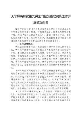 大学解决形式主义突出问题为基层减负工作开展情况报告按照市委办公室《关于整治形式主义突出问题为基层减负专项整治工作方案》精神,对照精文减会、统筹规范督促检查考核、纠治指尖上的形式主义、激励干部担当作为、推进基层治理5个方面,结合学院实际,现就我院整治形式主义突出问题为基层减负专项整治工作开展情况报告如下:一、工作进展情况学院成立以党委书记、校长为组长的专项行动工作领导小组,研讨集中整治形式主义官僚主义为基层减负专项活动工作方案。整治重点主要围绕作风建设、学科专业建设、师风师德建设、学校规划建设五个方面,深入排查学校存在的形式主义官僚主义突出问题和具体表现,具体整改不作为、慢作为等问题。通过集中整治的实际成效,推动全面从严治党在我校的持续深入落实,为学校事业高质量发展提供坚强的思想和纪律保证。(一)切实提高政治站位。学院坚持把整治形式主义突出问题为基层减负专项整治作为开展主题教育的一项重要政治任务,以及深化干部作风和管理能力提升年的有力抓手。利用党委中心组、主题教育读书班等时机,认真学习XXXXXX关于力戒形式主义的重要论述,深刻认识形式主义现实危害。制定学院《关于整治形式主义突出问题为基层减负专项整治方案》,结合高校工作实际,重点整治5个方面22类突出问题。(二)不断改进文风会风。严格执行《学院公文处理规定》,按规范程序审批文件,认真把好公文处理的各道关口,严控发文数量、文件篇幅、行文标准、密级审定和发放范围,切实提高文件质量和办文效率。认真落实中省市有关端正会风的要求,严格会议管理,精简会议数量,降低会议频次,压缩会议时间,统筹协调各类工作安排、表彰、总结等全校性会议,能不开的坚决不开,可合并的坚决合并。10月份共协调合并减少会议3次。(三)持续优化督查考评。严格实行督查考评事项年度计划和审批报备制度,由学院党委统筹安排,各二级部门统一组织实施。严格控制督查考评数量,除学院统一组织的年终目标责任考评,其他单位不得擅自组织检查考核。修订学院《年度目标责任考核实施办法》,建立科学合理的考核指标体系,增加双高建设、教科研项目等重点工作考核分值权重,降低听取汇报、查阅资料考核分值权重,更好地发挥考核指挥棒作用。(四)严格控制各项活动。健全工作例会制度,坚持每周一召开领导班子碰头会,统筹安排当周学院主要活动,下发活动一览表,最大限度减少临时性活动安排。统筹安排调研工作,严密制定主题教育调研方案,领导班子成员和副县级以上干部采取四不两直的方式开展调研工作,坚决杜绝盆景式走秀式调研。深入纠治指尖上的形式主义,大力推广OA办公系统,严禁在微信群、QQ群摊派任务、索要材料。(五)激励干部担当作为。不断推进人事分配制度改革,修订学院《教师专业技术职务低职高聘管理办法》《专业技术职务评审办法》等,破除五唯,激励干部职工干事创业、教书育人。用实用活四种形态尤其是第一种形态,不断改进谈话和函询工作方法,建立健全干部容错纠错机制,有效减轻干部心理负担。依托主题教育调查研究,召开教职工座谈会听取意见建议,积极为教职工办实事、解难题。(六)深入推进基层治理。制定学院《高质量发展实施意见》,深入实施治理能力提升行动。印发学院新版制度《汇编》,修订学院《章程》,完善以一章八制为核心的现代职业学校制度,建立层次清晰、内容规范、协调一致的制度体文可居文库——海量学习资料,手机电脑均可下载www.wenkeju.com系。全面深化校院二级管理体制改革,推进人权、事权、财权同步下移。深入开展督查督办,定期印发《督查简报》,确保学院各项制度执行有力。二、下步工作计划一是结合巩固深化XXX新时代中国特色社会主义思想主题教育成果,加强对XXXXXX关于力戒形式主义突出问题为基层减负有关论述的学习领悟,确保入心入脑,融入实践。二是采取督查督导、一线调研等方式,持续加强整治形式主义突出问题为基层减负专项整治工作落实督导检查,对形式主义问题,发现一起、整治一起,全力为基层减负减压。三是建立健全关心关怀机制,在负担上做减法,在厚爱上做加法。定期开展谈心谈话、困难帮扶、走访慰问等,激励干部职工统一思想、担当作为、干事创业。文可居文库——海量学习资料,手机电脑均可下载www.wenkeju.com