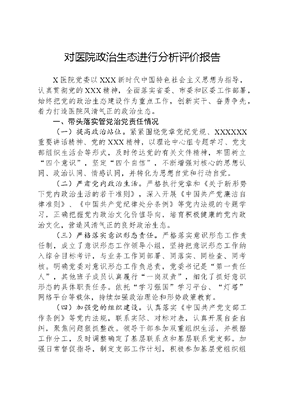 对医院政治生态进行分析评价报告X医院党委以XXX新时代中国特色社会主义思想为指导,认真贯彻党的XXX精神,全面落实省委、市委和区委工作部署,始终把党的政治生态建设作为重点工作,创新实干、奋勇争先,着力打造医院风清气正的政治生态。一、带头落实管党治党责任情况(一)提高政治站位。紧紧围绕党章党纪党规、XXXXXX重要讲话精神、党的XXX精神,以理论中心组专题学习、党支部组织生活会等形式,及时传达党的有关文件精神,牢固树立四个意识,坚定四个自信,不断增强对核心的思想认同、政治认同、情感认同,并转化为思想自觉和行动自觉。(二)严肃党内政治生活。严格执行党章和《关于新形势下党内政治生活的若干准则》,深入开展《中国共产党廉洁自律准则》、《中国共产党纪律处分条例》等党内法规的专题学习,正确把握党内政治文化价值导向,培育积极健康的党内政治文化,营造风清气正的良好政治生态。(三)严格落实意识形态责任。严格落实意识形态工作责任制,成立了意识形态工作领导小组,坚持把意识形态工作纳入综合目标考评,与业务工作同部署、同落实、同检查、同考核。明确党委对意识形态工作负总责,党委书记是第一责任人,其他班子成员认真履行一岗双责,细化了抓好意识形态的具体职责任务。依托学习强国学习平台、灯塔网络平台等载体,持续加强政治理论和形势政策教育。(四)加强党的组织建设。认真落实《中国共产党支部工作条例》等党内法规,联系实际、对标对表,认真开展自查自纠,聚焦问题狠抓整改。领导干部参加双重组织生活,并根据工作分工,及时调整确定了基层联系点和基层联系党支部。加强日常督促指导,制定支部工作计划,积极参加基层党组织组织生活会、党课等活动,并及时提醒督促各党支部抓好工作落实。认真落实双报到要求,积极开展志愿服务活动,组建党员志愿服务队,班子成员带头参加社区志愿活动,多次深入包保社区开展双报到和创城志愿服务活动。巩固深化党建规范化标准化成果,严格执行三会一课、党员领导干部双重组织生活等基本制度,持续增强机关党组织政治功能和组织功能,充分发挥党组织战斗堡垒作用和党员先锋模范作用。(五)抓好党风廉政建设。始终把落实全面从严治党主体责任作为重大政治任务来抓,组织全体党员干部认真学习党章、党规、观看警示片,不断提升党员干部拒腐防变能力。坚持一岗双责和谁主管谁负责的原则,层层签订《党风廉政责任书》,将党风廉政建设作为年度述职的重要内容,始终做到心有所畏、言有所戒、行有所止。(六)持之以恒推进正风肃纪。开展作风集中整顿活动,制定印发《X院作风集中整顿活动实施方案》,成立作风集中整顿活动领导小组。研究制定作风集中整顿活动学习计》,党员干部每人制定学习计划,以过硬作风推动医院高质量发展。(七)全面加强人员队伍建设。突出政治素质考察,把政治标准作为选人用人的首要标准,着力建设忠诚、干净、担当的高素质干部队伍。健全发现识别优秀年轻干部的常态化机制,动态掌握优秀年轻干部名单,为配备使用干部提供参考。加大年轻干部储备,充实干部队伍力量。(八)加强统一战线工作。深入学习贯彻XXXXXX关于加强和改进统一战线工作的重要思想,专题研究部署统一战线工作,全面深入贯彻落实《中国共产党统一战线工作条例》精神,坚持高标准、严要求,找差距、补短板,不断推进统一战线各项工作守正创新。二、贯彻落实中央决策部署和省委、市委重点工作安排情况(一)强化质量管理,理顺创新工作机制。医院党委注重文可居文库——海量学习资料,手机电脑均可下载www.wenkeju.com把党建工作与业务工作的紧密结合,以具体举措见成效,不断把党的政治优势、组织优势转化为创新优势、发展优势。简流程。制定院内《医疗质量安全质控标准》等一系列规章制度,规范了医保报销流程,最大限度解决老百姓看病难问题。抓作风。严格工作纪律,设立员工岗位职责,实现应岗在岗,确保不出现医疗事故风险。开展医药卫生领域不正之风专项整治行动,完善监督制约机制,切实维护广大人民群众的切身利益。推进护理建设,加强人才储备与培养,实施人才走出去战略,选派20名医务人员到上级医院进修,不断提升全院医疗服务水平。(二)提升服务水平,增强为民服务能力。医院党委根据党员具体工作岗位,注重党建工作与实际工作的有效结合,抓实活动实践,通过了解群众需求,探索优化服务新渠道。一是开展诊疗云服务。建立远程会诊,远程彩超会诊,进一步提升服务品质,提高患者满意度、认可度。二是两癌筛查惠民生。加强与基层单位协作,增加两癌筛查项目,配备查体车,暖心服务送到群众家门口。三是优化医保服务流程。优化流程,实现医保业务即时办理,设立一站式综合服务结算窗口,服务内容涵盖10项结算业务,解决了过去百姓到处跑的劳累,让百姓体会到服务的暖心。四是活动送到群