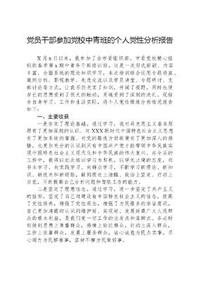 党员干部参加党校中青班的个人党性分析报告X月x日以来,我参加了由市委组织部、市委党校精心组织的春季第x期中青年干部培训班。这是一次形式新颖、内容丰富、全面系统的理论知识学习,本次培训综合运用专题讲座、案例分析、影视教学、先进交流以及学员讲堂、专题研讨、支部讨论等方式,让我不但充实了知识,开阔了视野,同时也使自己的思想受到了很大的触动,灵魂受到了深刻的洗礼。现结合自身学习、工作和生活实际,将个人党性锻炼分析情况报告如下:一、主要收获一是夯实了理论基础。通过学习,我对马克思主义基本原理有了更加深刻的认识、对XXX新时代中国特色社会主义思想有了更加系统的掌握、对党的路线方针政策有了更加深入的感悟,也更加充分的认识到只有中国共产党才能带领中华民族实现中国特色社会主义现代化和中华民族的伟大复兴。在今后的工作中,我将以此次培训学习为契机,以学无止境的态度,向书本学习、向实践学习、向群众学习,不断学习新理论、新知识、新技术和新经验,做到理论上清醒、政治上坚定、行动上自觉,不断提高自己分析问题和驾驭工作的能力。二是坚定了理想信念。通过学习,进一步坚定了共产主义的信仰,坚定了自己对建设有中国特色社会主义的信念,提高了党性修养,增强了党性观念,增强了为民服务的宗旨意识。自己更加清醒的认识到维护好、实现好、发展好最广大人民群众的根本利益,是我们党一切工作的出发点和落脚点。务必时刻做到思想上尊重群众,感情上贴近群众,行动上深入群众,工作上依靠群众,发展上服务群众,诚心诚意为民办实事,尽心竭力为民解难事,坚持不懈为民做好事。三是开阔了工作视野。通过学习,我从老师和各位学员身上学到了更多的社会知识、工作方法、为人态度和处事原则,也更加深刻认识到目前我们党员干部开展工作不能墨守成规,更不能消极保守,只有立足本职、胸怀全局,摆正位置、坚定信念,才能在自己的工作岗位上以优质高效的服务,出色的完成各项工作任务。同时,通过集体学习,我体验到了大家庭的快乐和温暖,并与老师和各位学员建立了深厚感情和友谊,这将是我人生的一笔宝贵的精神财富。二、存在的问题通过这次在党校系统的政治理论学习,对照《党章》的要求,深刻剖析自己,还存在以下问题。(一)理论学习不够深入。平时,自己虽然也重视政治理论的学习,能够及时、认真地学习有关政策,但不够系统,缺乏全面的、系统的钻研精神,具体表现在:一是学习不够主动。仅满足于上级规定的学习内容,八小时之外的时间把握不好,利用业余时间自学不够,缺乏持之以恒,没有形成真正意义上的我要学。二是学习不够系统。日常工作中以事务多、工作忙为由,把大部分时间和精力投入到业务工作中,理论学习存在零星化、片段化现象,没有真正意义上做到学懂弄通做实。三是态度不够端正。重实用主义,轻理论升华,只满足于书本看了,对一些问题缺乏理性思考,对学习内容的深刻理解和准确把握上还有待于进一步加深,理论学习与实际工作结合不够紧密,韧性钻劲不足,只满足于我学了,没有做到带着问题学,联系实际学,深入思考学,没有达到应有的学习目的和效果。(二)思想观念不够解放。主要表现有:对本职工作局限于照本宣科,满足于不出事,在具体实践中想问题、做工作、办事情习惯于沿袭老方法、老套路多,创新工作方式少;把完成任务作为第一目标,求稳怕乱,闯劲不足,存在被动应付现象,缺乏迎难而上、知难而进的工作态度和果敢精神;在运用现有政策处理有关问题方面不够灵活,有时总感到老办法文可居文库——海量学习资料,手机电脑均可下载www.wenkeju.com不管用、新办法不会用,思想顾虑比较多,思想解放程度不够。(三)联系群众不够密切。工作中虽然能够自觉实践全心全意为人民服务的宗旨,能够始终坚持群众观念,从维护群众的根本利益出发,但是在如何更好地服务基层、服务企业、服务群众等方面探索得还不够多,服务得还不够好,想企业之所想、急企业之所急,帮助联系的困难企业解决问题方面做得还很不够;特别是在做好下岗失业党员的组织管理上浮在面上的多、深入实际具体跟踪的少,践行党的群众路线不够到位。(四)工作作风不够扎实。在生活和工作中能遵守党纪国法,严守党的各项纪律。但还存在着一定的畏难情绪,缺乏锐意进取精神,工作的积极性和主动性不够,对上级的精神和部署习惯于做过了,没有静下心、沉下身认真思考工作是否高标准、高质量完成,缺乏尽善尽美、精益求精、时时处处争创一流的韧劲。三、今后的努力方向针对自身存在的问题,经过认真反思,在今后的工作中,我将努力做到以下几点:(一)在抓学习强实践上使好劲,提高自身素质。中国特色社会主义进入新时代,不学习就不能把握新时代发展的脉搏,就不能跟上社会前进的步伐,也就不能担负起党和人民交付的重托。我将把学习当做是一种政治责任、一种精神追求、一种生活方式、一种职业习惯。向书本学:认真学习XXX新时代