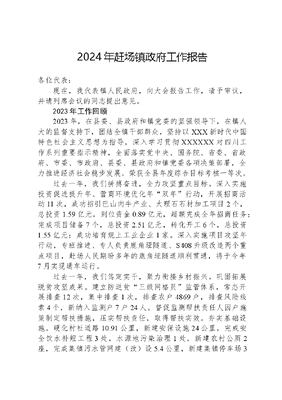 2024年赶场镇政府工作报告各位代表:现在,我代表镇人民政府,向大会报告工作,请予审议,并请列席会议的同志提出意见。2023年工作回顾2023年,在县委、县政府和镇党委的坚强领导下,在镇人大的监督支持下,团结全镇干部群众,坚持以XXX新时代中国特色社会主义思想为指导,深入学习贯彻XXXXXX对四川工作系列重要指示精神,全面落实党中央、国务院、省委、省政府、市委、市政府、县委、县政府和镇党委各项决策部署,全力推进经济社会稳步发展。荣获全县年度综合目标考核一等次。过去一年,我们拼搏奋进,全力攻坚重点目标。深入实施投资促进提升年、营商环境优化年双年行动,开展招商活动11次,成功招引巴山肉牛产业、大理石石材加工项目2个,总投资1.59亿元,到位资金0.89亿元,超额完成全年招商任务;完成项目储备7个,总投资2.51亿元,转化开工6个,总投资1.55亿元;成功培育规上工业企业1家。深入实施项目攻坚年行动,专班推进、专人负责鹿角垭隧道、S408升级改造两个重点项目,赶场人民期盼多年的鹿角垭隧道顺利贯通,将于今年7月实现通车运行。过去一年,我们笃定实干,聚力衔接乡村振兴。巩固拓展脱贫攻坚成果。建立防返贫三级网格员监管体系,常态开展排查12次,集中排查1次,排查农户4869户,排查风险线索4个,新纳入监测户7户24人。督促监测帮扶责任人因户施策制定帮扶措施,压实帮扶责任,取得帮扶实效。夯实基础设施。硬化村社道路10.91公里,新建安保设施24公里,完成安全饮水补短工程3处,水源地污染治理1处,新建农村公厕2座,完成集镇污水管网建(改)设5.4公里,新建集镇停车场3处,新增停车位90余个。培育特色产业。全力推进黄羊倍增计划,新建规模场2处,新增养殖大户5户,发展南江黄羊2660只。大力发展巴山肉牛产业,招引建设200头、500头养殖场各1个,新增肉牛养殖大户16户,带动全镇发展肉牛2000余头。守牢耕地红线。严格落实耕地占补平衡进出平衡,恢复流出耕地1473.17亩,组建农机助耕队2支,整治撂荒地300余亩,巩固复耕成果,全年完成粮食总播面48632亩、产量16563吨。过去一年,我们倾情倾力,持续增进民生福祉。教育文化事业更加兴盛。全镇适龄儿童入学率达到100%,赶场中学研究课题获全国教育科学十三五规划课题初中组一等奖;赶场小学信息能力提升案例:学用新技术、开创新未来在全省信息能力提升案例中获得二等奖,男女足球队在市第九届青少年校园足球赛中分别获得第一名、第三名,赶场幼儿园被评为市级示范园。全镇组建文艺宣传队伍12支,开展文艺表演20余场次、政策宣传30余场次。医疗卫生服务更加全面。农村适龄妇女免费筛查两癌410人;建立居民健康档案10386份,建档率达到99.19%;对1159名高血压、253名糖尿病人纳入监测管理;儿童免疫规划类疫苗接种率达90%以上。社会保障更加到位。实施分类帮扶救助政策,精准评定低保2467户5363人,发放临时救助资金175人34.324万元,足额发放特困人员、残疾人、计划生育家庭奖励扶助等救助资金,城乡居民医疗保险、养老保险参保率稳定在98%以上;逗硬落实退耕还林、生态公益林、商品林、粮食直补、地力补贴等各项惠民政策。过去一年,我们如履薄冰,营造平安稳定氛围。筑牢安全底线。开展道路交通、食品药品、校园周边、液化气、工地、矿山等安全综合检查18次,专项检查30余次,发现并整改问题138个;开展防洪度汛、森林防灭火综合应急演练13次;全面落实6个地质灾害监测点、14个山洪灾害危险区巡查监测制度,预警转移群众711人。纵深推进社会治理。扎实开展信访文可居文库——海量学习资料,手机电脑均可下载www.wenkeju.com矛盾化解,完善矛盾纠纷多元化解机制,运用网格+调解政府+民间等矛盾纠纷多元排查调处手段,排查纠纷28件,化解办结28件,调处化解率达100%。深入开展农村党员驾考、机关干部评分考评两制,实现党风带政风促民风,首届行廉礼,育新风集体升学礼被《人民日报》宣传报道。各位代表,2023年,我们在磨砺中经受了考验,在奋进中坚定了信心,在实干中凝聚了力量。成绩的取得,根本在于XXX新时代中国特色社会主义思想的科学指引,关键在于县委、县政府和镇党委的坚强领导,得益于镇人大和社会各界的有效监督、大力支持,凝聚着全镇广大干部群众的心血和汗水。众人拾柴火焰高。有了大家的共同努力,赶场的今天变得更加美好;有了大家的团结拼搏,赶场的明天充满无限希望!在此,我谨代表镇人民政府,向各位代表、列席同志们,向所有参与、帮助、支持赶场建设发展的各界人士,表示衷心的感谢和崇高的敬意!各位代表,赶场正处于加快发展、赶超发展的关键时期,一些深层次矛盾和问题尚未完全解决,一些新的困难