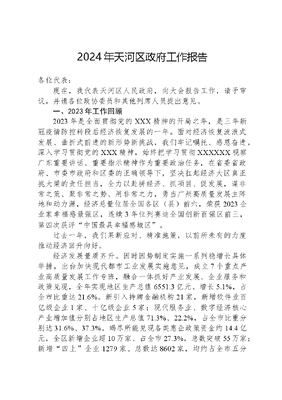 2024年天河区政府工作报告各位代表:现在,我代表天河区人民政府,向大会报告工作,请予审议,并请各位政协委员和其他列席人员提出意见。一、2023年工作回顾2023年是全面贯彻党的XXX精神的开局之年,是三年新冠疫情防控转段后经济恢复发展的一年。面对经济恢复波浪式发展、曲折式前进的新形势新挑战,我们牢记嘱托、感恩奋进,深入学习贯彻党的XXX精神,始终把学习贯彻XXXXXX视察广东重要讲话、重要指示精神作为重要政治任务,在省委省政府、市委市政府和区委的正确领导下,坚决扛起经济大区真正挑大梁的责任担当,全力以赴拼经济、抓项目、促发展,谋非常之策、聚非常之势、用非常之力,勇当广州高质量发展主阵地和动力源,经济总量位居全国各区(县)前六,荣获2023企业家幸福感最强区,连续3年位列赛迪全国创新百强区前三,第四次获评中国最具幸福感城区。过去一年,我们果断应对、精准施策,以前所未有的力度推动经济回升向好。经济发展量质齐升。因时因势制定实施一系列稳增长具体举措,出台加快现代都市工业发展实施意见,成立7个重点产业高质量发展工作专班,融合一体抓好产业发展、企业服务和政策兑现,全年实现地区生产总值6551.3亿元、增长5.1%,占全市比重达21.6%。新引入持牌金融机构21家,新增软件业百亿级企业1家、十亿级企业5家;现代服务业、数字经济核心产业增加值分别占地区生产总值71.3%、22.2%,占全市比重分别达31.6%、37.3%。竭尽所能兑现各类惠企政策资金约14.4亿元,全区新增企业超10万家、占全市27.3%,总数突破55万家;新增四上企业1279家、总数达8602家,均约占全市五分之一。多措并举涵养税源,实现税收收入862.3亿元,一般公共预算收入82.8亿元。强化投资消费支撑,实现社会消费品零售总额2152.8亿元、增长6.4%;完成固定资产投资703.8亿元、增长20%,增速居全市首位、创近5年新高,对全市固定资产投资增长贡献率达38.9%。平台建设加速推进。专班化、项目化推动重大平台高质量发展。天河中央商务区位列2023福布斯中国商务中心区前三。广州期货交易所碳酸锂期货成功上市,粤海天地正式开业。新增亿元税收楼宇2栋。国家数字服务出口基地实现数字服务出口额20.5亿美元、增长14.8%。天河路—珠江新城商圈新入驻首店71家,新增1家全国示范智慧商店,7家商店入选全市首批离境退税即买即退试点商店、占全市七成;商圈全年客流量超8亿人次、商品销售总额超1万亿元,稳居全省第一、全国前列。广州国际金融城攻坚克难收储东区3宗国有土地,北区控规调整通过市规划委员会审议,澳门国际银行等10个项目开工,中国人寿等10个项目封顶,汇金中心等2个项目完成竣工验收,越秀财富大厦等13个项目启动招商,新增产业面积超110万平方米。天河智慧城和天河智谷片区新收储土地17.9公顷、出让地块5宗,新引进投资亿元以上项目33个,咏声、凡拓等2个重点产业项目开工,趣炫总部等4个重点产业项目竣工投产。谋划建设2112工园。启动中国软件名园申报。天河智慧城综合管廊全线贯通。印发环五山创新策源区三年行动计划,统筹推进软件优化和硬件升级。创新揭榜挂帅工作机制,征集创新需求75项、解决方案36个;加快梳理盘活高校科研院所、国有物业土地等空间资源,深入推进城中村改造前期工作,五山路人行天桥等10个项目完工,广州科技图书馆等21个在建项目加快实施。沙河片区文化振兴有序推进,龙洞凤凰片区启动规划,多点支撑、协同发展的空间格局逐步成型。创新动能持续提升。强化企业创新主体地位,新注册科技文可居文库——海量学习资料,手机电脑均可下载www.wenkeju.com类企业2.7万家、增长30.4%,国家科技型中小企业库入库企业增加948家、增长28.8%,增量均居全市第一。12家企业获评国家级专精特新小巨人企业,3家企业获评2023中国互联网企业百强,3家企业入选胡润2023全球独角兽榜单。中望龙腾3D软件获评国产工业设计软件领域首个中国版权金奖,羊城创意产业园获评全国版权示范园区。赛意信息谷神、亿迅科技天翼云工业互联网平台入选国家级跨行业跨领域工业互联网平台。成功举办广州国际创新节,汇聚全球线上线下约150万人,湾区新药研究院(天河)等重大项目签约落地。在全国首创行政、仲裁、司法有机衔接知识产权协同保护机制,全区发明专利授权量9438件、总量全市第一。过去一年,我们勇立潮头、敢为人先,以前所未有的力度全面深化改革开放。粤港澳大湾区建设走深走实。积极主动作为,全力推动港澳居民来往内地通行证和港澳居民居住证相互关联、拓展职业资格认可范围等建议事项纳入省行动方案。在全省率先启动涉税事项湾区通办服务示范区建设,开设港澳个转企登记专窗和外资股东身份视频