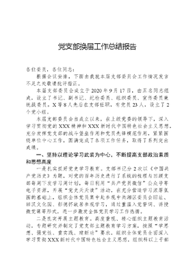 党支部换届工作总结报告各位委员,各位同志:根据会议安排,下面由我就本届支部委员会工作情况发言不足之处敬请批评指正。本届支部委员会成立于2020年9月17日,由五名同志组成,设立了书记、副书记、纪检委员、组织委员、宣传委员兼统战委员。X等8人先后在支部任职,有党员23人,设立了2个党小组。本届支部委员会自成立以来,在上级党委的领导下,深入学习贯彻党的XXX精神和XXX新时代中国特色社会主义思想,充分发挥党支部的战斗堡垒作用和党员先锋模范作用,紧紧围绕单位中心工作,圆满完成了各项工作任务,取得了系列突出成绩。一、坚持以理论学习武装为中心,不断提高支部政治素质和思想高度一是扎实抓好党史学习教育。支部书记分2次以《中国共产党历史》为题,对党的百年历史进行了系统的梳理与回顾支部每周下发学习周计划,每日利用共产党员微信公众号等电子资源,开展党史天天读活动,在充分营造学习浓厚氛围的基础上,组织全体党员集中赴参观中共湘区委员会旧址、田汉文化园、彭德怀故居参观学习,通过重温入党誓词、讲授微党课等形式,进一步激发全体党员学习工作热情。二是扎实开展主题教育。高度重视、精心组织主题教育活动,专题研究并制定了党支部主题教育学习方案,按照学思想、强党性、重实践、建新功要求,组织全体党员全面深入学习贯彻XXX新时代中国特色社会主义思想,组织科以上干部认真开展调查研究,完成问题整改2个、调研报告1篇。三是坚持组织学习研讨。坚持把政治理论学习摆到支部建设的首要位置,结合工作实际制定学习、工作、活动计划,每月单数周的周四下午组织党员集中学习,在精心抓好学习教育的同时,积极组织开展形式多样的研讨活动,通过研讨进一步加强党性修养,提高党员意识,形成支部合力。二、坚持以加强支部建设为重点,不断增强党组织凝聚力和向心力一是建强支部班子凝聚力量。支委班子是的主心骨,是团结和领导的核心,班子成员保持思想一致,以身作则搞好团结,工作上互相支持合作、经常交换意见,沟通思想。班子成员对原则问题分清是非,统一认识,统一行动;日常工作上互相谅解,求同存异,通过实际行动增强了支委班子的凝聚力、吸引力和战斗力。二是落实支部活动践行宗旨。根据工作实际,认真研究主题,严密甄选计划,细致裁定方案。支部先后组织全体党员赴中共湘区委员会旧址、田汉文化园、彭德怀故居、左权故居、平江起义纪念馆,通过红色教育激发党员的责任意识和模范意识。三是关心职工生活凝聚力量。支部委员经常性地与职工沟通交流、增进理解,看望慰问生病住院、家属生育、家庭丧葬等情况的职工10余次。组织职工开展健康有益的拓展训练,鼓励职工积极参加工会组织的各项活动。三、坚持以落实制度管理为基础,不断夯实支部党建能力和工作水平一是坚持落实三会一课制度。按要求制定三会一课计划,结合实际开展一月一课一片一实践活动。支部书记带头讲党课,支委成员做为普通党员参加党小组的组织生活。认真组织民主生活会、组织生活会,正确开展批评与自我批评,会前有准备,会中有通报,会后有总结。文可居文库——海量学习资料,手机电脑均可下载www.wenkeju.com二是坚持民主集中制原则。建立和完善党内情况通报制度重大决策问题严格按照集体领导,民主集中,个别酝酿,会议决定的原则,重点难点问题组织集体讨论,共同谋划,及时解决。推行党务公开,增强透明度,在评选优秀党员、年底评先评优工作中,让普通群众担任计票员,当场统票并宣布得票数,充分保障广大党员的知情权、参与权、监督权,使党员更好地了解和参与党内事务。三是坚持按时缴纳党费。支部每名党员自觉履行党员义务,按时足额缴纳党费。三年共收取党费X元,其中:2021年党费为X元,2022年党费为X元,2023年党费为X元。四、坚持以指导工作实践为抓手,不断提升支部完成任务和解决困难的能力一是保障重大行动。支部始终把调动党组织发挥作用作为支撑点,在X行动中,全体党员组建了维稳先锋队,党员干部行在前、做在先,为活动圆满完成打下了坚实有力的基础。二是护航重要任务。圆满出色完成X系列活动交通、安保、维稳任务,实现了活动前营造喜庆祥和安定大好局面;活动日交通顺畅、活动有序、平安稳定的工作目标,党支部荣获X活动先进集体,X名同志荣获X活动先进个人。三是突出重点领域。支部坚持高站位统筹安全与发展,在建党100周年、党的XXX等特护期,全力做好维护政治安全稳定工作,近三年集访、非访现象指数型下降;在可能爆发大规模事件初,妥善稳定处置,受到上级领导高度肯定。五、存在的主要问题在过去的三年中,党支部充分发挥战斗堡垒作用和党员先锋模范作用,为单位的安全、发展、稳定做出了大量卓有成效的工作,得到了各级组织的肯定。但我们还要清醒的认识到,支部建设同单位先进党支部相比还存在一定差距,与同志们的殷切期盼还存在一定距离,主要