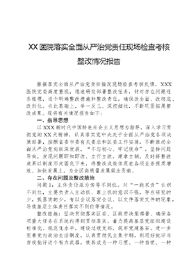 XX医院落实全面从严治党责任现场检查考核整改情况报告根据落实全面从严治党责任情况现场检查考核反馈,XXX医院党委高度重视,迅速研究部署整改任务,针对存在问题逐条梳理,逐个明确整改措施和整改责任,确保改全面、改彻底、改到位。在此基础上,举一反三、深挖细找,不断巩固拓展整改成果。现将有关情况报告如下:一、指导思想以XXX新时代中国特色社会主义思想为指导,深入学习贯彻党的XX大精神,认真落实党中央关于全面从严治党各项决策部署,按照省委市委有关要求和区委工作安排,不断推动全面从严治党向纵深发展,不忘初心、牢记使命。坚持问题导向,发现问题即知即改、立行立改,建章立制,及时将整改成果以制度形式固化下来,将整改成效体现在各项业务提质增效、加快发展上,为全区高质量发展做出贡献。二、存在问题及整改措施问题1:主体责任压力传导不到位。对一岗双责认识不到位,主要负责人主动抓、靠上抓的意识不强,存在研究的少,抓落实的少,有以会议落实会议、以文件落实文件的现象,导致基层主体责任落实不到位等情况。整改措施:坚决贯彻落实区委、区政府决策部署,确保各项重大任务在系统内得到贯彻落实。着力提高基层党组织建设标准化、规范化水平,建设过硬支部,筑牢党建基石。进一步完善党内政治生活制度,认真贯彻民主集中制,利用好批评与自我批评这个有力武器,使其成为一种习惯、一种自觉、一种责任。从严抓一岗双责,督导班子成员落实一岗双责,扎实落实党风廉政建设责任制,督促把抓党风廉政建设工作与分管业务工作摆在同等位置,做到党风廉政建设同分管工作同部署、同检查、同落实。问题2:监督管理不严格。抓班子带队伍投入精力不足,经常性教育不扎实,部分党员干部三会一课学习停留在表面,满足于完成记笔记、抄原文;与党员谈心谈话次数不多,党员思想动态掌握不及时。整改措施:严格锤炼党性,始终做到作风过硬。坚持领导带头、以上率下,引领和带动党员干部持续转作风,做到对党忠诚,说老实话、办老实事、做老实人,自觉接受党规党纪的规范和约束。严抓干部队伍建设,严格按照干部管理权限领导医院干部的选拔任用工作,医院党委讨论决定医院人才工作的政策措施,创新用人机制,优化人才成长环境。问题3:思想政治建设力度不够。思想政治建设的针对性不强、措施不够到位。对苗头性、倾向性问题不能及时发现、及时提醒,问责滞后、问责不严问题仍然存在。整改措施:一是把学习党的政治理论作为武装头脑、指导实践的首要任务,努力克服消极懈怠思想,弃除似是而非、不求甚解的应付观念,在繁忙的工作之余静下心、坐下来、学进去,在学实、学深、学透上动真功、用实劲,以此增强党性觉悟、政治敏锐性和鉴别力,树立正确而牢固的世界观、人生观、价值观,学会用科学的立场观点方法看待和处理问题。强化责任担当,始终做到能力过硬。落实班子成员联系点制度,作为班子成员述职述廉和年度考核的一项重要内容,坚持做到带着问题深入群众、深入基层,切实把基层所思所想所盼所忧问题了解好、解决好。加强作风问责问效,落实工作督查机制和责任追究制度,着力解决精神懈怠、遇事推诿、办事拖拉等突出问题。全面从严治党永远在路上,XXX医院将按照省委、市委有关要求,以这次现场检查考核问题整改为契机,不断提高思想文可居文库——海量学习资料,手机电脑均可下载www.wenkeju.com政治素质,坚决夯实党建和工作责任,不断加强管理,提高创新发展水平,以更加坚决的态度,更加务实的举措,更加过硬的作风,推动全面从严治党向纵深发展。文可居文库——海量学习资料,手机电脑均可下载www.wenkeju.com