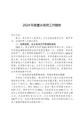 2024年更戛乡政府工作报告各位代表:现在,我代表乡人民政府,向大会报告政府工作,请予审议,并请列席人员提出意见。一、锐意进取,全乡各项工作取得新成效2023年,是全面贯彻党的XXX精神的开局之年,也是三年新冠疫情防控转段后经济恢复发展的一年。在县委、县政府的指导下,在乡党委的坚强领导下,乡人民政府坚持以XXX新时代中国特色社会主义思想为指导,牢牢把握全乡经济社会发展大局,成功应对粮食安全和耕地保护、防范化解风险、单点暴雨极端天气灾害等重点、难点工作压力,在攻坚克难中赶超跨越,在实践中想办法,在实干中总结经验,以务实求真的扎实作风圆满完成了年初既定的各项工作目标任务,更戛经济社会发展基础稳中有进。(一)经济社会发展持续向好,发展态势更加稳健财税收入恢复性增长。我们牢牢抓住大疫之后经济逐步复苏的有利形势,坚定不移推动经济高质量发展。实现农村经济总收入7.14亿元,增长10%以上;农村常住居民人均可支配收入达1.74万元,增长12%以上;完成一般公共预算本级收入1225万元,超年初计划12.38%;完成财政支出4140万元;完成向上争取资金5850.13万元;完成规模以上固定资产投资1.95亿元;完成招商引资2.4亿元。全乡实现村级集体经济收入266.77万元,完成年度目标的127.03%,小街子村超过50万元,收入增量和增速均全县排名第一。市场动能持续增长。日出云海、宛如仙境星空盛景等视频直上央视,云曼更嘎入驻昌宁特色街区,龙潭河景区成功创建,我乡实现AAA级景区零突破,旅游人数4万多人次、旅游创收200.4万元。新增个体户322户、企业87户;农商行存款余额3.46亿元,贷款余额1.94亿元,分别增长10.9%和5.43%。(二)产业发展结构持续优化,产业支撑更加坚实主导产业得到集聚发展。粮食生产喜获丰收,种植粮食9.62万亩,实现产量2.92万吨;2000亩香料烟恢复性生产稳步推进;种植烤烟1.09万亩,交售烟叶3万担,实现产值5209.89万元,实现量价齐增;种植甘蔗2.53万亩,产量14.7万吨,实现产值6600万元;完成肉类总产1.12万吨,畜牧业总产值达3.7亿元。特色产品得到深度挖掘。首届更戛乡非遗美食文化节成功举办,更戛酸肉、麦芽糖、珍珠洋芋线下线上销售火爆;茯苓、坚果、山猪、红糖等特色农产品大众市场消费活跃,产品知名度大幅提升,产品经济价值明显提高。更戛黑毛猪列入保山猪繁育基地项目,融入全市保山猪品牌创建发展工作中。(三)民生福祉保障有力有效,群众获得感更加强烈民生保障更有力度。坚持以人为本,不断增进民生福祉,使人民群众获得感、幸福感、安全感更加充实、更有保障、更可持续。城乡居民养老保险参保人数达18836人,征缴基金240.89万元,参保率达99.14%。兜牢社会保障底线,年内发放救助补助资金977.41万元,申请临时救助68.7万元,救助256户971人。教育水平不断巩固提升。以党建为引领,优化整合教育资源为重点、激励教师教学为关键、提升教学质量为核心的山区教育优质发展示范区建设初见成效。义务教育双减双升扎实推进,教育均衡发展成果得到巩固,校园基础设施逐步完善,办学环境明显改善,控辍保学工作扎实开展,教文可居文库——海量学习资料,手机电脑均可下载www.wenkeju.com学质量大幅提升。完成全乡五六年级集中更戛、田头办学,全乡教育质量持续稳步提升,高考成绩突破历史最好水平,一本上线15人,二本上线19人,本科上线率60.71%,2名更戛籍考生以648分获得全县高考第一名;筹集捐资助学资金20.73万元,发放雨露计划帮扶资金79.6万元。医疗服务能力不断提升。深入推进医疗卫生领域改革,强化政府公共服务职能,免费开展31类基本公共卫生服务均等化项目。县级5个中医药专家工作室落户更戛,新设电子胃肠镜室、CT室,投资30万元的打瓦村卫生室改造项目顺利完工,实现医疗服务水平和群众满意度双提升。(四)项目建设持续提速,经济发展基础更加牢固补足弱的短板。投资730万元实施了西米冷库建设项目、小街子坚果加工厂、甘蔗机械化脱叶厂等产业项目,村集体经济发展基础不断拓展。投资300万元实施西米村美丽乡村建设项目、小街子村街尾自然村农村环境整治项目、田头村龙潭自然村乡村振兴百千万工程建设项目等项目,群众生活环境得到极大改善,群众生活质量显著提高。下足地的功夫。投资7918万元实施了西桂、米河两个土地整治项目,新增了1482亩水田,改善了项目区的农田种植环境打瓦、西桂、大沙坝高标准农田项目有序推进。做足路的文章。投资380万元实施西河村移民后扶项目,实现西河村委会至芦子箐道路硬化,投资100万元完成米河村立四季安置点至湾甸小街子村公路硬化工程,群众出行更加便利。(五)乡村振兴稳步推