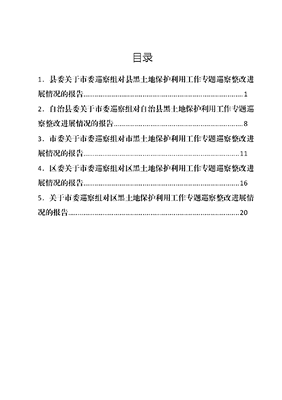 目录1.县委关于市委巡察组对县黑土地保护利用工作专题巡察整改进展情况的报告..12.自治县委关于市委巡察组对自治县黑土地保护利用工作专题巡察整改进展情况的报告.83.市委关于市委巡察组对市黑土地保护利用工作专题巡察整改进展情况的报告114.区委关于市委巡察组对区黑土地保护利用工作专题巡察整改进展情况的报告165.关于市委巡察组对区黑土地保护利用工作专题巡察整改进展情况的报告..20县委关于市委巡察组对县黑土地保护利用工作专题巡察整改进展情况的报告一、关于学习贯彻XXXXXX重要讲话重要指示精神不够深入方面问题的整改情况针对组织学习不够到位的问题。一是组织召开党(工)委专题会议、专题民主生活会及利用党委会前半小时开展集中学习;制定印发培训计划和专题学习重点内容安排,村级党组织制定学习计划,以召开村两委会议的形式开展学习。二是开展提醒谈话,指出村党支部在开展学习活动中存在的问题,要求规范开展三会一课活动,通过及时记录会议记录、建立会议记录档案、定期复核会议记录等方式,规范会议记录管理体系,坚决杜绝形式主义。三是将黑土地保护与利用、X模式等内容纳入干部教育培训计划,抓好各级各类干部的专业化培训,提高干部黑土地保护利用的专业化能力水平;各党组织已全部制定学习计划将4+2X模式升级版,X模式3+1示范推广体系等内容纳入党支部年度学习计划;抽调骨干技术力量组建黑土地及X模式知识培训小组,对各乡镇(街道)开展培训活动。针对宣传引导不够到位问题。一是传统媒体和新媒体同发力,为黑土地保护利用营造强大的舆论氛围。在电视台新闻频道开设《黑土地保护利用文可居文库——海量学习资料,手机电脑均可下载www.wenkeju.com好处多多》专栏,联系县农业专家、农业大户等专业人士,对黑土地相关知识、政策进行解读;利用转乡XAPP发布有关黑土地保护相关内容,X融媒抖音号智慧X发布黑土地保护视频,扩大黑土地保护利用的知晓率与覆盖面。二是开展黑土地保护宣传工作,发放传单,根据实际情况制作条幅,悬挂在醒目位置。利用新媒体公众号发布黑土地保护利用法律法规政策解读等消息通过微信转发等方式进行宣传;组织培训班专题学习《中国黑土地保护法》《保护黑土地筑牢大粮仓》《X模式推广》等内容,为全县黑土地保护利用打下坚实基础。三是召开耕地保护工作会,要求严格执行田长巡田制度,加大黑土地管护力度,对违法违规乱占耕地问题早发现早制止严查处,坚决制止耕地非农化,防止耕地非粮化,对破坏黑土地等违法行为予以严厉处罚,牢牢守住我县耕地保护红线。针对谋划落实不够到位问题。一是制定X县黑土地保护领导小组成员单位职责清单,明确了各成员单位工作职责。二是召开黑土地保护工作领导小组会议,研究黑土地保护利用相关工作事宜。二、关于推动黑土地保护利用重点任务落实存在差距方面问题的整改情况针对黑土地保护工作推进不够有力问题。一是开展X模式技术培训会议,成立技术指导小组,按照不同区域和不同的农时文可居文库——海量学习资料,手机电脑均可下载www.wenkeju.com季节对各乡镇(街道)进行黑土地保护技术指导和培训;对15个乡镇(街道)开展保护性耕作技术现场会,制定《2023年X县黑土地保护性耕作实施方案》,完善黑土地保护性耕作验收等程序。二是函告事涉乡镇、部门督促当事人办理手续;涉及法律部门裁定的,按照裁定内容依法执行;需政府组织执行的,已报请政府组织实施。三是印发《农药包装废弃回收工作方案》,明确各部门及乡镇职责,推动了全县农药包装废弃物回收处置工作有序开展;在各乡镇设立农药包装废弃物回收点,组织技术人员对农药包装废弃物回收工作进行系统培训与宣传,确保农药包装废弃物得到有效回收;强化农药包装废弃物回收工作的监管,加大农药包装废弃物回收工作力度,保障回收处置资金到位。针对