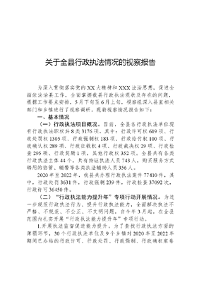 关于全县行政执法情况的视察报告为深入贯彻落实党的XX大精神和XXX法治思想,促进全面依法治县工作,全面掌握我县行政执法现状及存在的问题,根据工作要点安排,5月下旬至6月上旬,视察组深入县直相关部门和乡镇进行了视察调研。现将视察情况报告如下:一、基本情况(一)行政执法项目概况。目前,全县各行政执法单位现有行政执法职权共8类3176项。其中:行政许可权619项、行政处罚权1305项、行政强制权183项、行政给付权100项、行政确认权289项、行政征收权4项、行政裁决权29项、行政检查295项、行政奖励1项,其他行政权352项。全县共有各类行政执法主体44个,共有持证执法人员743人,购买服务方式聘用的协管、辅警等各类执法辅助人员356人。2020年至2022年,我县共办理行政执法案件77410件,其中,行政处罚3631件,行政强制239件,行政检查37092次,行政许可36450件。(二)行政执法能力提升年专项行动开展情况。为进一步规范行政执法行为、提升行政执法能力,全面解决执法不严格、不规范、不公正、不文明问题,自今年3月起,在全县范围内扎实开展行政执法能力提升年专项行动。1.开展执法监督促进能力提升。为了查找行政执法方面的薄弱环节,30个行政执法单位及9个乡镇对2020年至2022年期间已办结的行政许可、行政处罚、行政强制、行政确权案卷进行了自查,共自查了1316件案件;县司法局随机抽查了83本卷宗进行集中评查,发现3个方面15大类问题399个,下发了19份行政执法监督建议书,办结2件行政执法监督案件,移送问题线索2条,立案调查2件。2.加强学习培训促进能力提升。今年5月,组织30个执法单位的法制股室负责人、执法骨干共115人开展全县行政执法能力提升培训,邀请相关专家进行讲座,进一步增强执法人员的业务素质和执法水平,使执法人员在执法过程中的证据意识、程序意识、风险防范意识得到提升,达到了预期目的,取得了明显成效。3.强化三项制度促进能力提升。严格落实行政执法公示制度,在县门户网站开辟了行政执法信息公示专栏,并要求执法单位及时更新公示内容,特别是行政执法事项行政执法人员信息等内容发生变化后,应于3个工作日内进行调整公示;规范重大执法决定法制审核制度,各执法单位制定完善了《法制审核目录清单》;持续推进行政执法全过程记录制度,各执法单位目前正在推进研究制定或统一使用上级主管机关制定的执法文书制作指引。二、存在的问题(一)因行政执法引起的信访问题较为突出。2020年至2023年5月,通过智慧信访信息系统共登记涉及我县行政执法导致的信访事项387件,占信访总量13.67%。从具体诉求看,因行政执法引起的信访问题主要集中在城管执法类(52件,占13.44%),公安户籍管理(14件,占%3.62)、警务执法(65件,占16.8%)、机动车和驾驶员管理及交通执法(10件,占2.58%),林业砍伐审批及执法(10件,占2.58%),自规建房审批(10件,占2.58%)、举报违法占地查处(10件,占2.58%),市场监管执法(14件,占3.62%)等方面。从以上数据可以看出,因行政执法引起的信访问题不仅数量较大,而且涉及部门较多,少数因行政执法引起的信访问题导致信访人文可居文库——海量学习资料,手机电脑均可下载www.wenkeju.com长期越级上访,影响了全县的信访秩序。(二)行政执法不够规范,行政执法能力有待提高。通过查看卷宗等方式,发现我县行政执法中还存在不规范的问题,主要表现在以下几个方面:一是存在着事实不清、证据不足的情况。2020年至2022年经县人民政府行政复议决定撤销和确认违法的29件案件中,存在事实不清、证据不足的有23件,占79%。二是存在程序违法的问题,行政执法过程中存在着重实体轻程序的现象,比如:在行政确权案件中,法律规定应当先行调解,调解不成的情况下才能裁决,但有的行政执法单位没有经过调解程序直接裁决。2020年至2022年经县人民政府行政复议决定撤销和确认违法的29件案件中,存在程序违法问题的有7件,占24%。三是存在着适用法律错误的情况。主要表现为:应当适用此法的适用了彼法,或者是没有适用到具体的法律条款,有的甚至把法律名称上面想当然加上管理二字,导致法律适用错误。2020年至2022年经县人民政府行政复议决定撤销和确认违法的29件案件中,存在适用法律依据错误的有6件,占20%。四是案卷归档不规范。部分案卷未装订、顺序混乱、无卷宗目录、编码错误、案卷目录标注与内容不符,卷宗封面不规范,无案宗号或无内容等问题。(三)执法主体职责不明,影响执法效能。在行政执法过程中,因为法律修改、职责转移或因职能职责下放而导致部门与部门之间、部门与乡镇之间职责不明的问题。一是农业部门与自然资源规划部