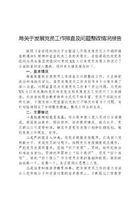 局关于发展党员工作排查及问题整改情况报告按照《省委组织部关于全面深入开展发展党员工作调研排查的通知》精神和省直机关工委相关要求,省能源局机关党委组织全局各基层党组织对党的XX大以来党员发展工作进行了全面排查和深入整改。现将有关情况报告如下。一、基本情况局高度重视发展党员工作排查及问题整改工作,从坚持把政治标准放在首位、落实发展党员工作责任等9个方面开展了深入自查,对照省直机关发展党员工作8个突出问题,对党的XX大以来发展的党员和各党支部发展党员工作进行了全面排查,共排查梳理出教育培养方式还不够丰富、党务干部能力有所欠缺、个别支部入党宣誓仪式执行不够及时等3个问题,有针对性地制定了9项整改措施,整改工作全部完成。二、主要做法一是统筹规划党员发展。对全局申请入党人员进行全面摸底,根据政治素养、理论修养、培养教育情况、能力水平、党员群众认可度等标准,制定年度党员发展计划和长期规划,做到发展工作规范、有序。二是严把党员入口关。局党委根据发展程序,在选拔入党积极分子、发展党员的过程中,按照党员发展制度规范操作,严把党员发展质量关,坚持四不发展。同时,始终把政治标准放在首位,坚持把牢固树立四个意识、坚定四个自信、做到四个服从作为党员发展的基础和前提,做到政治成熟一个,发展一个,真正做到从思想上入党。三是注重积极分子教育培养。把发展党员工作的着力点放在入党积极分子和发展对象的培养教育上,不断强化日常教育管理。认真组织学习党中央各项决策部署,学习党章、党史,学习党的基本理论、基本路线和方针政策,组织参加省直机关工委的各项培训。四是确保党员发展质量。在入党材料方面进行严格审查,对培养表、审查材料、入党志愿书等文字材料书写不规范、甚至涂改过多的部分坚决退回重写,并按照相关要求认真管理发展党员档案。在入党程序方面坚持四个严格,把好发展党员关。严格支部大会讨论,在到会党员充分行使民主权利、发表意见的基础上作出是否发展的决议;严格党委审批。在党委审批之前,指派专人对入党志愿书和有关材料进行审查,广泛听取党内外群众的意见,同申请人进行谈话,进行深入考察,并通过党委会审议和表决;严格预备党员转正。严格预备党员考察制度,慎重对待;严格发展党员公示,对于每一名新发展党员都做到公示在前,广泛征求意见,确保发展质量。五是严肃党员发展纪律。将严肃发展党员工作纪律作为落实全面从严治党工作的重要内容,进行安排部署。建立定期检查制度,对基层党组织落实发展党员工作纪律情况进行检查,严禁在发展党员工作中出现请客送礼、托人说情、营私舞弊等违规违纪行为,杜绝弄虚作假、带病入党、近亲繁殖、人情党员等。六是落实发展党员工作责任。局党委高度重视发展党员工作,把发展党员工作作为党建工作的基础工作来抓。不断健全发展程序,下发电子版发展流程表,对培养、教育、考察、发展、转正等各个环节提出了要求,构建了党委、支部齐抓共管的工作格局,使发展工作规范化。三、整改情况(一)教育培养方式还不够丰富问题整改情况一是注重活动引导。坚持把党员日常活动作为入党积极分子教育培训的重要载体,以支部三会一课为依托,帮助发展对象提高政治思想建设水平。二是发挥新时代e支部在文可居文库——海量学习资料,手机电脑均可下载www.wenkeju.com教育管理方面的作用,组织入党积极分子认真学习贯彻XXX新时代中国特色社会主义思想和党的十九大精神,积极参加支部创星、主题党日等实践活动,在活动中不断得到提升。(二)党务干部能力有所欠缺问题整改情况一是在选人用人上坚持党管干部原则,坚持德才兼备、以德为先,用好干部标准指导实践,选好配强党务干部队伍。二是不断开展业务培训。局党委要通过集中轮训、小组讨论和参观学习等多种方式,组织党务干部深入学习党的基础理论知识特别是发展党员的业务知识。各党支部要抓好党务干部的日常学习教育工作,开展多种形式的学习活动。三是开展业务交流。组织全局党务干部进行业务交流,为新党务干部提供学习交流机会,避免出现发展党员工作弱化、业务不够熟练等问题。(三)党员入党宣誓仪式执行不够及时问题整改情况一是明确发展程序。组织各党支部书记和党务工作者认真学习发展党员5个阶段、25个程序,并要求各党支部要严格按照规定动作,不打折扣履行发展程序。二是强化监督检查。对党的XX大以来所有发展党员入党宣誓情况进行了排查,对宣誓仪式执行不及时的进行了批评教育,对宣誓仪式不够规范的要求重新组织宣誓。三是完善相关制度。建立了党委参加宣誓仪式制度,由局党委指派工作人员全程参加指导党支部的入党宣誓仪式,督促各党支部严肃认真执行入党宣誓仪式。下一步,局将以此次排查整改为契机,认真学习贯彻XXX新时代中国特色社会主义思想和党的XX大精神,全面落实新时代党的建设总要求,严格规范执行发展党员工作程序,努力打造高素