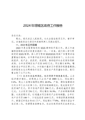2024年增城区政府工作报告各位代表:现在,我代表区人民政府,向大会报告政府工作,请予审议,并请政协各位委员和其他列席人员提出意见。一、2023年工作回顾2023年是全面贯彻党的XXX精神的开局之年,是三年疫情防控转段后经济恢复发展的一年。一年来,我们深入学习贯彻党的XXX精神,深入学习贯彻XXXXXX视察广东重要讲话重要指示精神,在市委市政府和区委的坚强领导下,全力以赴抓经济、抓产业、抓投资、抓招商,推动经济社会发展取得新成效。全年实现地区生产总值1452亿元,同比增长8.5%,增速排名全市各区第二位,乡村振兴重点工作获国务院督查激励,获评国家生态文明建设示范区、国家农产品质量安全县。我们重点做了以下工作:(一)全力加强监测调度,经济保持平稳健康发展。工业经济稳步增长。实现规上工业总产值1883亿元、同比增长9.4%,规上工业增加值同比增长10.9%,产值、增加值增速均位列全市工业六区第二位。投资结构持续优化。完成固定资产投资817亿元,其中房地产投资296亿元,基础设施投资222亿元,工业投资256亿元,同比增长56.9%。产业结构持续调整。大抓招商引资,引进重点项目推动产业结构调整,全年引进产业项目180个、计划总投资1195亿元。市场活跃度持续提升。新登记市场主体6.1万户,同比增长77.8%,增速位居全市各区第二位。资源要素保障有力。依法依规用好用足各类资金,保障重大项目有序推进。完成征地1.2万亩、拆迁51万平方米。(二)扎实推动东部中心规划建设,重大发展平台集聚效应凸显。东部中心被赋予现代活力核新广州战略定位、上升为广州三核之一,边规划边建设,形成风风火火的建设局面。新塘枢纽核心区开局起步。引进6个总部经济项目。完成土地整备9796亩。广汕高铁开通运营,增城站、新塘站投入使用,8条周边主要集疏运道路建成通车,增城进入高铁时代。增城开发区提质发展。《广州市增城经济技术开发区条例》正式颁布实施。增城开发区获评全国绿色低碳示范园区。广州东部公铁联运枢纽加快建设。项目一期工程完成征地8100亩,完成率96.8%,二期工程征地1138亩。引进希音、智光、华芯等产业项目。增城西站全年开行国际班列408列,发运量占全市39%、全省33%。广州科教城产教融合扎实推进。累计6所院校入驻办学,入驻师生约4万人。成立广州科教城产教合作联盟,推动科教城职业院校与增芯、越海、广东微技术工业研究院等集成电路龙头企业合作,探索集成电路创新人才、高级技能人才培养模式,推动产教融合、科教融汇。 (三)激活改革开放创新动力活力,发展新动能进一步增强。重点领域改革蹄疾步稳。推广带方案出让多证齐发等创新举措,提升企业筹建效率。推进国家城乡融合发展试验区六项改革,颁发全省首宗农村土地经营权不动产权证书。外贸平稳发展。实现商品进出口总值1053亿元,同比增长110%,增速位居全市各区第一位。科技创新取得新成效。高企总量达885家,同比增长20.4%。科技型中小企业总量达1476家,同比增长47.8%,增速排名全市各区第一位。研发投入强度达到3%,跨入全市第二梯队。侨梦苑新认定9家分园区。全区新增2家国家级孵化器、7家国家级专精特新小巨人企业。(四)扎实推进百千万工程,城乡融合发展取得新成效。现代农业产业提档升级。完成农林牧渔业总产值124亿元,同比增长4.7%。增城区现代农业产业园入选2023年国家现代文可居文库——海量学习资料,手机电脑均可下载www.wenkeju.com农业产业园创建名单。仙进奉荔枝作为全国唯一荔枝类品种入选2023年农业主导品种。广东增城丝苗米文化系统入选第七批中国重要农业文化遗产。增城区在全省田长制先行县综合评价中排名第一位。联镇带村功能不断提升。新塘镇、石滩镇、中新镇上榜2023年全国千强镇,增城区、新塘镇及12个村入选省百千万工程首批典型县镇村。石滩镇全域土地综合整治试点加快推进。和美乡村加快建设。累计创建262个省定美丽宜居村、110个市级美丽乡村、67个特色精品村。新建和改造农村公路39公里。增江街大埔围村入选第三批全国乡村治理示范村,派潭镇上九陂村荣获2023年中国美丽休闲乡村称号。共同富裕稳步推进。城镇居民人均可支配收入6.4万元,农村居民人均可支配收入超3.6万元,城乡居民收入比进一步缩小为1.77:1。扎实做好东西部协作、对口帮扶等工作。(五)加强城乡规划建设管理,城乡功能品质不断提升。城市综合服务功能不断完善。广汕路北绕线等14条道路建成通车。增天高速、惠增高速、广深高速改扩建等项目加快建设。累计完成海绵城市建设达标面积60平方公里。新建燃气管道72公里、5G基站1209个。完成51个自然村农污治理示范样板村建设。增江画廊水利风景区入选国家水利风景区