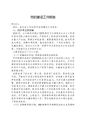 党的建设工作报告同志们:现在,我代表公司D委作D的建设工作报告。一、2023年工作回顾2023年,公司D委坚持以XXX新时代中国特色社会主义思想和D的XX大精神为指导,严格落实上级D委决策部署,坚持全面从严治D,聚精会神抓D建,强根固魂促发展,D的思想政治建设、保障作用发挥、基层组织建设、干部队伍建设、D风廉政建设、宣传文化引领、群团作用发挥等各项工作成效显著,为圆满完成全年目标任务。主要表现在以下几个方面:(一)把握政治方向,D的政治建设全面加强牢牢把握坚决维护XXXXXX在D中央和全D的核心地位、坚决维护D中央权威和集中统一领导这个根本政治责任,牢牢把握坚持和加强D的全面领导这个根本原则,坚持D对国有企业的领导不动摇,坚持服务生产经营不偏离,全面推进D建工作高质量发展。发挥D委把方向、管大局、保落实的作用。坚持民主集中制,严格执行D委议事规则和决策程序,坚持重大事项D委研究前置,全年组织召开公司D委会xx次,对涉及重大战略调整、重要内部改革、机构设置调整等xx项重大事项,都经过公司D委会讨论,确保集团公司重大决策部署在公司落地。落实双重组织生活制度,D委委员编入不同的基层D支部、D小组,以普通D员的身份参加所在支部组织生活,参加基层支部安全活动、学习座谈、主题D日,坚持每季度到分管领域各D支部指导D建和D风廉政建设工作,更好地接受D内外群众监督,了解基层情况。(二)坚持新思想引领,XXX新时代中国特色社会主义思想和XX大精神全面落地把推进XXX新时代中国特色社会主义思想和XX大精神学习宣贯作为首要政治任务,邀请xx教授讲授《中国共产D光辉历程》。开展新时代新使命新担当主题D日活动,各基层D支部灵活创新地开展了集中学习、集中研讨、专题D课、重温入D誓词、撰写初心故事、谈心谈话、义务劳动等丰富多彩的活动。开展社会主义是干出来的岗位建功行动的部署要求,下发了《关于开展社会主义是干出来的岗位建功行动实施方案的通知》,以实现全覆盖的五步法,全面启动了社会主义是干出来的岗位建功行动,微信公众号发布x期大国顶梁柱宣讲,并开设了道德大讲堂《我们身边的顶梁柱宣讲》,将学习教育延伸到基层、覆盖到全体D员,引领D员干部建功新时代、创造新业绩。(三)三基建设稳步推进,基层组织力全面提升对组织建设、D员管理、D费收缴、D支部三会一课等基本制度的落实进行自查整改,对三会一课记录不规范、发展D员工作中谈心谈话制度落实不好、思想动态分析笼统空泛、D小组设置不合理、D费收缴记录不规范等不足进行了全面的整改,各项基础工作不断规范完善,各基层支部都能按照主要业务工作、D群团青工作、廉政建设、职工思想动态情况、下季度工作计划、工作建议六大板块完成季度汇报材料。按照程序对退休D组织机构进行了调整,成立离退办D总支,下设四个D支部,确保退休D组织管理职责清晰,退休D员D建工作、退休人员管理服务工作归属明确。遵循四个有利于的原则,对D小组进行全面梳理,共设置调整了xx个D小组,撤销了管理、科办D小组,将全部管理人员、支委成员编入各D小组,督导D小组发挥作用,更加贴近群众。按照三同时原则,机构、人员变动的部门或支部,支委委员同步调整。在支委委员的设置上,引入D员生产骨干、D员班组长、年轻D员担任支委委员,发挥民主决策与民主监督,凝聚基层力量。加大生产经营一线、青年骨干中发展D员比例,2023年共发展D员8名,其中一线职工7名。(四)廉政建设力度不减,两个责任全面履行严抓主体责任落实。坚持D建D廉工作同安排同部署,定期听取纪检监察工作汇报,每季度听取各部门、各支部抓D建D廉工作汇报,支持纪委放心大胆地进行信访举报的核查工作。对新提任职的中层干部开展任前廉政谈话,有针对性地开展廉政提醒和约谈,约谈中层干部及管理人员xx人。加强日常监督检查。开展专项效能监察x项,对提出整改建议xx条,均落实责任予以整改。对落实两个责任进行了联合检查和考评,针对发现的问题,督促有关部门进行整改,对后勤系统采购、副产品市场销售、物资采购流标以及标底保密等重点领域和关键环节加大了监督检查力度,不定期巡查xx余次,抽样检查近xx个,有力震慑了掺假行为,维护了企业利益。二、存在的差距和不足我们基层D建工作仍然存在着一些差距和不足,主要表现在以下几个方面:基层D建工作不平衡,基层组织建设还有薄弱环节;政治理论学习还有差距,学习的系统性、针对性不够,没有做到学深悟透;有的单位D建工作与中心工作结合不紧,两张皮的问题依然存在;D风廉政建设标准不高、要求不严,失之于宽松软,反对四风不坚决、不彻底等等。这些问题在公司也不同程度地存在。我们必须清醒认识,高度重视,认真严肃整改,切实加以解决。三、2024年D建工作安排总体工作思路:以XXX新时