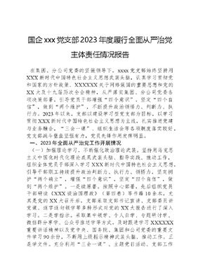 国企xxx党支部2023年度履行全面从严治党主体责任情况报告在集团、分公司党委的坚强领导下,xxxx党支部始终坚持用XXX新时代中国特色社会主义思想武装头脑,认真学习贯彻党和国家的方针政策、XXXXXX关于网络强国的重要思想和党的XX大及十九届历次全会精神,从严落实集团、分公司党委各项决策部署,引导党员干部增强四个意识,坚定四个自信,做到两个维护,不断提升政治领悟力、判断力、执行力。2023年以来,支部以建设学习型党支部为目标,以学习贯彻XXX新时代中国特色社会主义思想为主线,扎实推进党建与业务融合,三会一课、组织生活会等各项制度落实较好,党支部战斗堡垒坚强有力,党员先锋作用发挥明显。一、2023年全面从严治党工作开展情况(一)加强理论学习,不断强化政治理论武装。坚持用马克思主义中国化时代化理论成果武装头脑、指导实践、推动工作,组织全体党员干部深入学习XXX新时代中国特色社会主义思想,引导干部职工持续提升政治判断力、执行力、领悟力,坚定拥护两个确立,增强四个意识,坚定四个自信,做到两个维护。一是读原著。按照中心部署,先后组织党员干部研读《XXX谈治国理政》(第四卷)等书籍10余本,尤其是党的XX大召开后,支部采取支部书记宣讲、支部委员讲党课、逐字逐句领学等多种形式对党的XX大报告进行了深入学习。二是学指示。采取集中领学、个人自学、专题研讨学、微信群分享学、公众号推送学等方式,及时跟进学习XXXXXX重要讲话精神以及党中央、国务院、集团和公司党委的重要文件学习90余份,不断用上级指示精神武装头脑、推动工作。三是学文件。充分利用三会一课、主题党日活动、支部工作交流群等载体,及时组织学习《中国网信杂志》《中国环境信息化》《信息化协同创新专委会》公众号刊发的《XXXXXX指引我国信息化发展纪实》《丁仲礼院士关于我国碳中和框架路线图研究汇编》《关于加强数字政府建设的指导意见》等国家重要文章30篇,以及《纪检监察机关派驻机构工作规则》《十四五环境健康工作规划》《关于加强新时代廉洁文化建设的意见》、集团及公司内部等文件和通知60余份。(二)扎实开展廉政教育,不断强化纪律意识。一是深入开展学习教育。持续提升政治判断力、政治领悟力、政治执行力,进一步增强四个意识,坚定四个自信,做到两个维护,不断强化忠诚核心、拥护核心、跟随核心、捍卫核心的思想自觉、政治自觉和行动自觉,永葆忠诚的政治本色。二是不断强化正向激励。组织党员干部学习XXXXXX关于全面从严治党的重要论述、党的XX大报告等精神。在支部内部开展家庭故事范围分享会,学习革命前辈、时代楷模等家风事迹,引导党员干部树立正确的人生观、价值观、世界观。三是积极开展警示教育。及时传达学习《关于缪旭波严重违纪违法案及其警示教训的通报》、《关于张雯欢严重违纪违法案及其警示教训的通报》等,组织观看《零容忍》《莫拿青春赌明天——张雯欢严重违纪违法案件警示教育专题片》等党风廉政警示教育片,结合岗位实际,开展群众性讨论,不断提高党员干部职工的廉洁意识和增强其拒腐防变的能力;抓好重要时间节点进行廉政教育,及时传达集团及分公司党委关于春节、清明、五一、端午、中秋、国庆期间工作要求,确保节日期间风清气正。(三)严格落实各项制度,不断强化监督作用。一是组织召开组织生活会。按照分公司党委计划,xxxx党支部组织召开2022年度组织生活会,全体党员坚持问题导向,深入查找和解决突出问题,严肃认真的开展批评和自我批评,精神上受到了一次全面洗礼,既相互交流了思想、加深了理解,又增进了团结、凝聚了力量,使队伍精神面貌焕然一新,起到了凝心聚力、提神励志的效果。二是严格落实三会一课制度。采取线上线下会议相结合的方式,认真落实三会一课,2023年xxxx党支部召开支委会议13次,党员大会12次,党课5次。采取参观见学、重温入党誓词、观看录像片等多种形式以学促做,开展主题党日活动12次。2023年发展预备党员1名。三是常态开展谈心谈话,全年开展谈心谈话20余人次,及时了解掌握干部队伍的思想状况,积极做咬耳扯袖的工作,既加强政治引领、又教工作方法,既加强约束管理、又做好关心关爱,广大党员干部职工守正创新、干事创业的积极性、主动性、创造性明显提高。2023年xxxx党支部无人员被通报违纪违规。(四)抓好党建与业务融合,不断强化党建引领。xxxx党支部把党建工作由软指标向硬任务转变、工作由虚向实转变,狠抓党建与业务融合,实现党建引领业务发展。充分发挥党员民主权利,通过党员大会的形式,对重大节日、重大任务、重大活动、重大项目安排进行充分讨论论证。2023年,先后对党建和创、我为群众办实事等工作在党员干部职工中展开了谈论交流,党员干部职工集思广益、献言献策,收到了良好效果,得到了支部